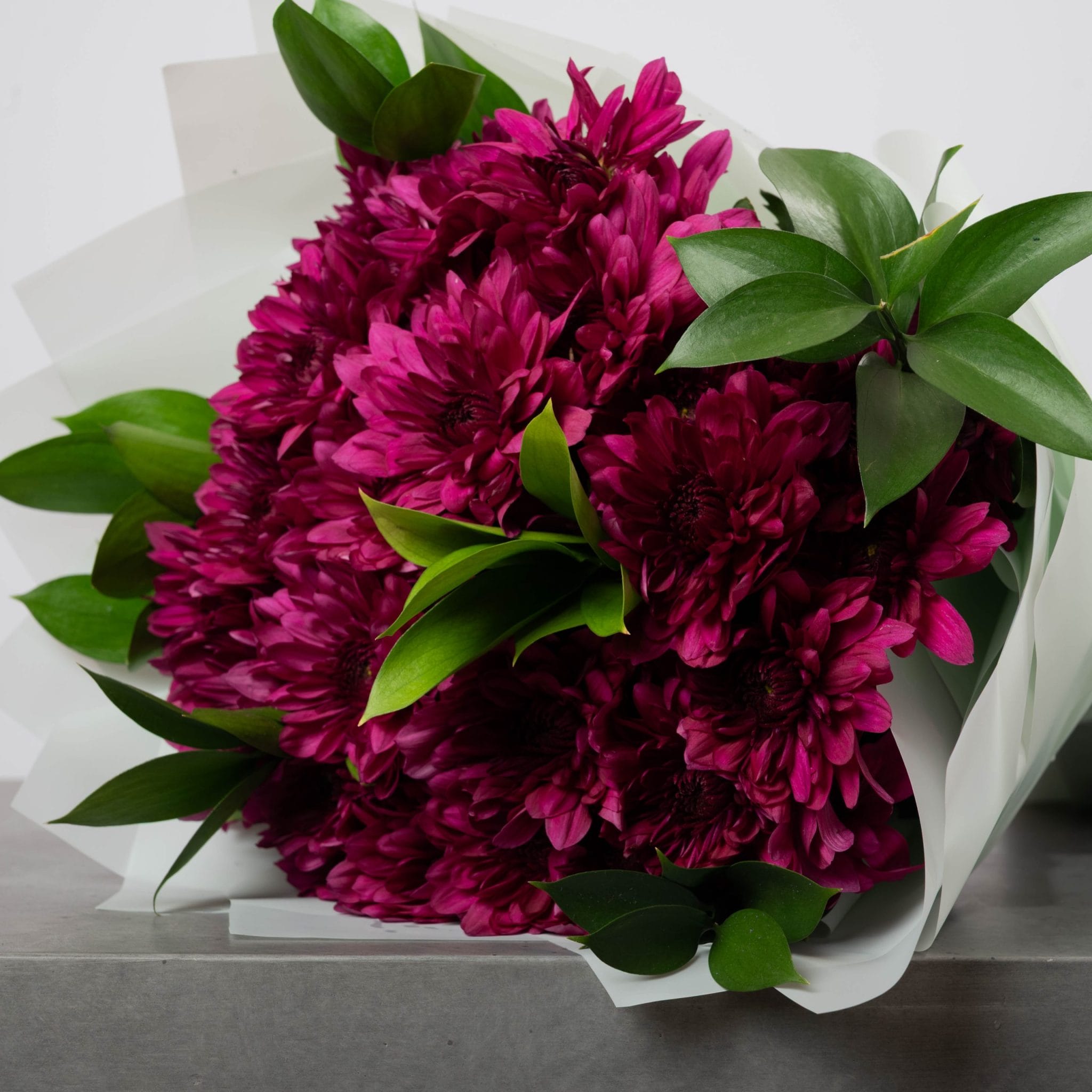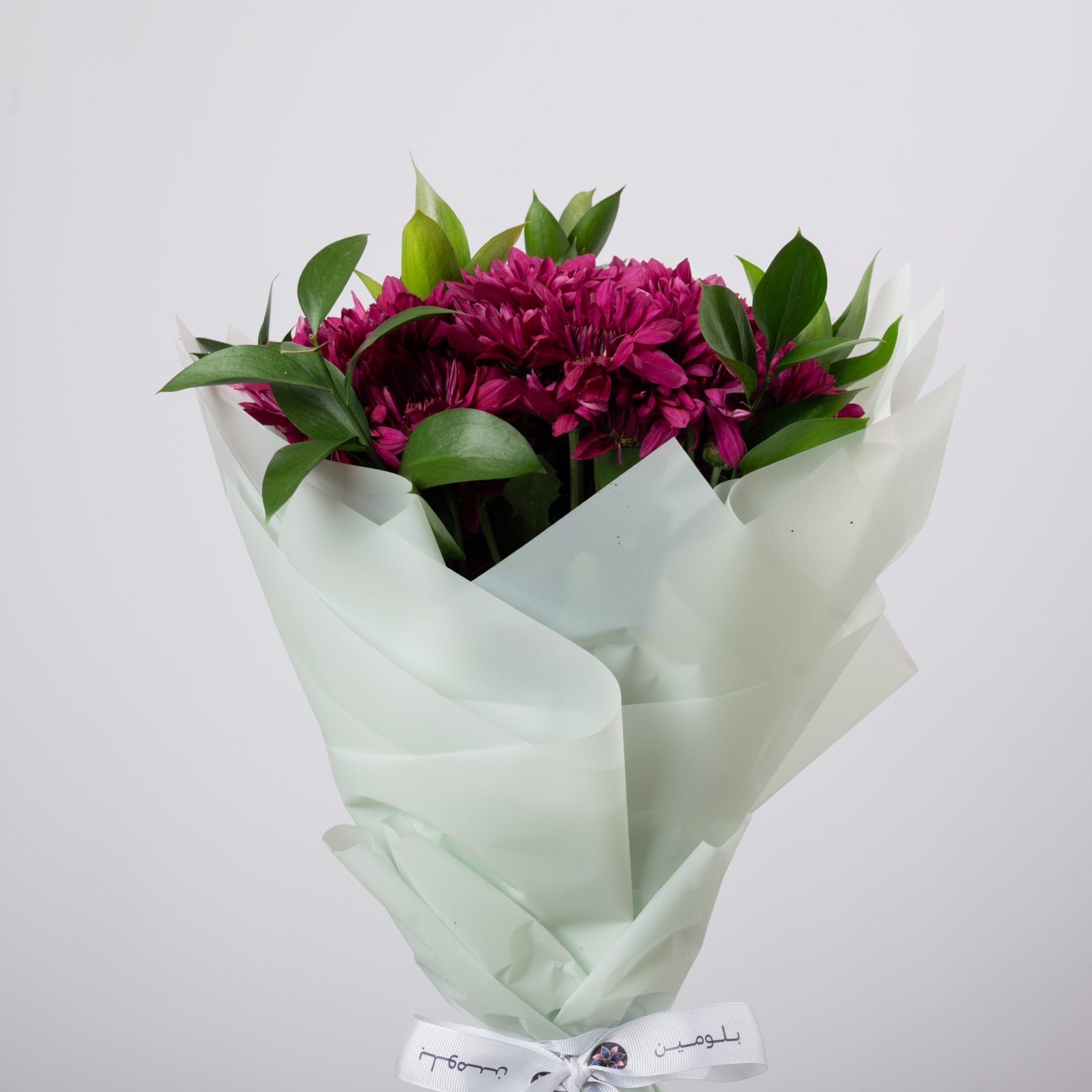 Featuring lush magenta chrysanthemums framed by soft green foliage, “Aleen’s Bloom” captures the quiet power of color. Wrapped in pale mint paper, it’s a stunning statement of poise and individuality.