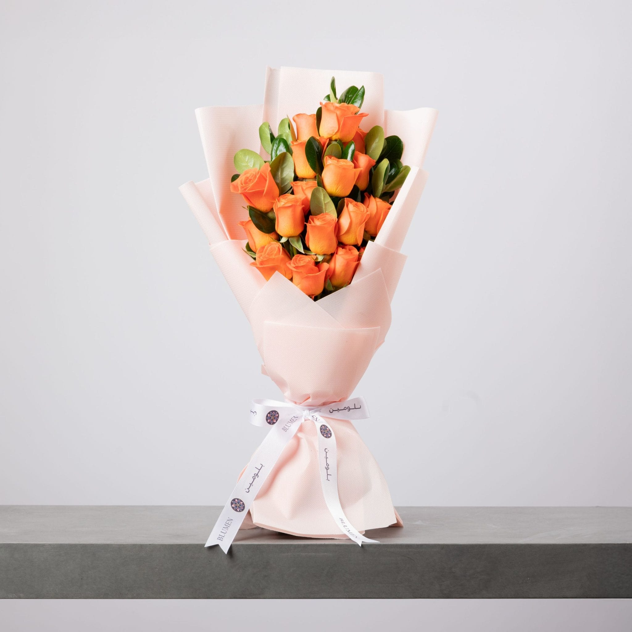 A radiant cluster of orange roses embraced by pale peach wrapping. Vibrant yet soft, this bouquet speaks of passion, creativity, and the courage to shine unapologetically.