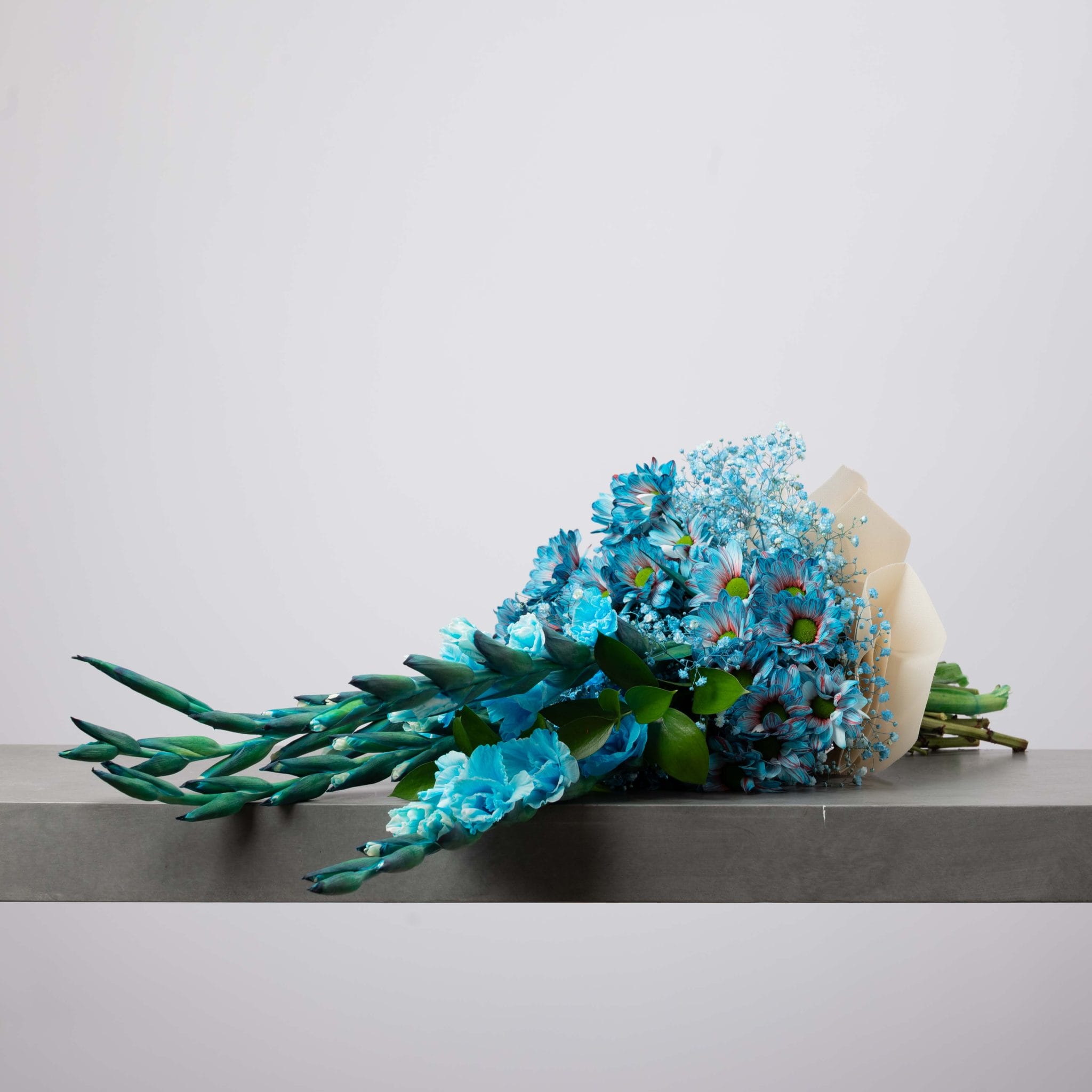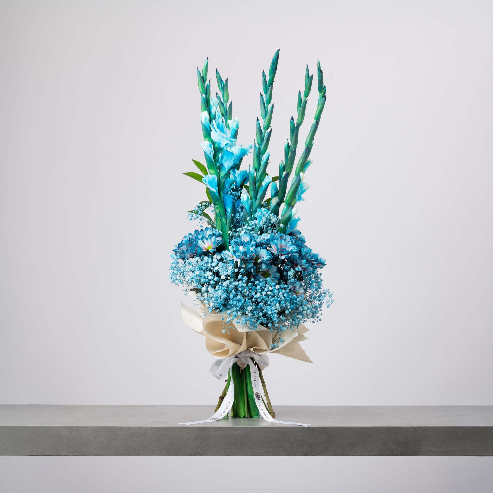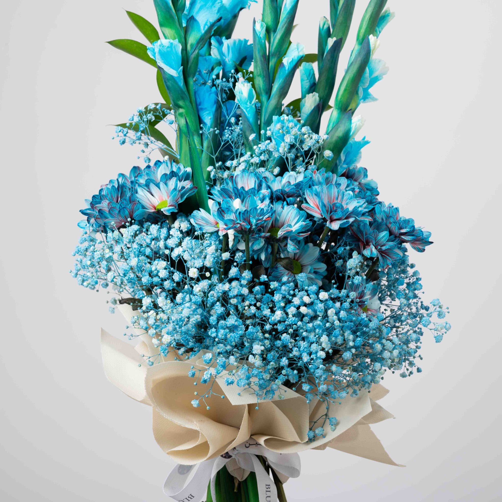 Blue Reverie embodies serenity in its purest form. Layers of blue gladiolus, chrysanthemums, and delicate baby’s breath rise in a vertical flow that evokes calm and balance. Wrapped in soft ivory paper and tied with a white satin ribbon, this bouquet radiates peaceful confidence — a modern tribute to stillness and inner clarity.