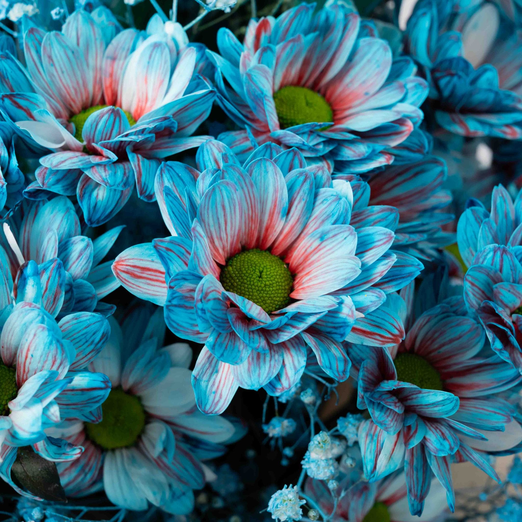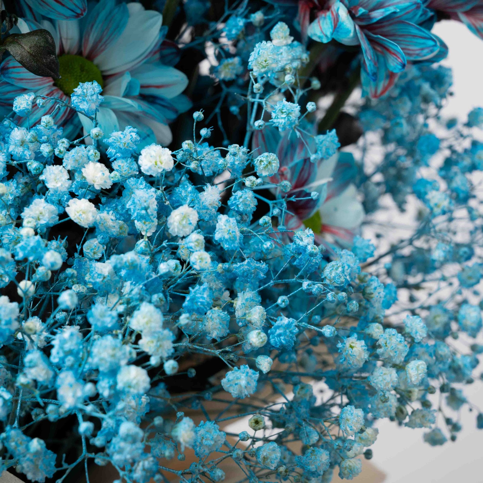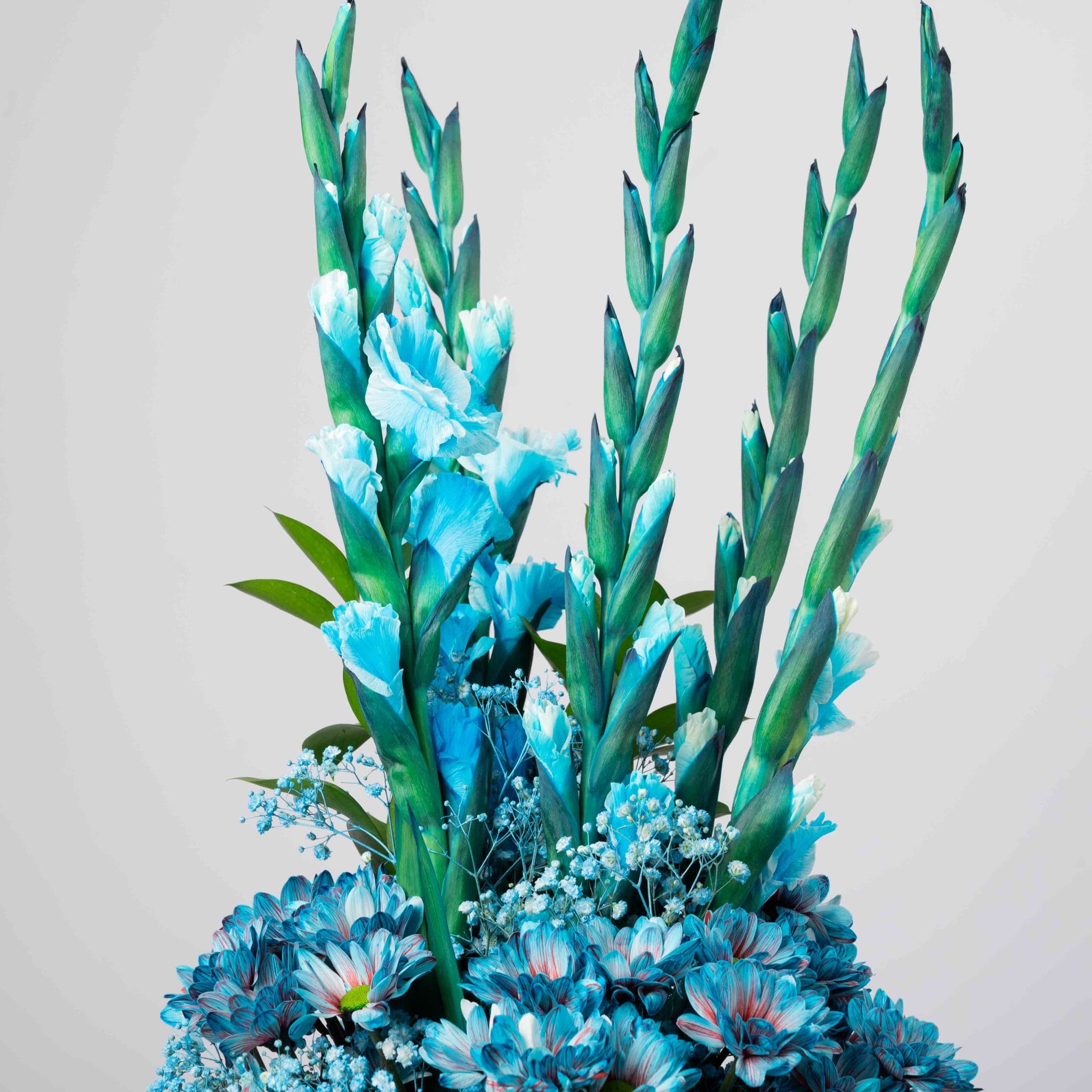 Blue Reverie embodies serenity in its purest form. Layers of blue gladiolus, chrysanthemums, and delicate baby’s breath rise in a vertical flow that evokes calm and balance. Wrapped in soft ivory paper and tied with a white satin ribbon, this bouquet radiates peaceful confidence — a modern tribute to stillness and inner clarity.