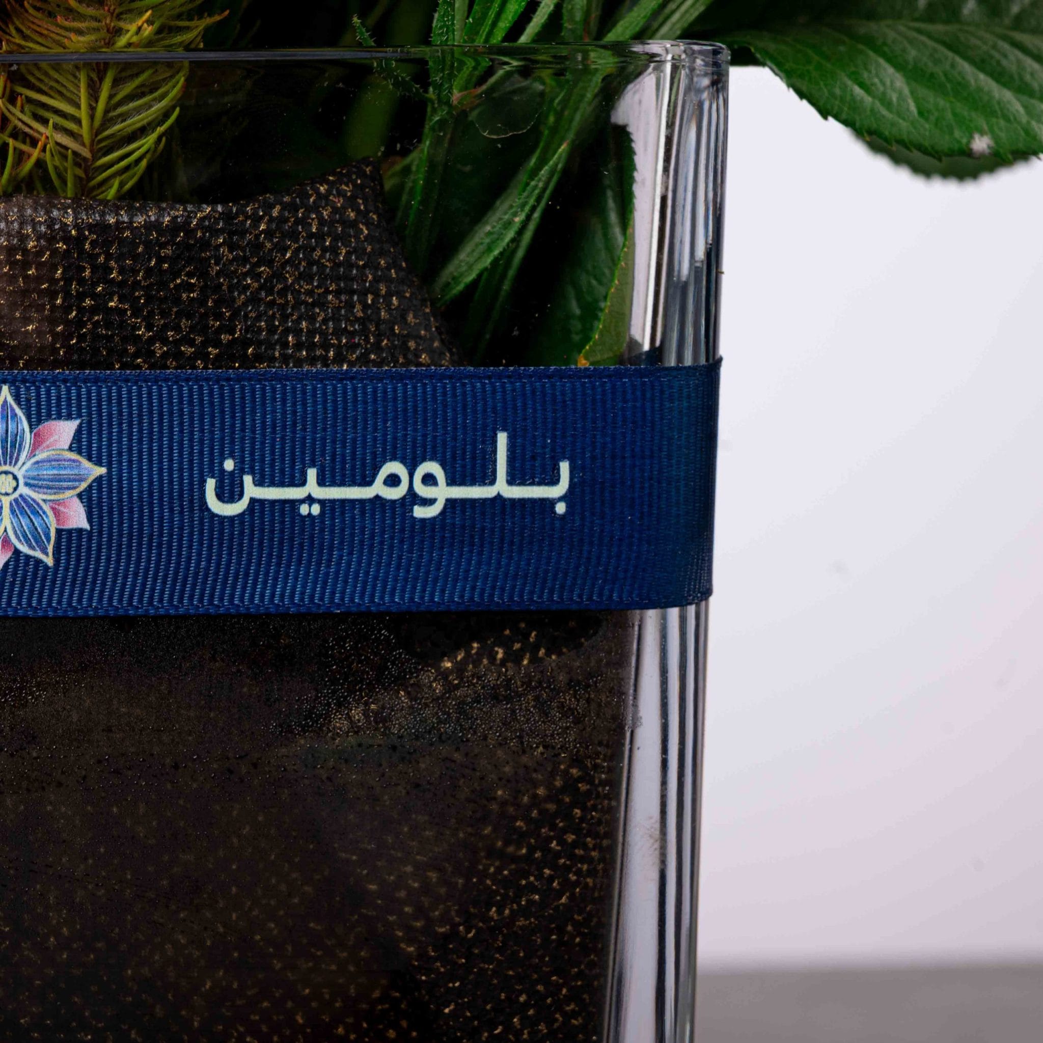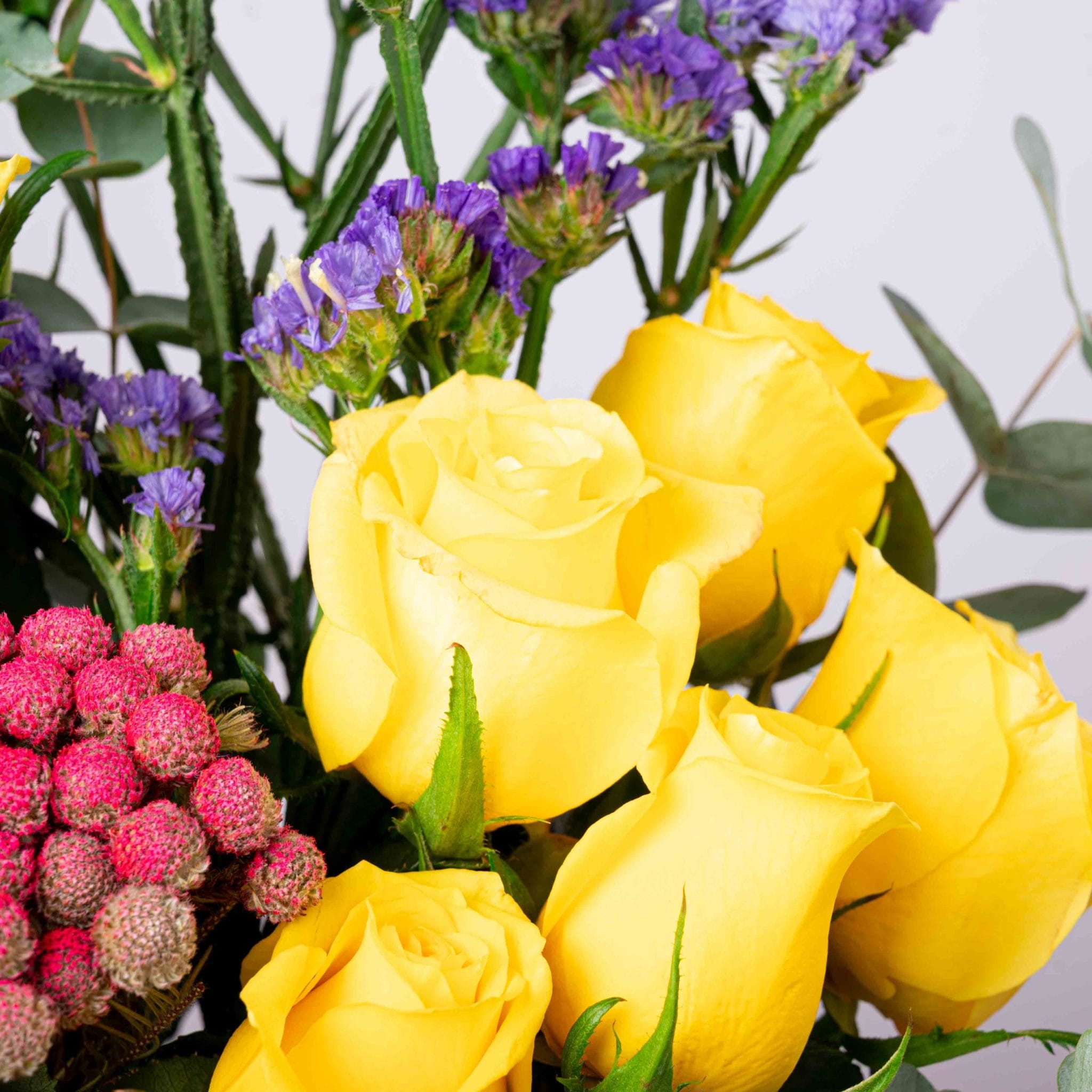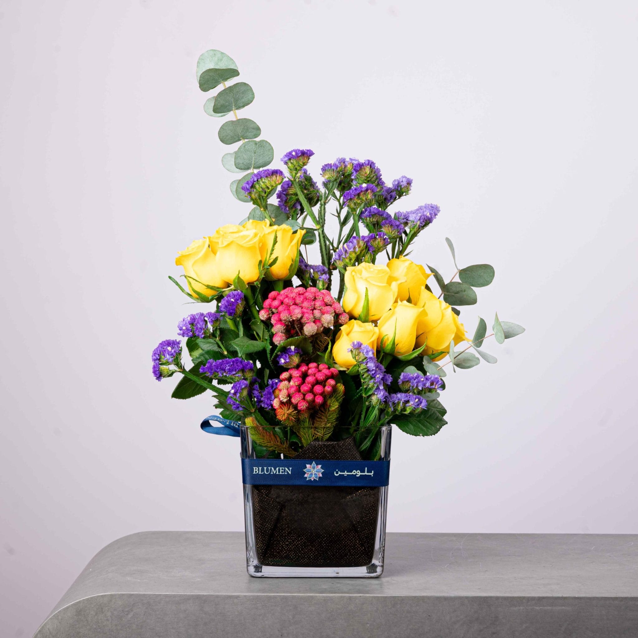A vibrant mix of yellow roses, purple statice, and red berries, elegantly arranged in BLUMEN’s signature square glass vase. The contrast of warm and cool tones creates a joyful, uplifting display that symbolizes happiness and renewal — ideal for birthdays, congratulations, or brightening any day.