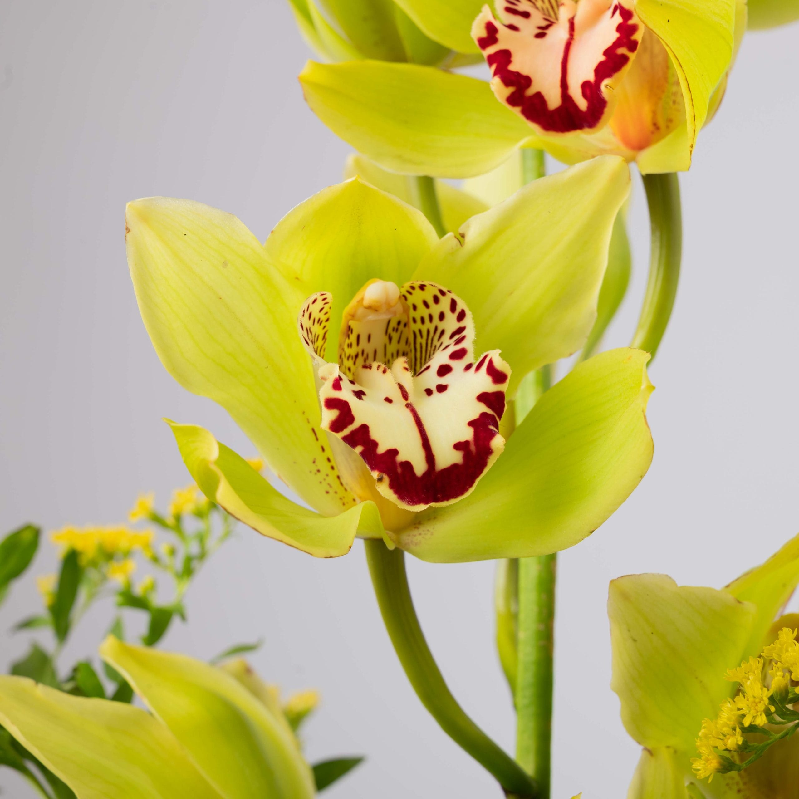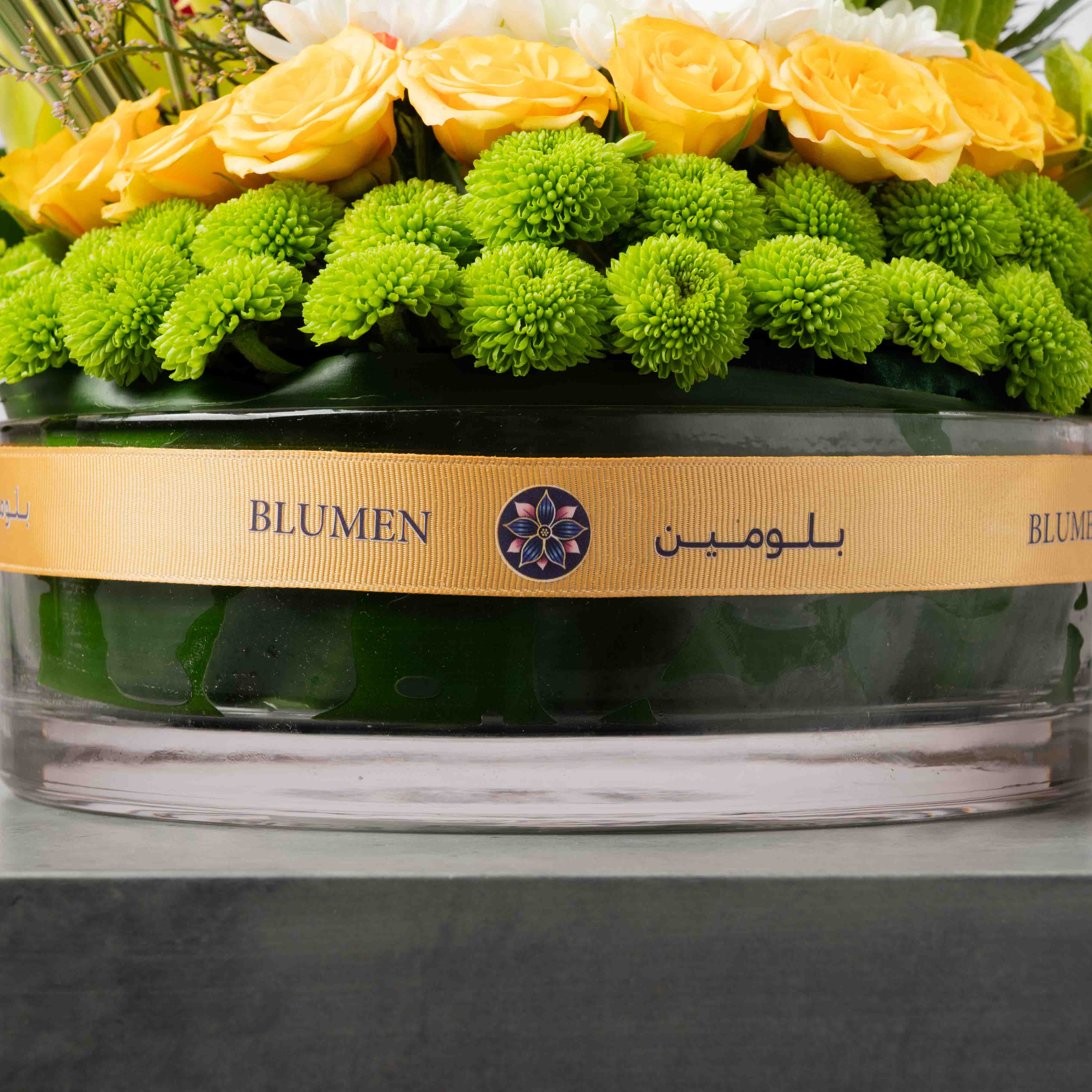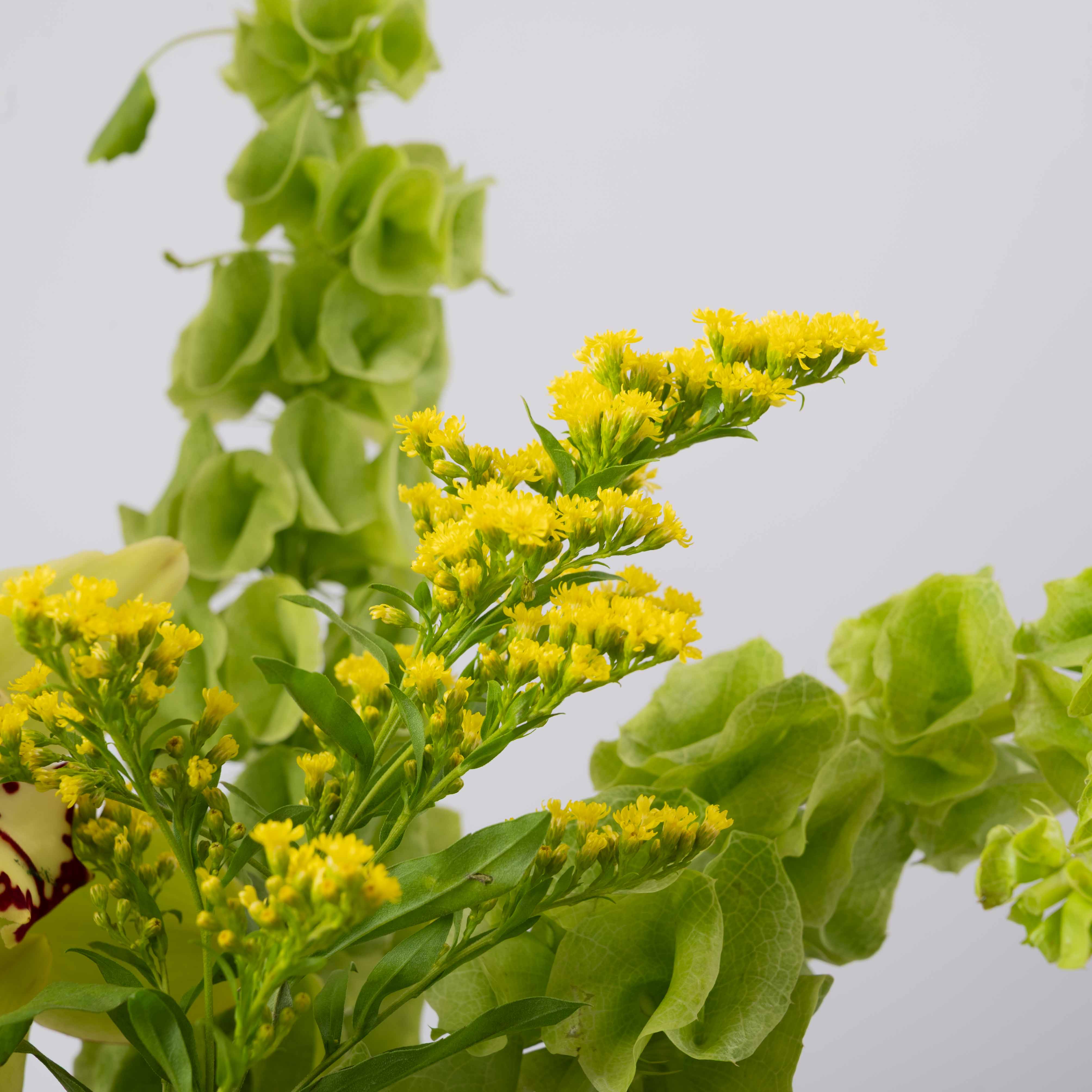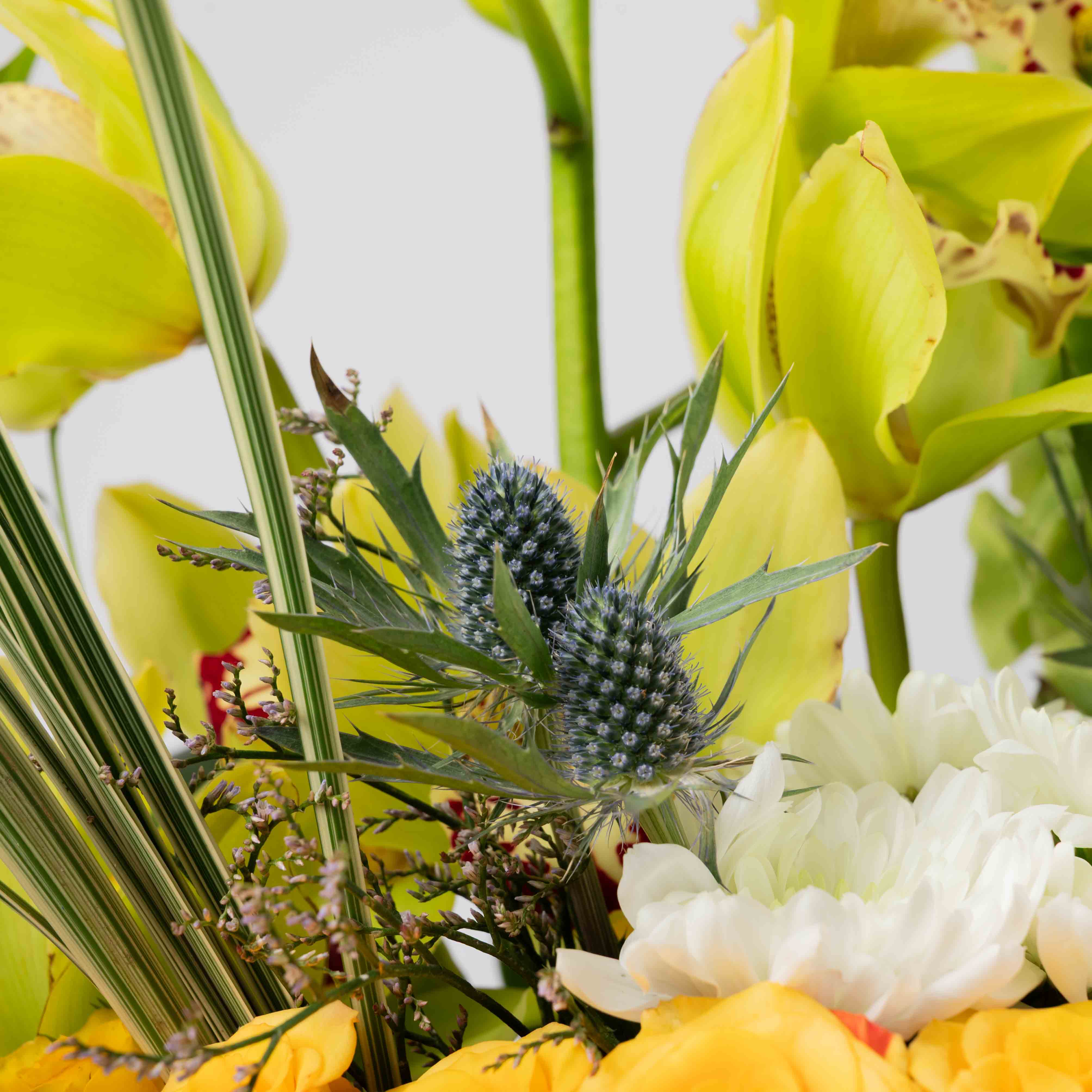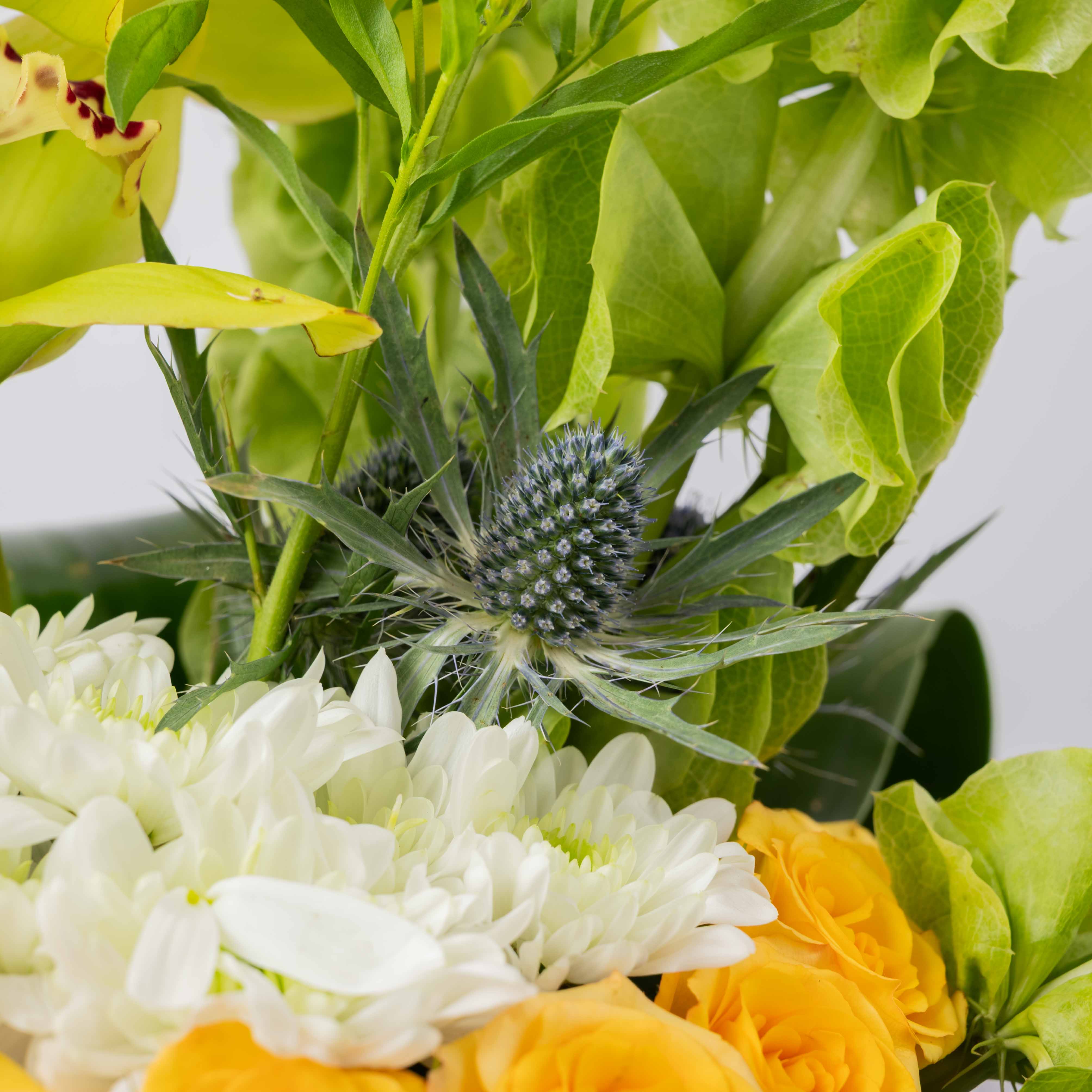 The Citrus Meadow is a fresh burst of sunshine in floral form. A lush collar of green button chrysanthemums and soft yellow roses circles the base, while white blooms and sculptural cymbidium orchids rise above in vivid lime tones. Bells of Ireland and airy foliage add movement and height, giving سيتروس ميدو the feel of a sunlit meadow after the rain. Perfect for brightening living rooms, office spaces, and joyful occasions that call for energy and optimism.