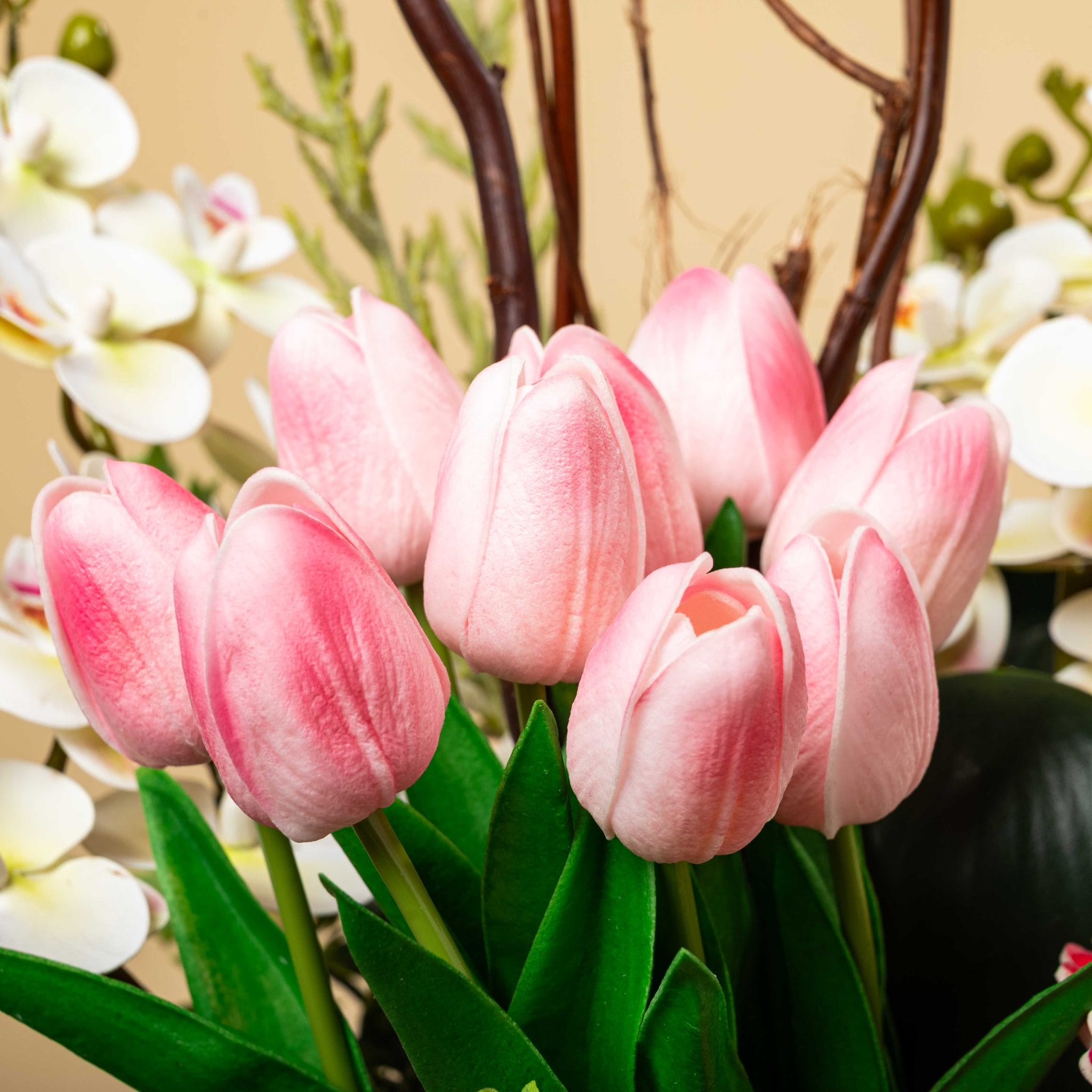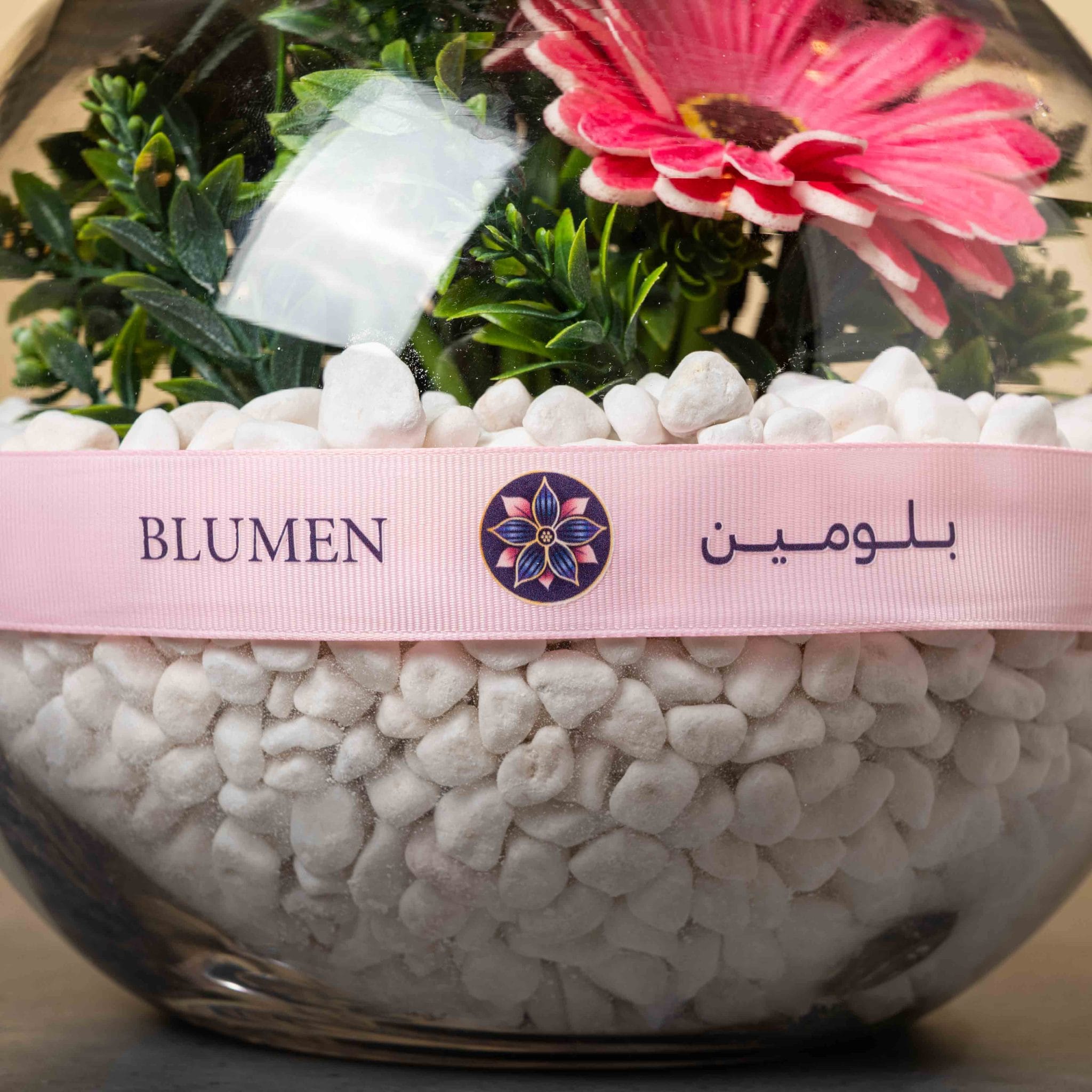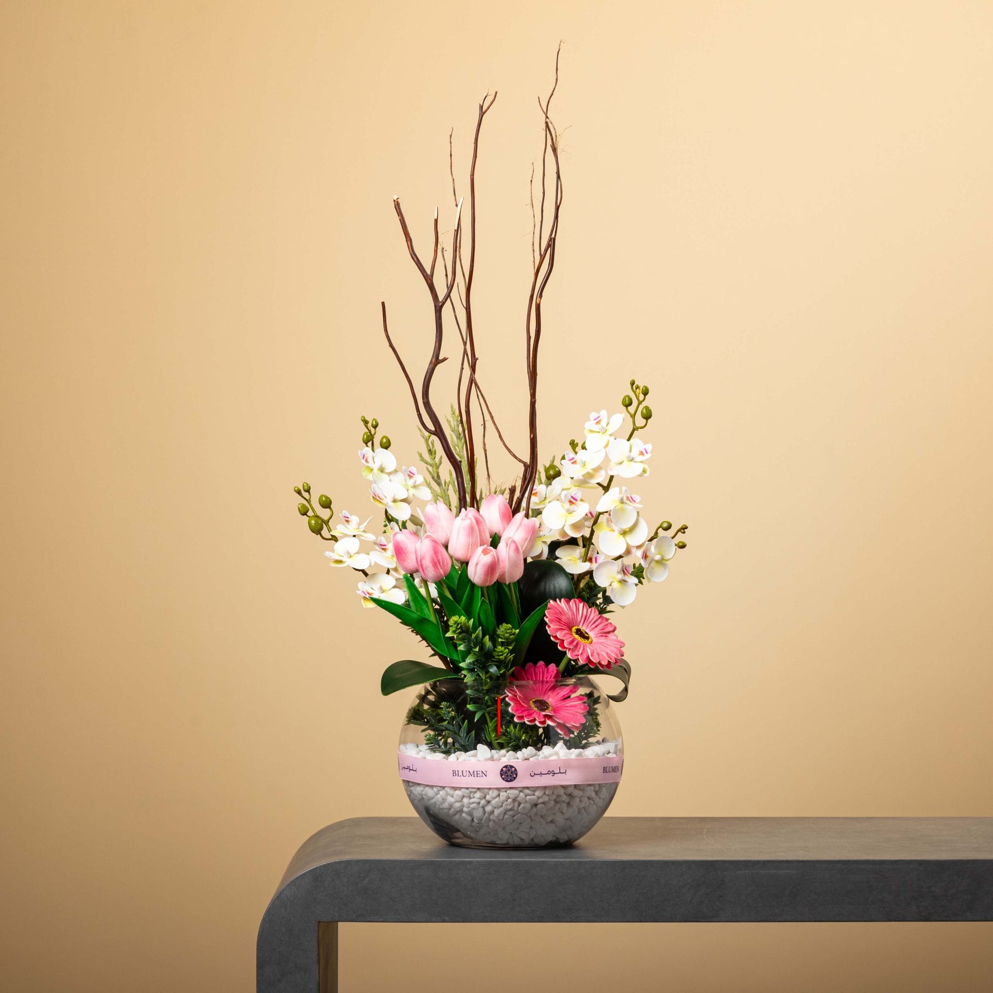 The Enchanted Blossom Globe is a modern statement piece: a round glass vase filled with soft pebbles, holding graceful white orchids, blush pink tulips, and vibrant gerberas rising around sculptural branches. This artistic design adds a dreamy, luxurious touch to living rooms, receptions, and special celebrations, making it an unforgettable Blumen gift.