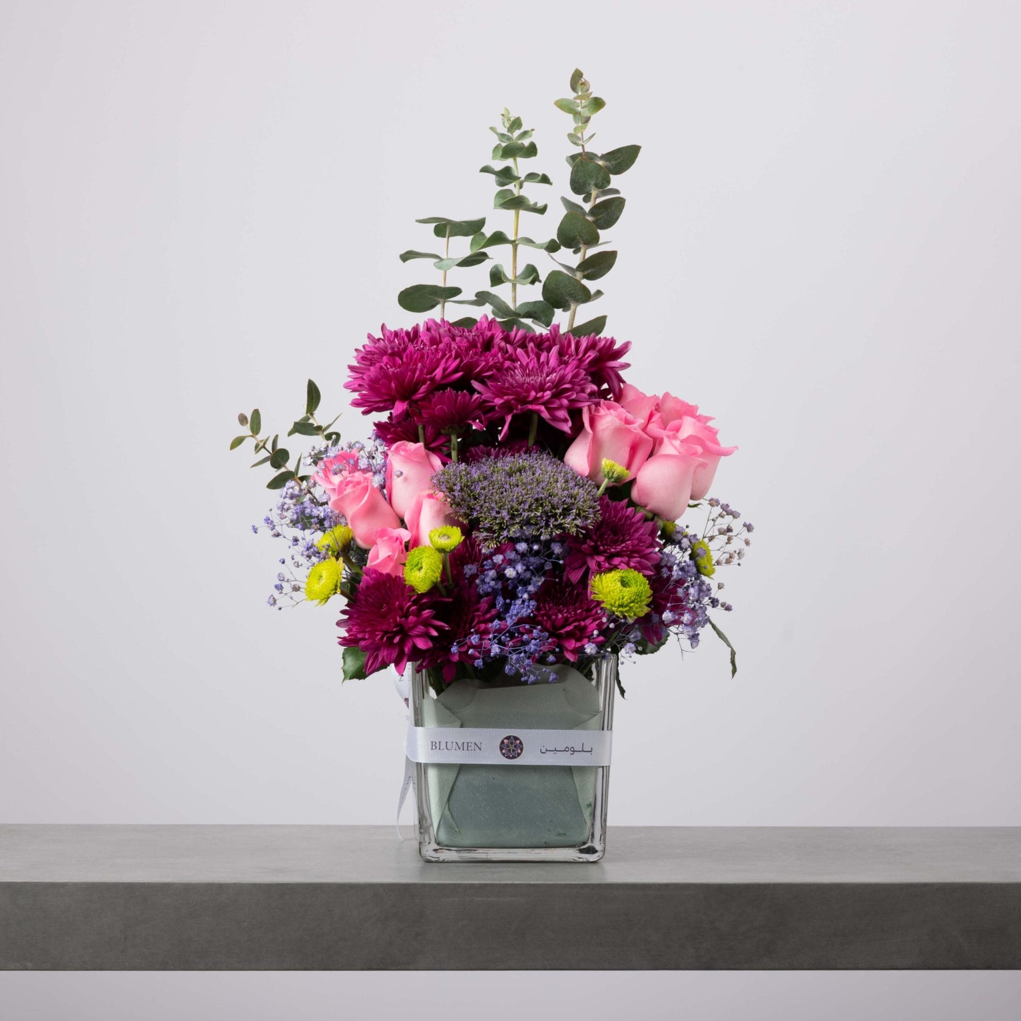 An expressive composition of fuchsia chrysanthemums, soft pink roses, and violet accents, delicately arranged in a clear glass vase wrapped with BLUMEN’s signature ribbon.