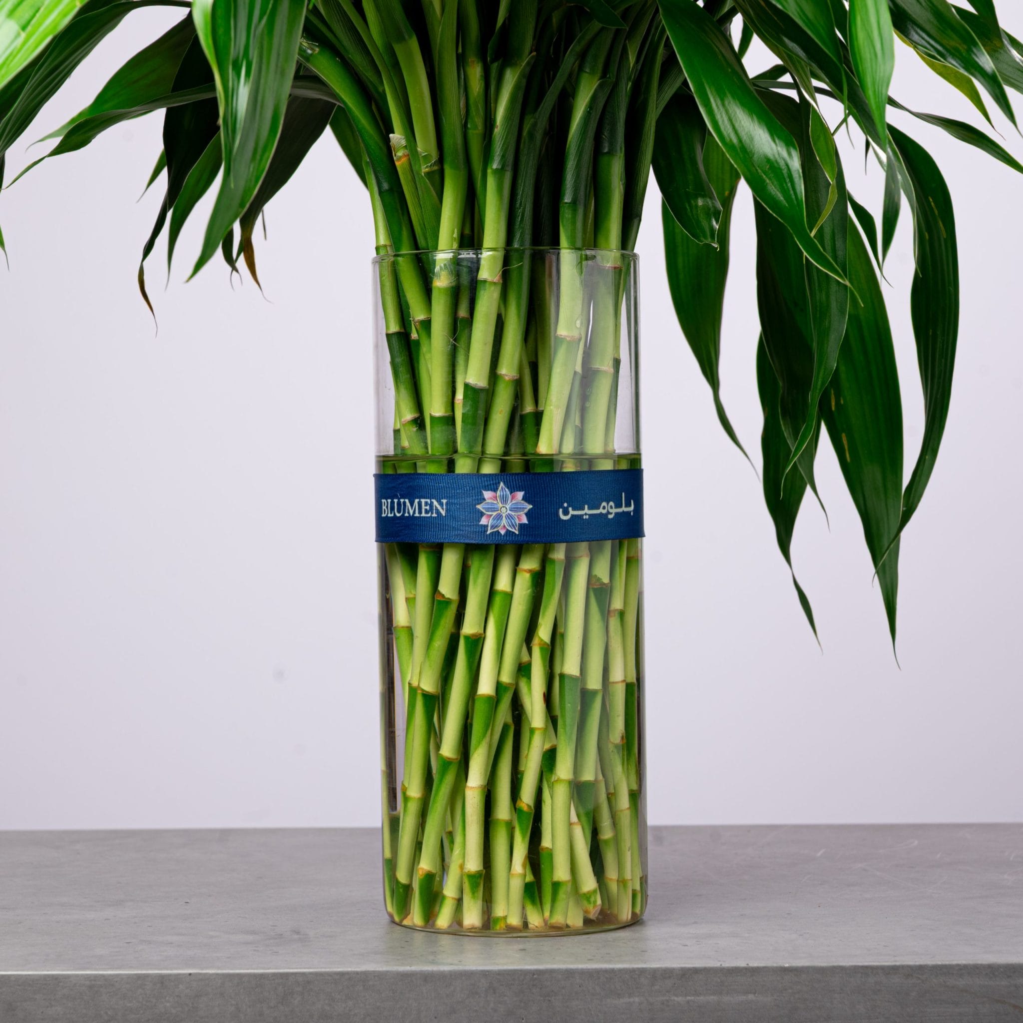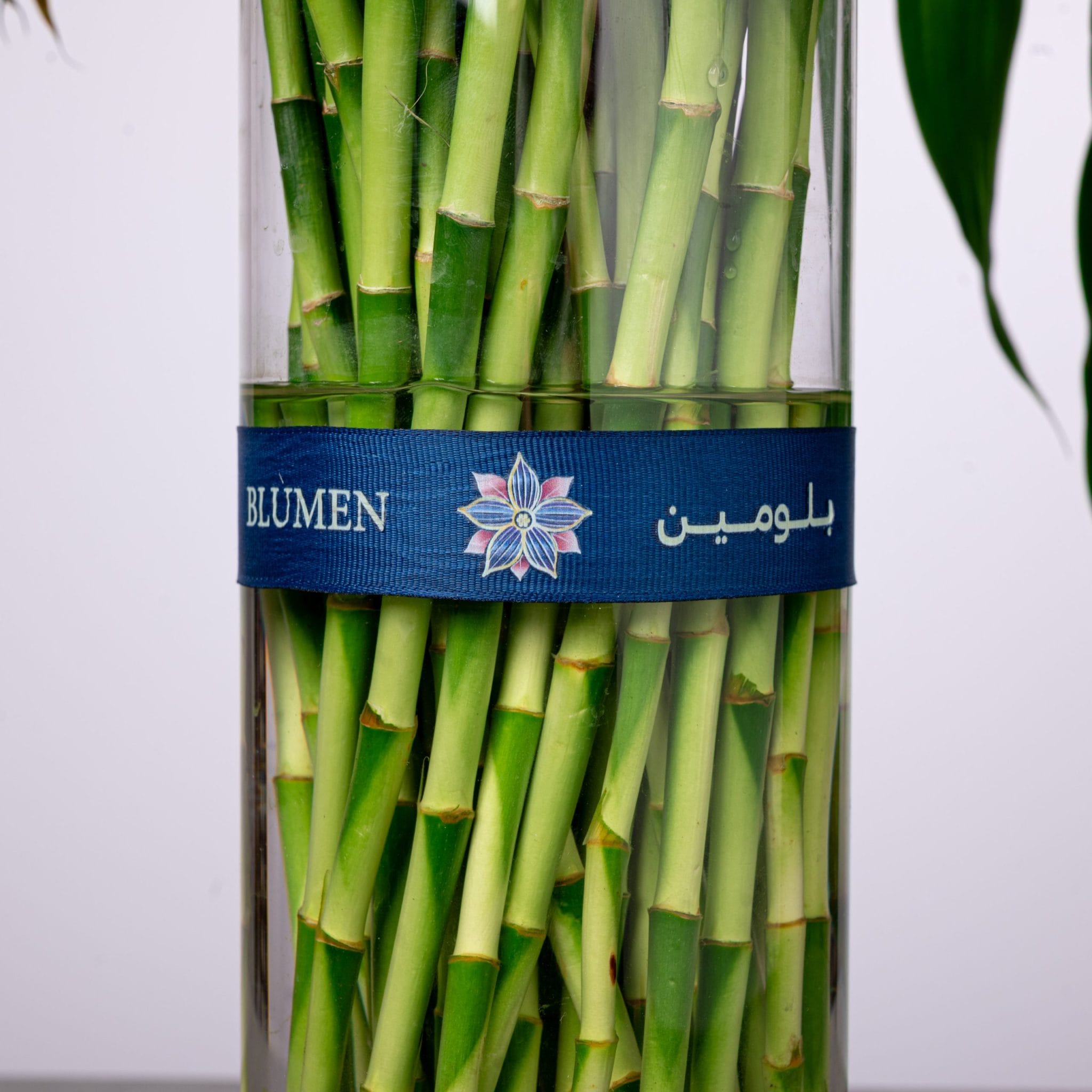 A contemporary arrangement of premium lucky bamboo stems, beautifully styled in a tall clear BLUMEN glass vase. With its vibrant greens and minimalist symmetry, this design symbolizes harmony, prosperity, and renewal — perfect for offices, homes, or modern interiors that embrace calm and nature.
