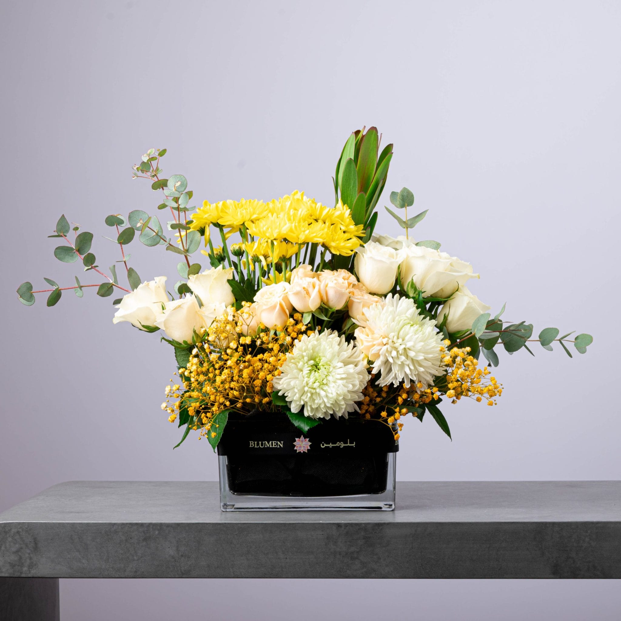 A refined composition featuring roses, spray roses, chrysanthemums, mimosa, and eucalyptus arranged in a modern BLUMEN glass vase. This elegant design balances warmth and freshness, ideal for brightening any space or marking special occasions with understated beauty.