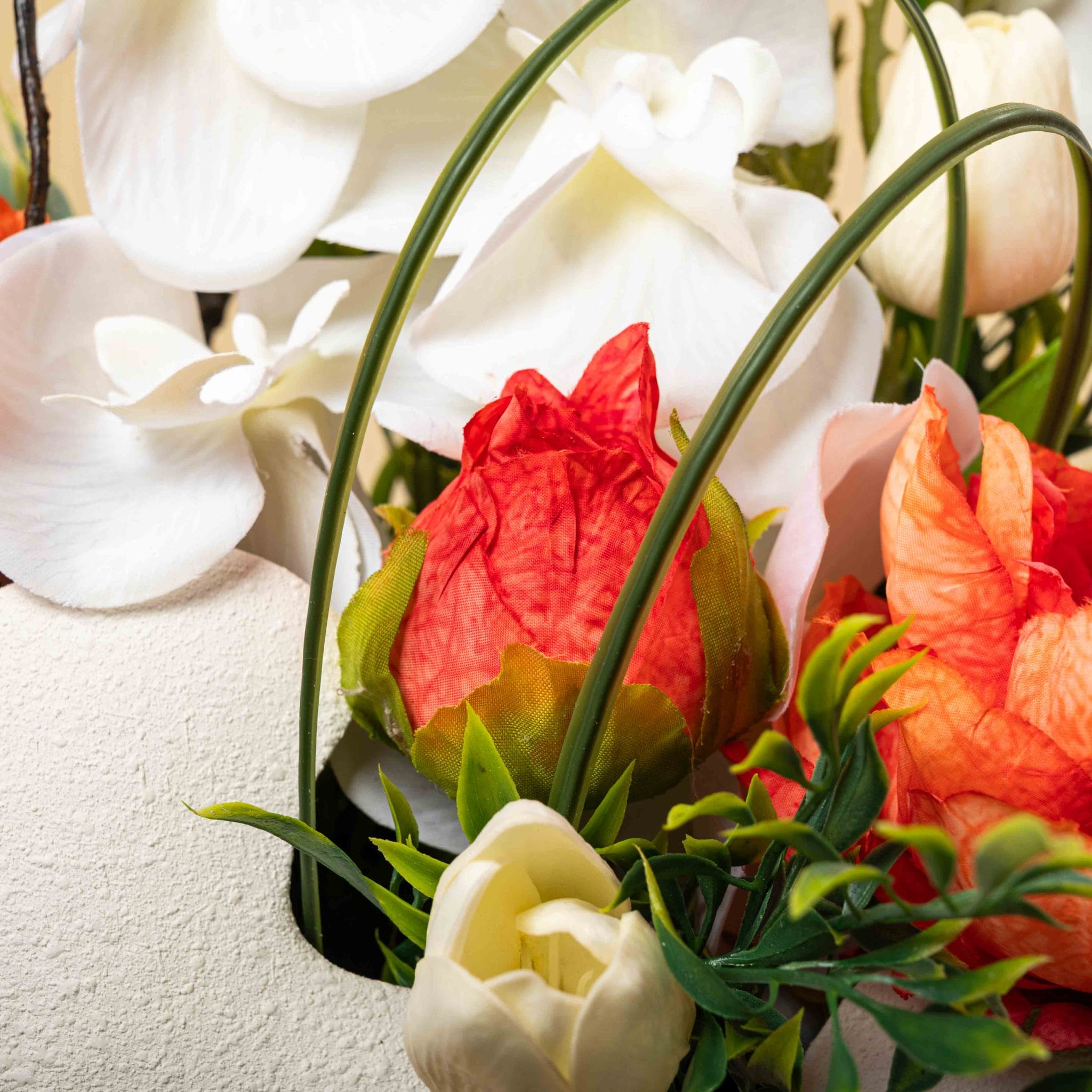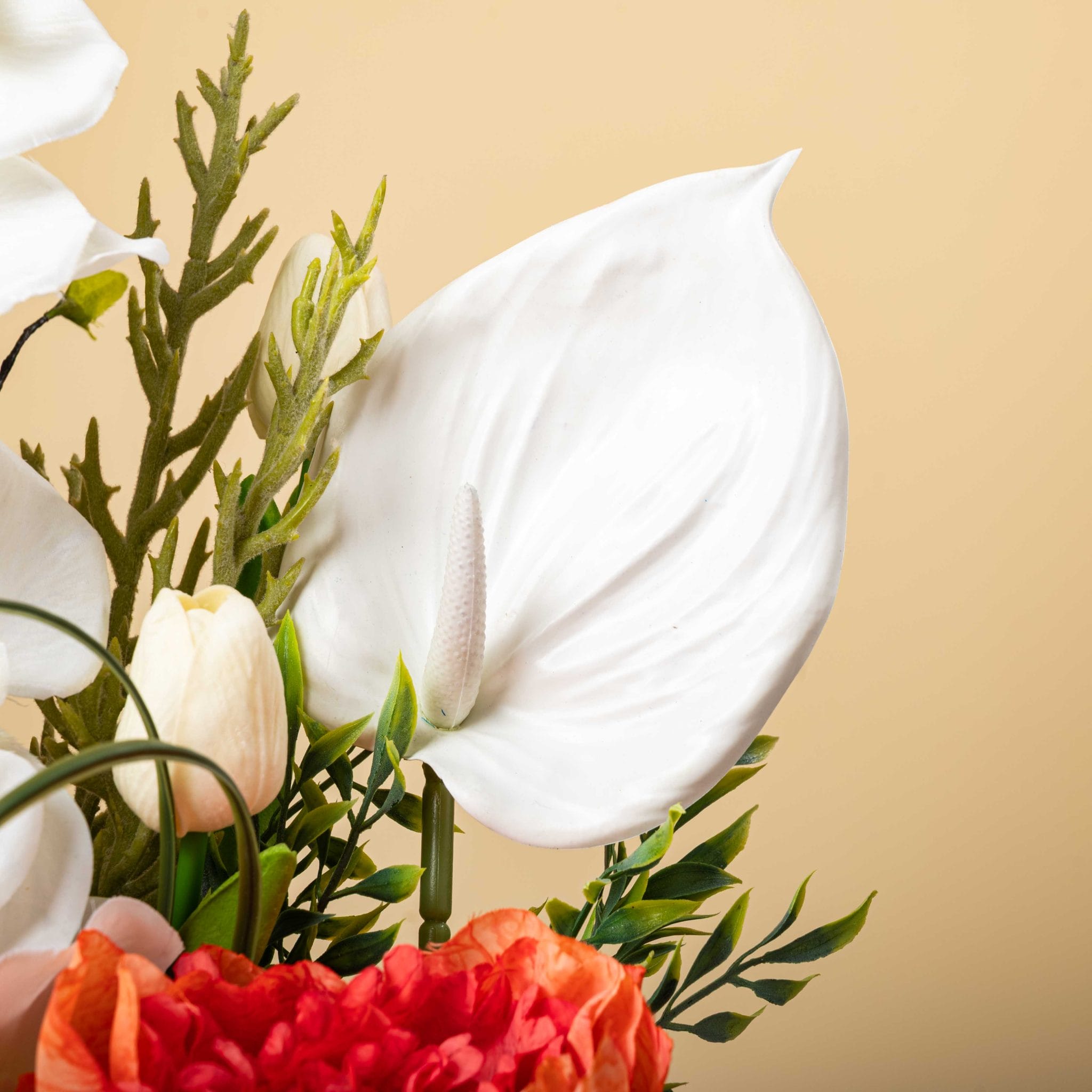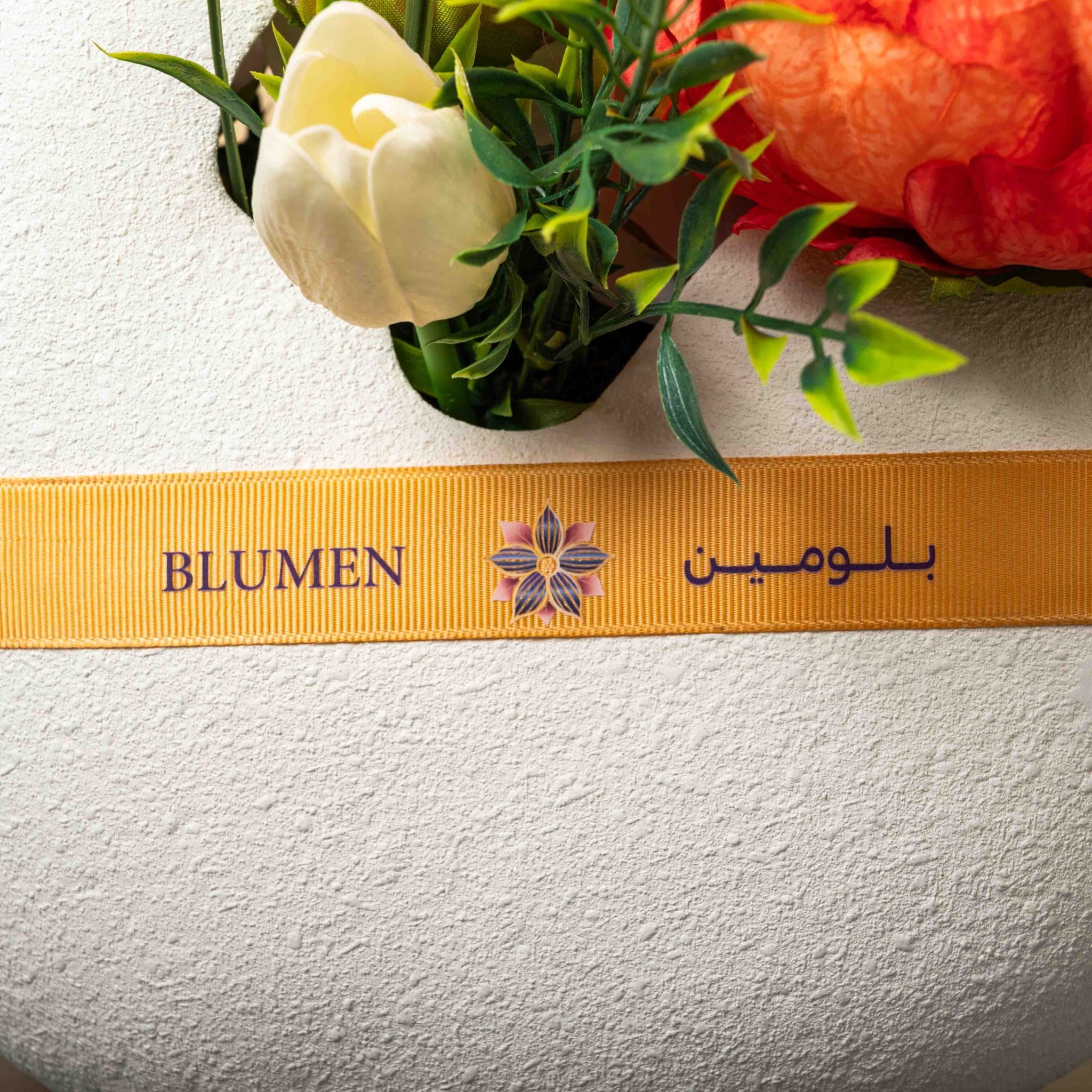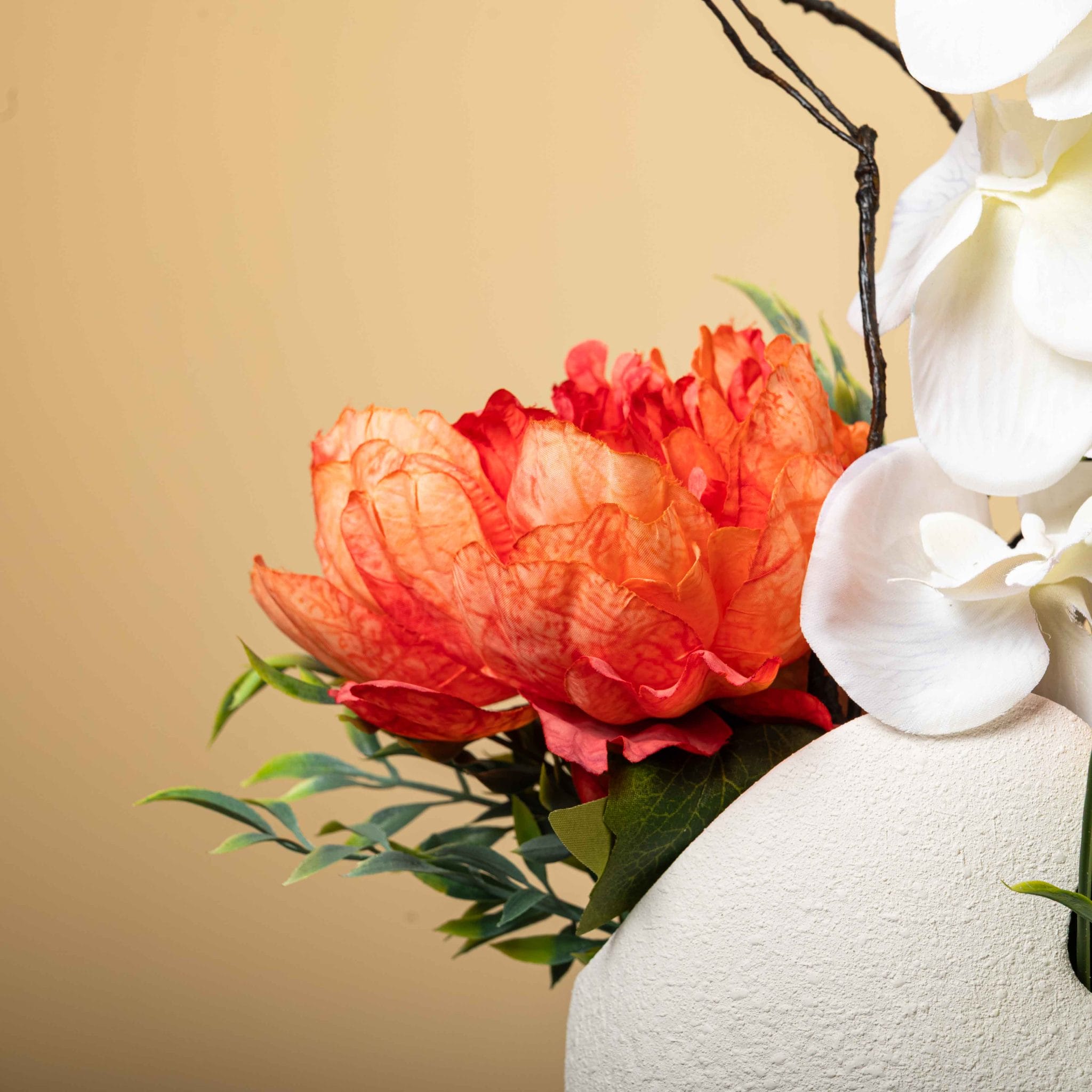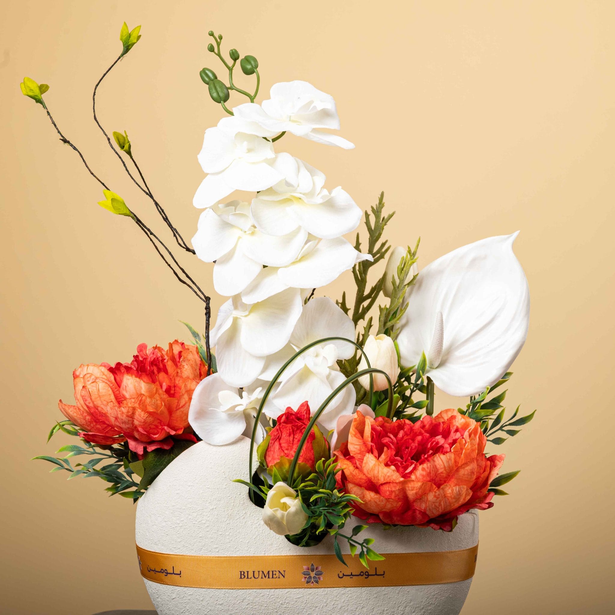 The Ivory Ember Garden brings together the purity of white orchids and anthurium with the glowing warmth of orange peonies in a sculpted round vase. The textured ivory container, accented with a golden Blumen ribbon and delicate budding branches, creates a luxurious, modern centerpiece. Perfect for elevating living rooms, receptions, and special celebrations with a balance of softness and fiery elegance.