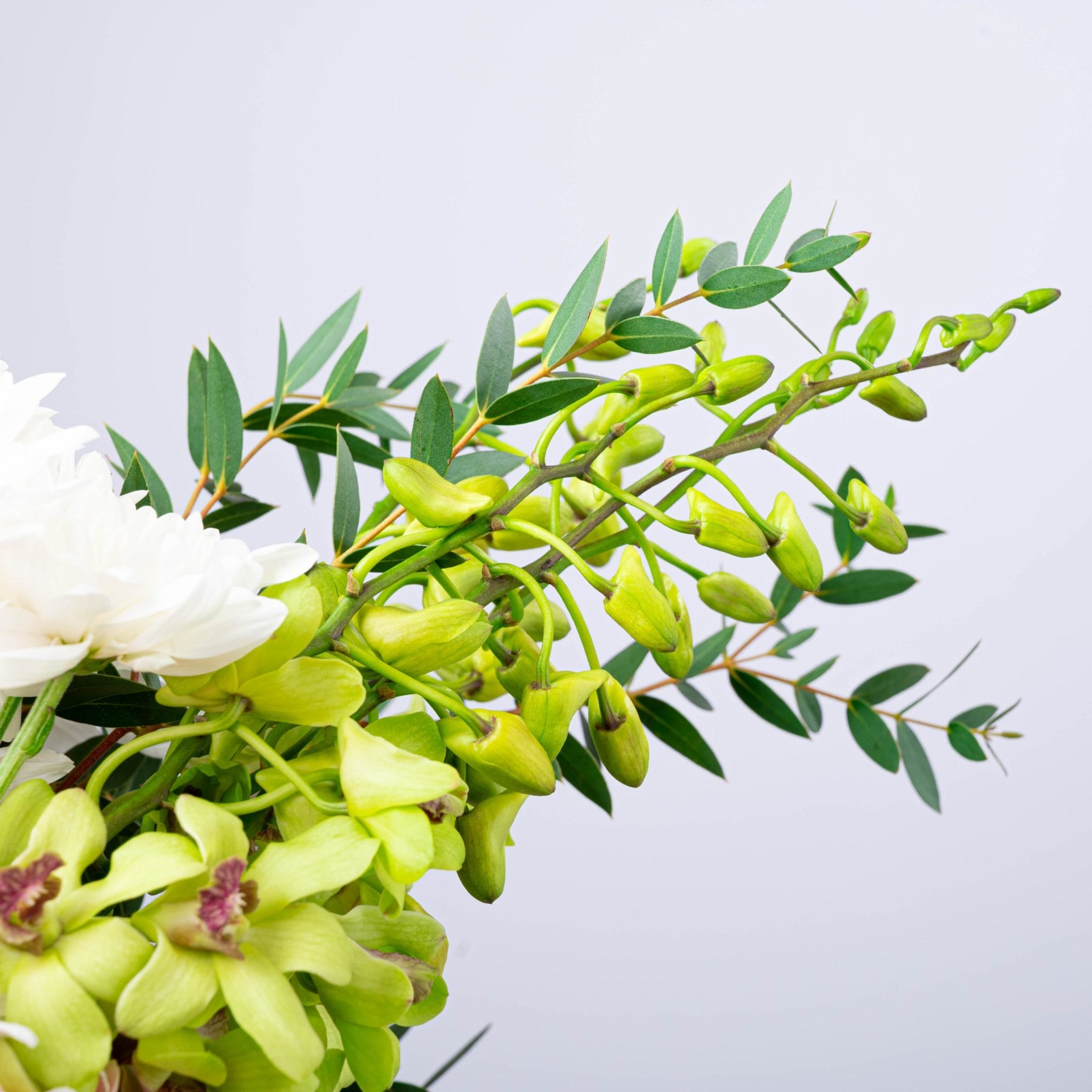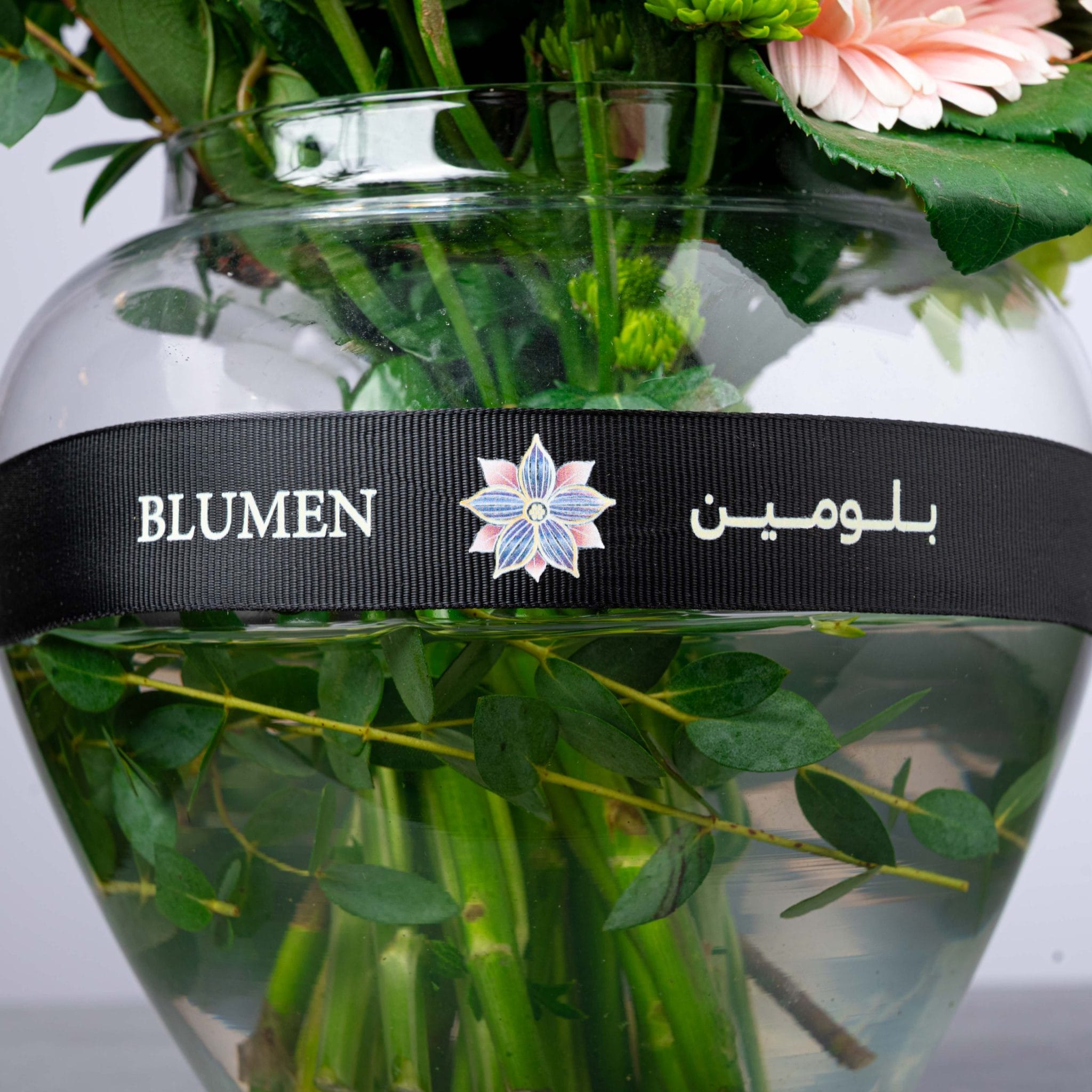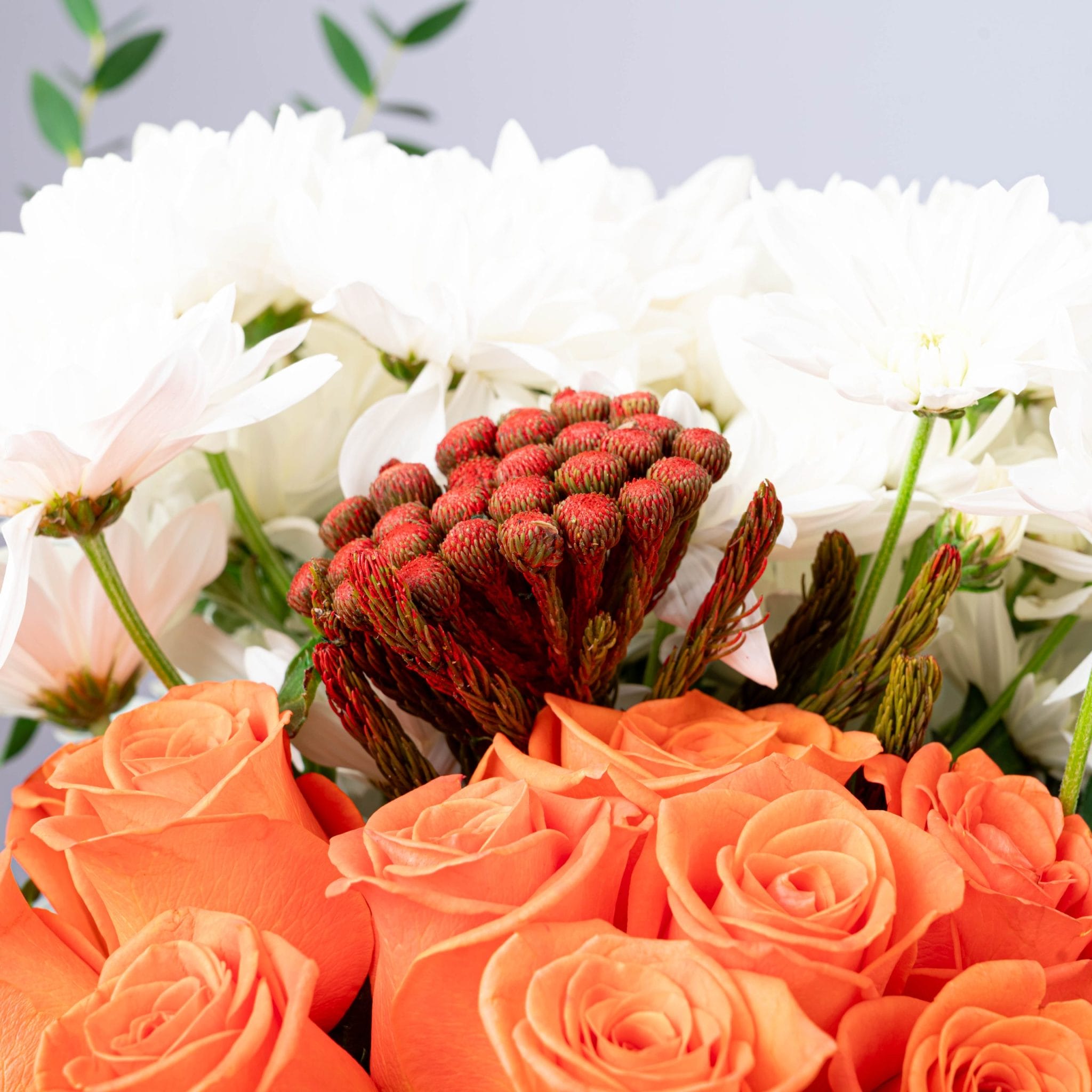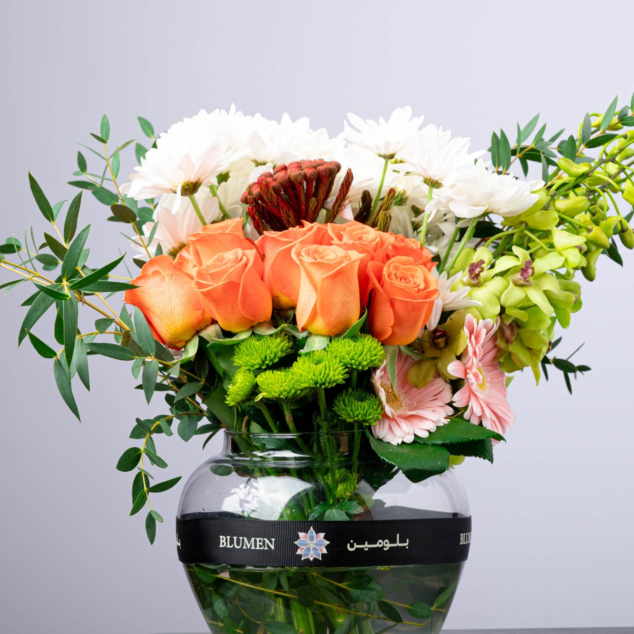 An uplifting combination of orange roses, chrysanthemums, alstroemeria, and lush greenery presented in a round BLUMEN glass vase. This lively design brings warmth, optimism, and a cheerful modern aesthetic to any environment.