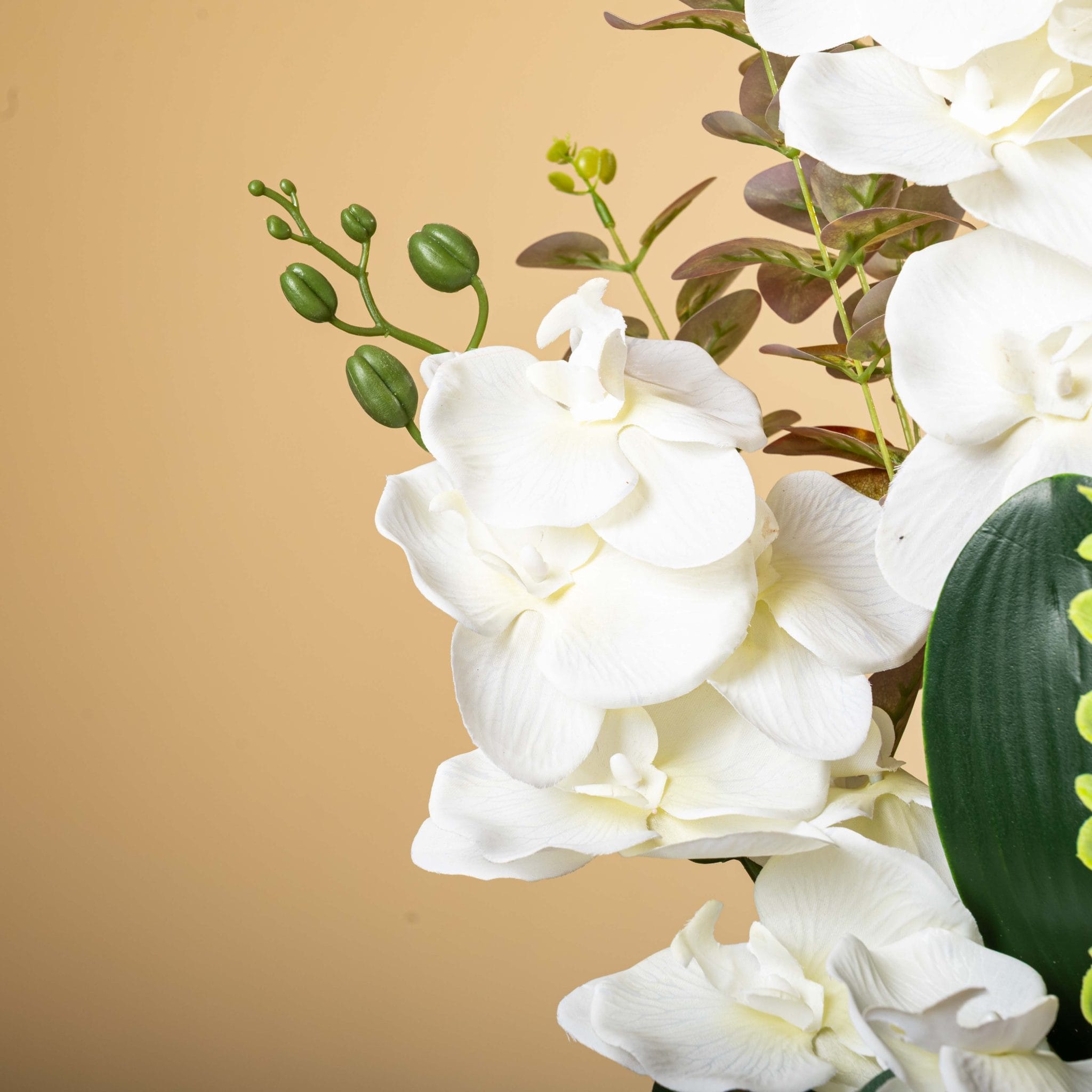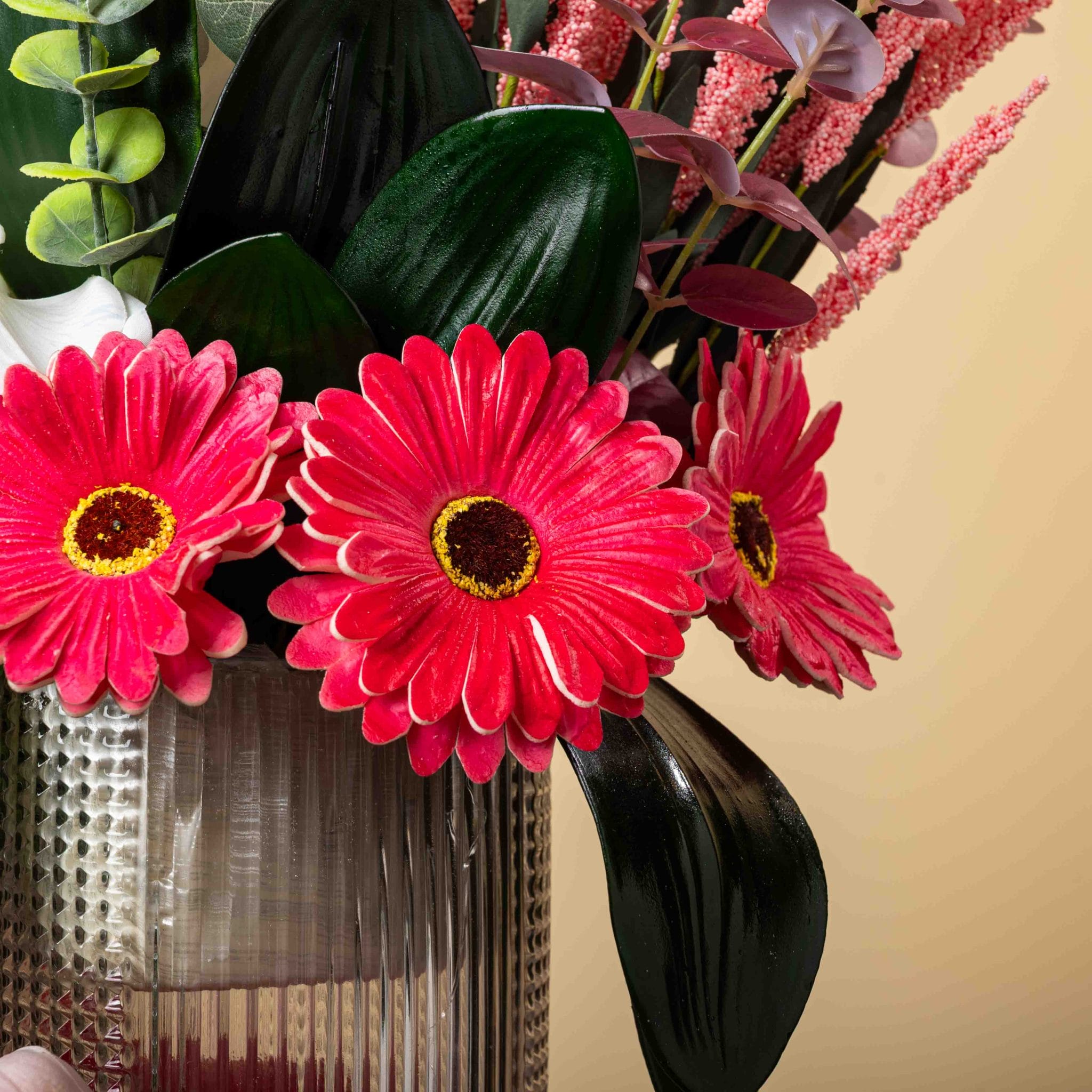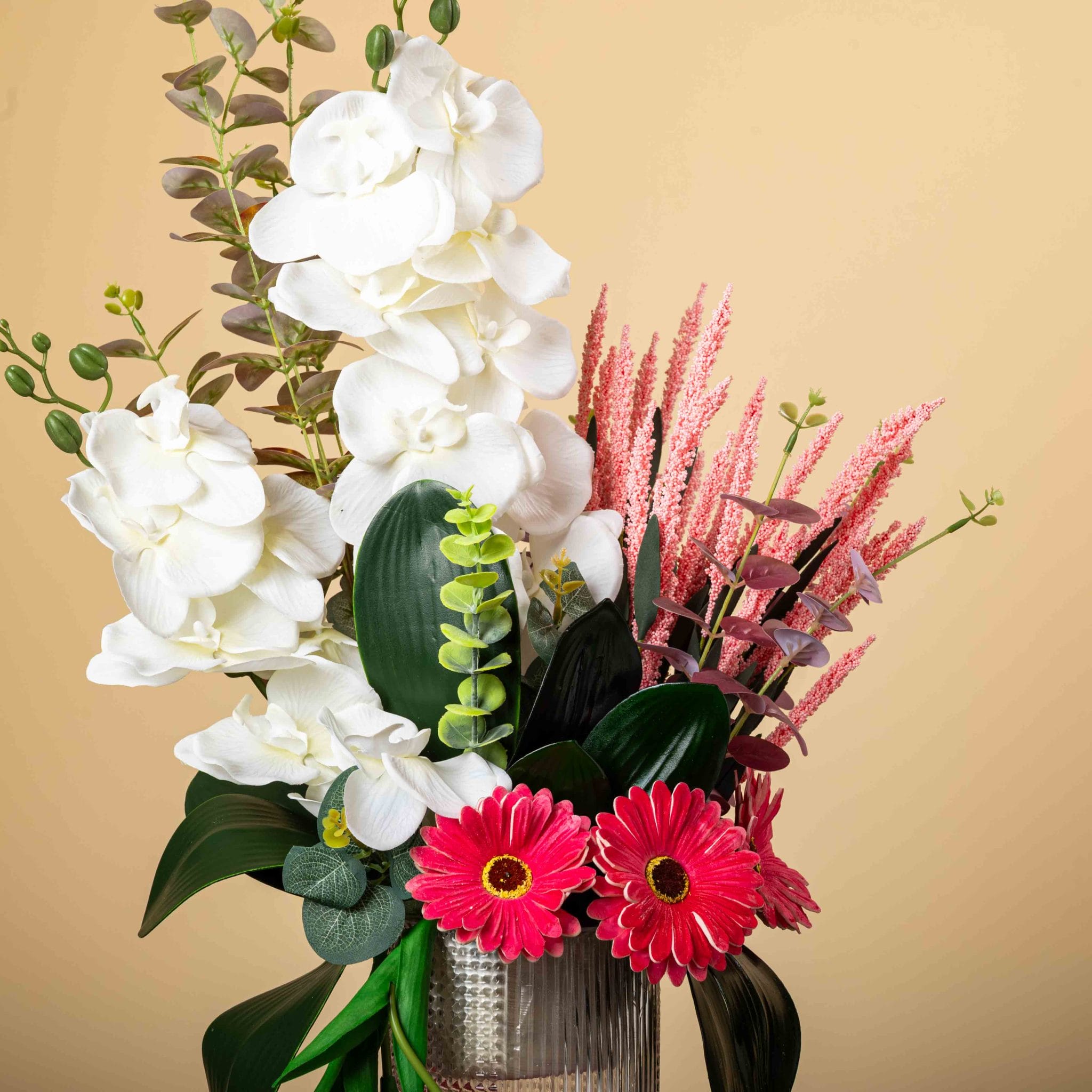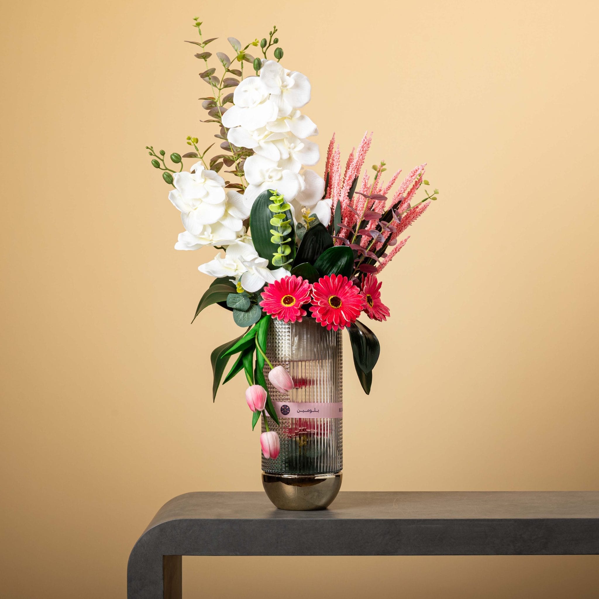 The Orchid Blush Skyline is a statement piece that rises like a city skyline — layers of cascading white orchids, bold pink gerberas, and soft tulips arranged in a tall ribbed glass vase. The graceful greenery and modern silhouette create a luxurious, artistic design perfect for grand entrances, hotel lobbies, or unforgettable gifts.