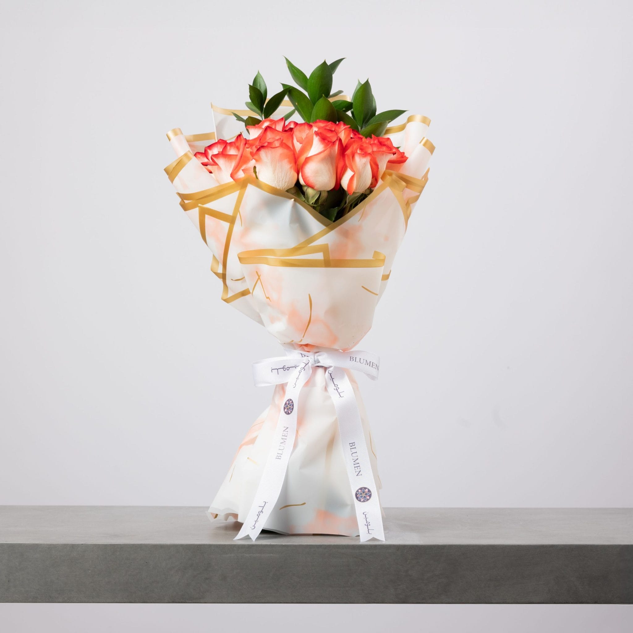 Delicate peach roses arranged with lush greenery and wrapped in soft marbled paper. Balanced between charm and refinement, it’s perfect for expressing gratitude, warmth, and admiration.