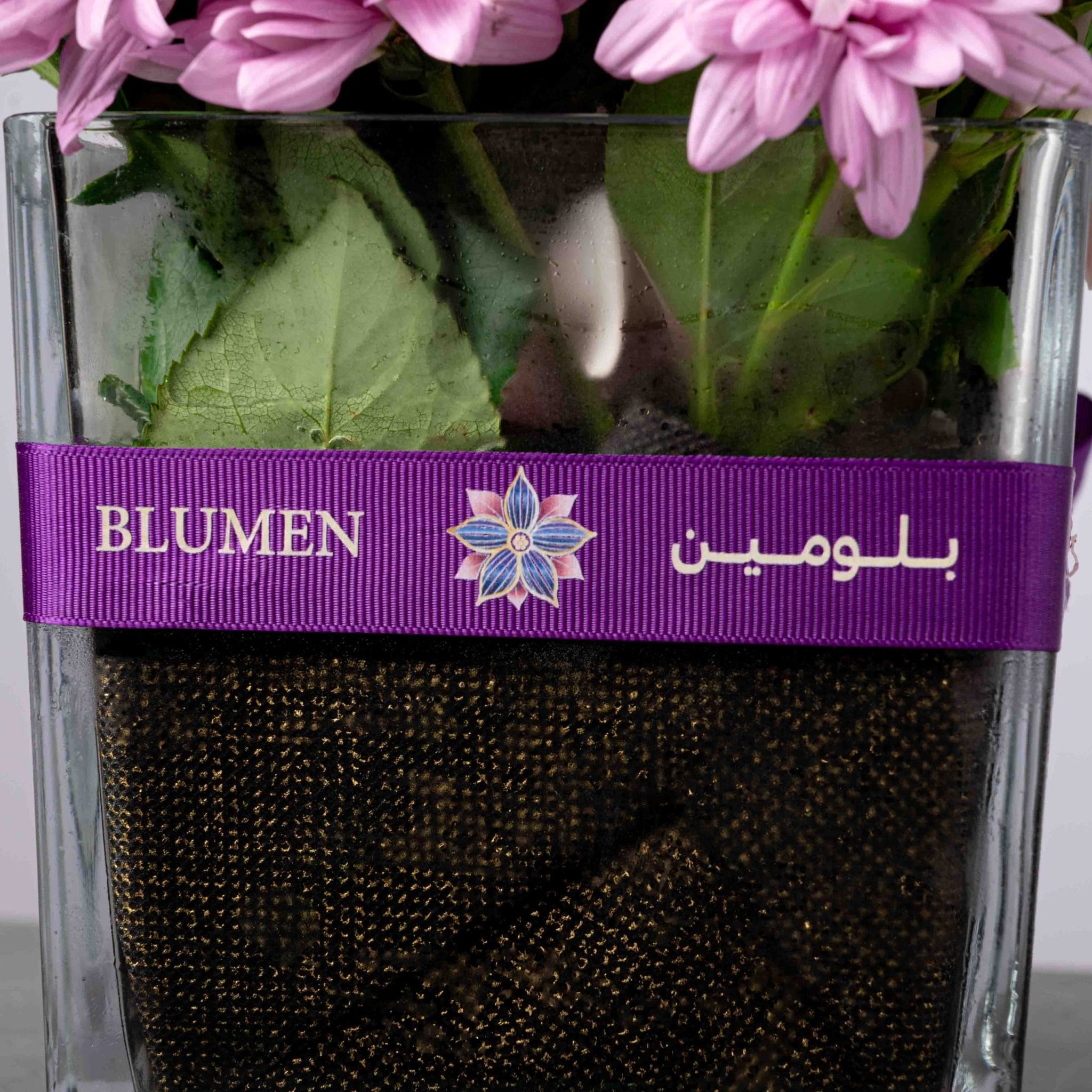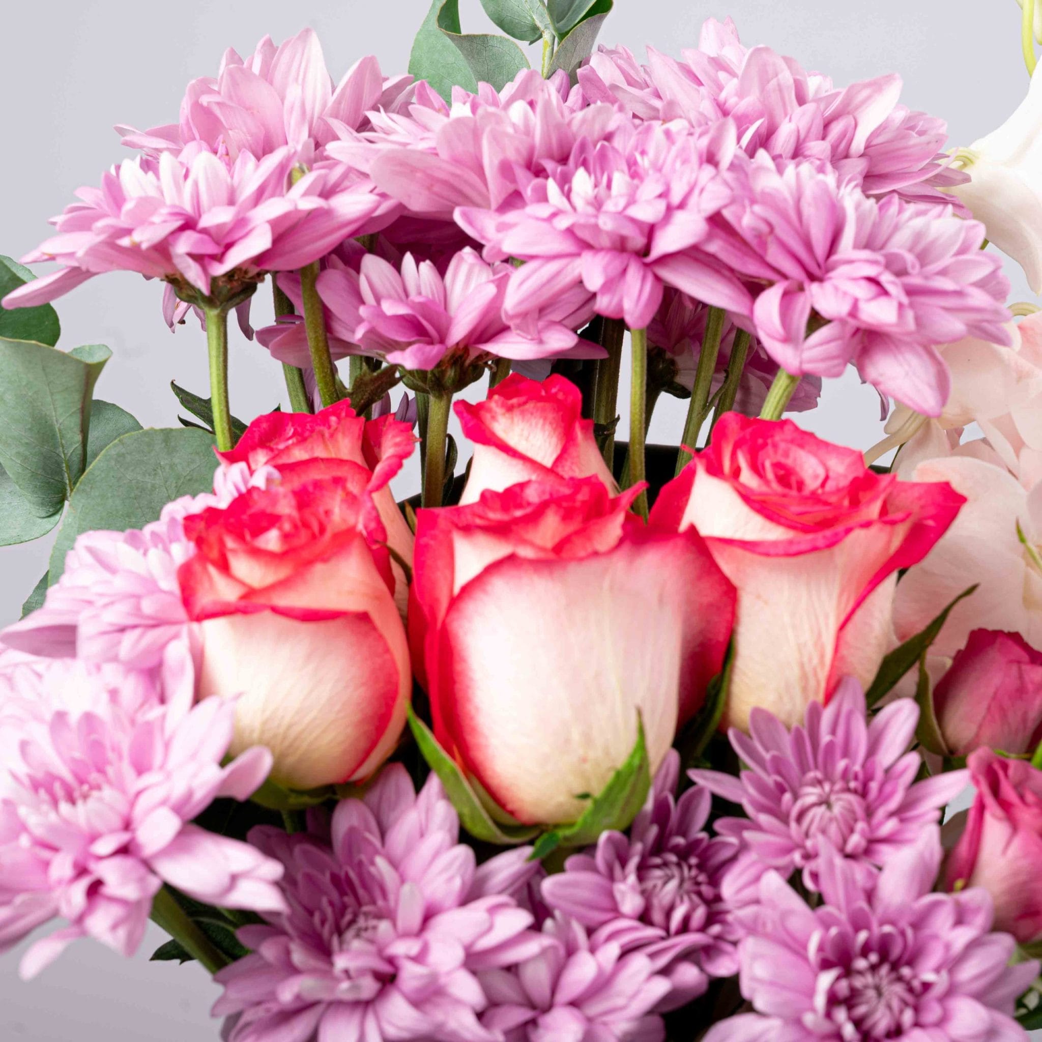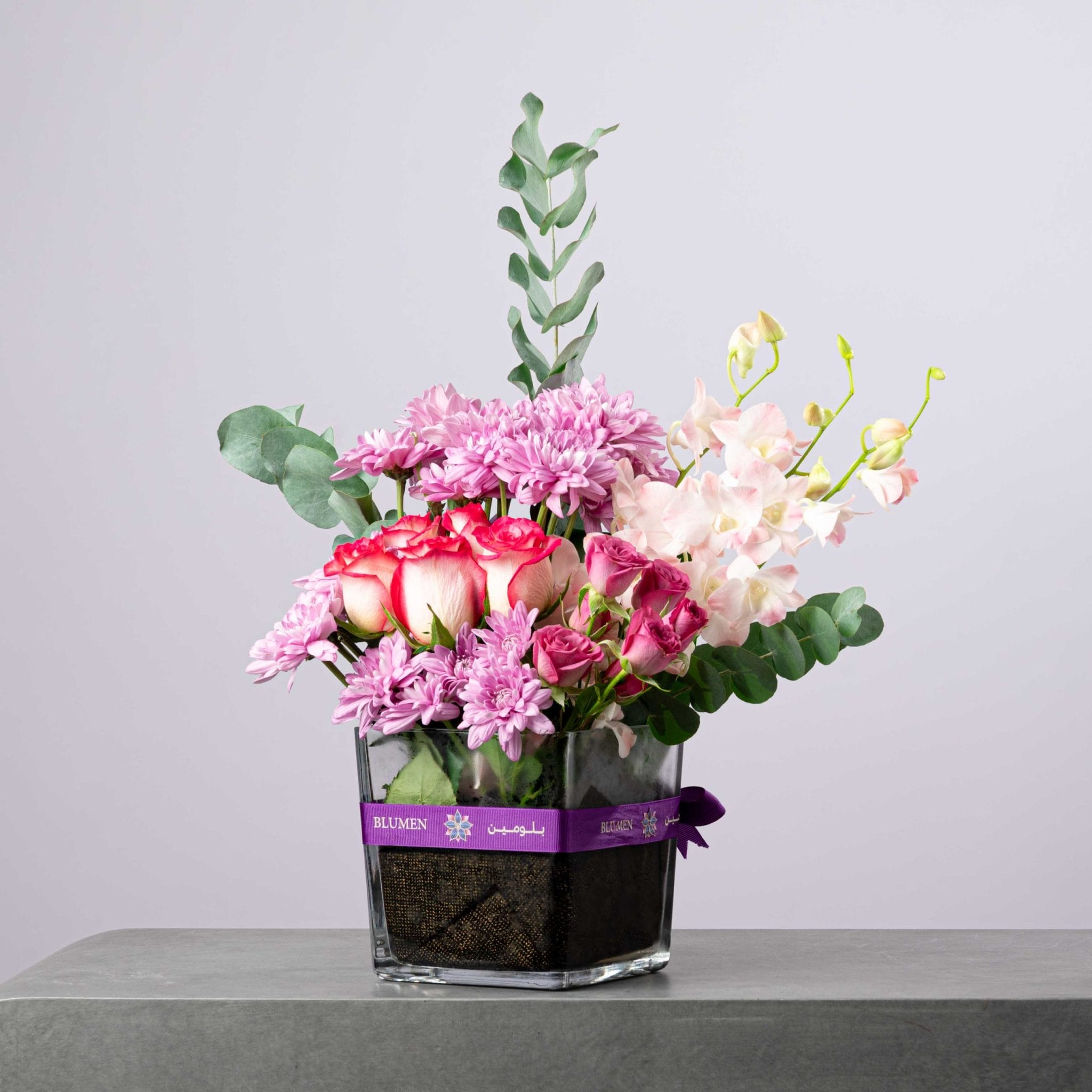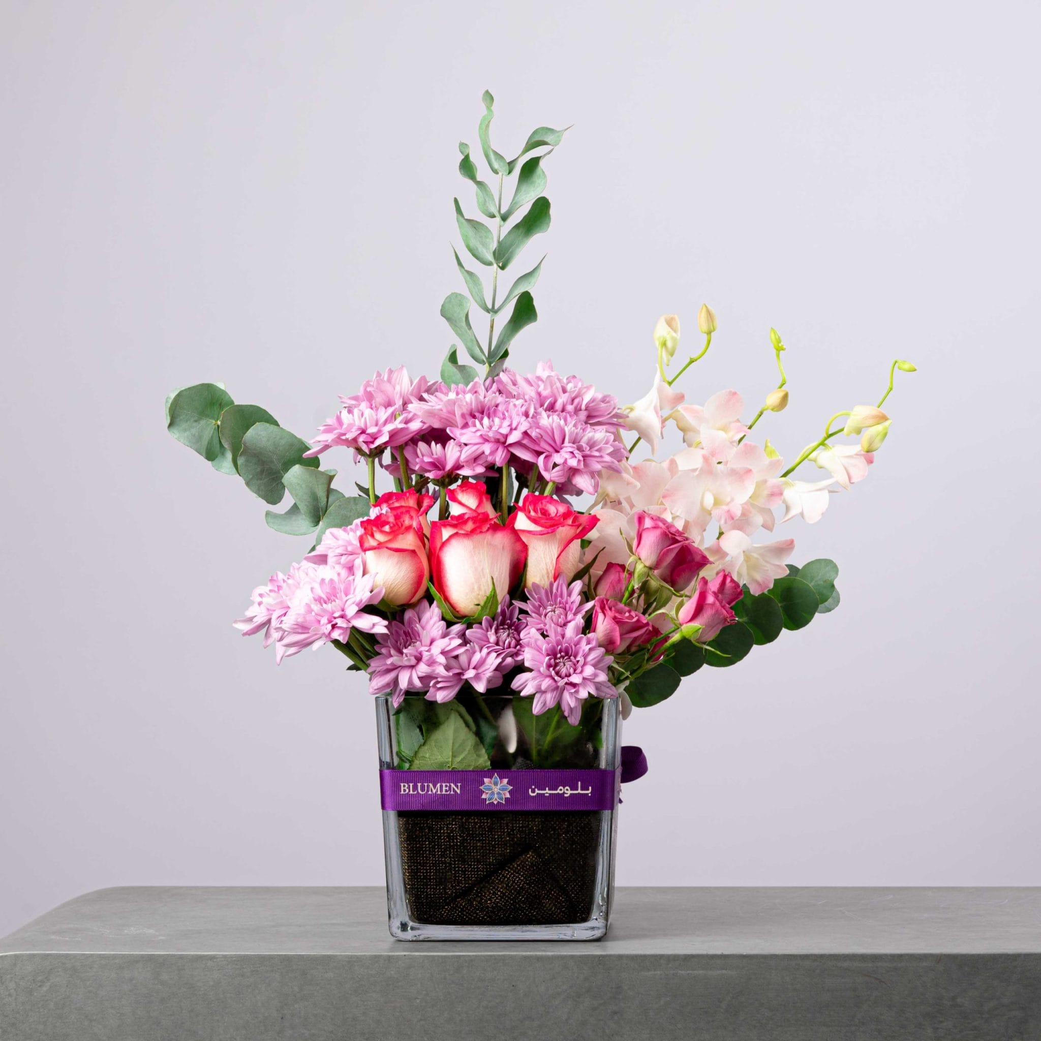 An exquisite arrangement of roses, chrysanthemums, orchids, and eucalyptus in harmonious pink and lilac shades. Designed in a clear BLUMEN vase with a purple ribbon, it embodies refinement, gentleness, and timeless beauty.