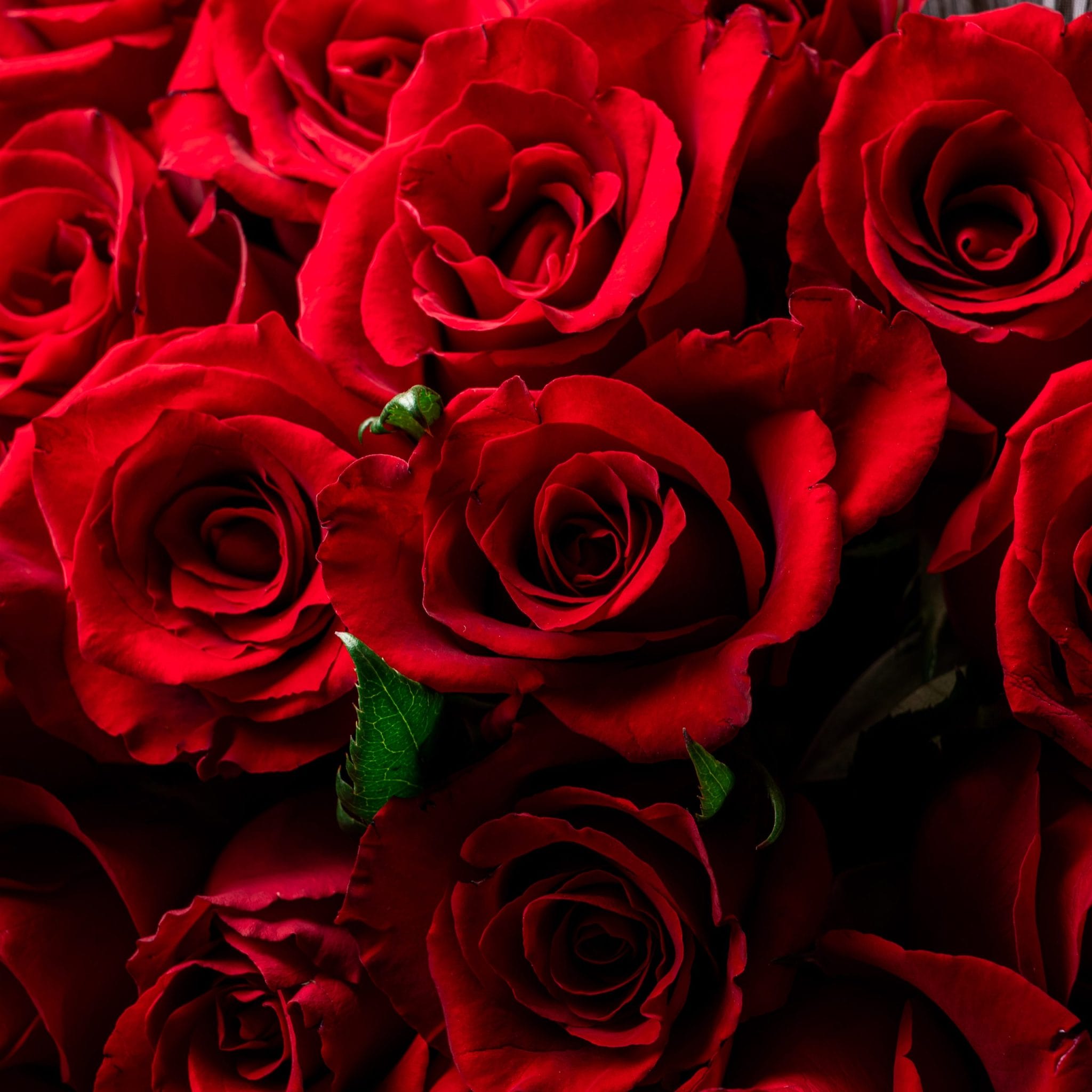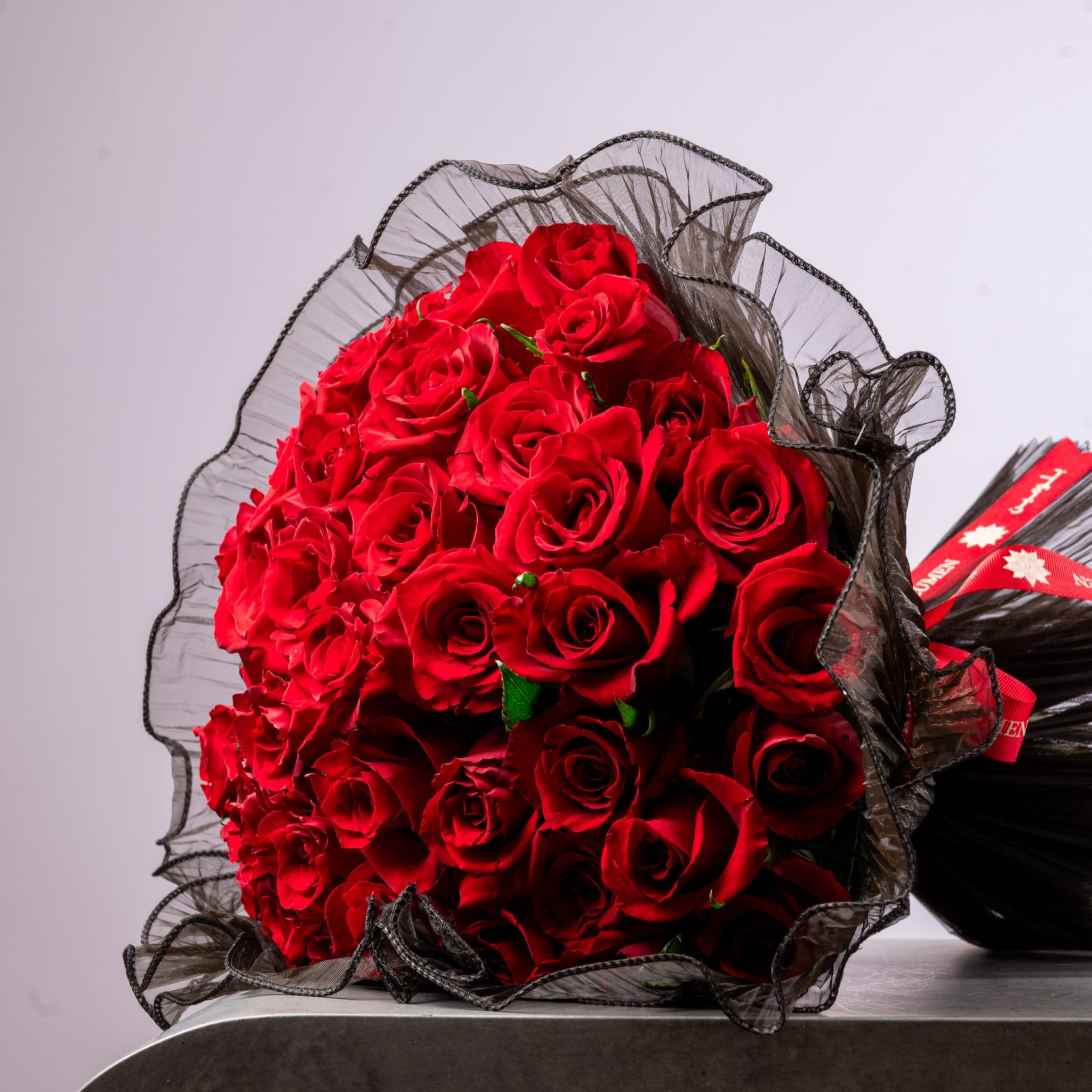 A bouquet full of red rose with red ribbion.