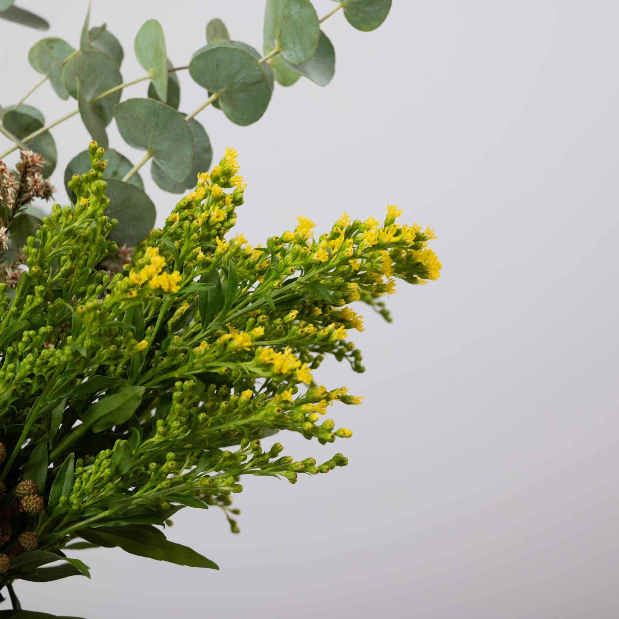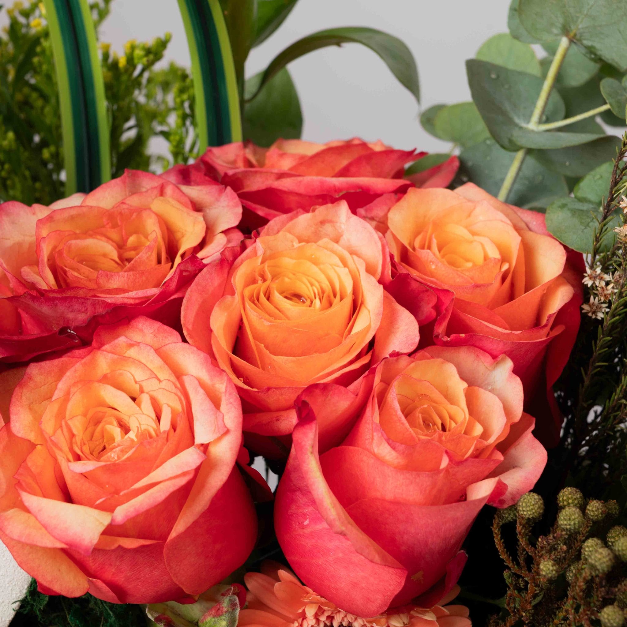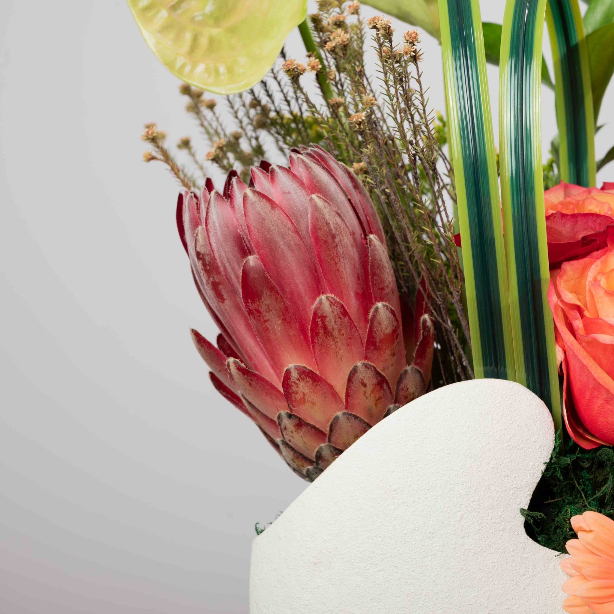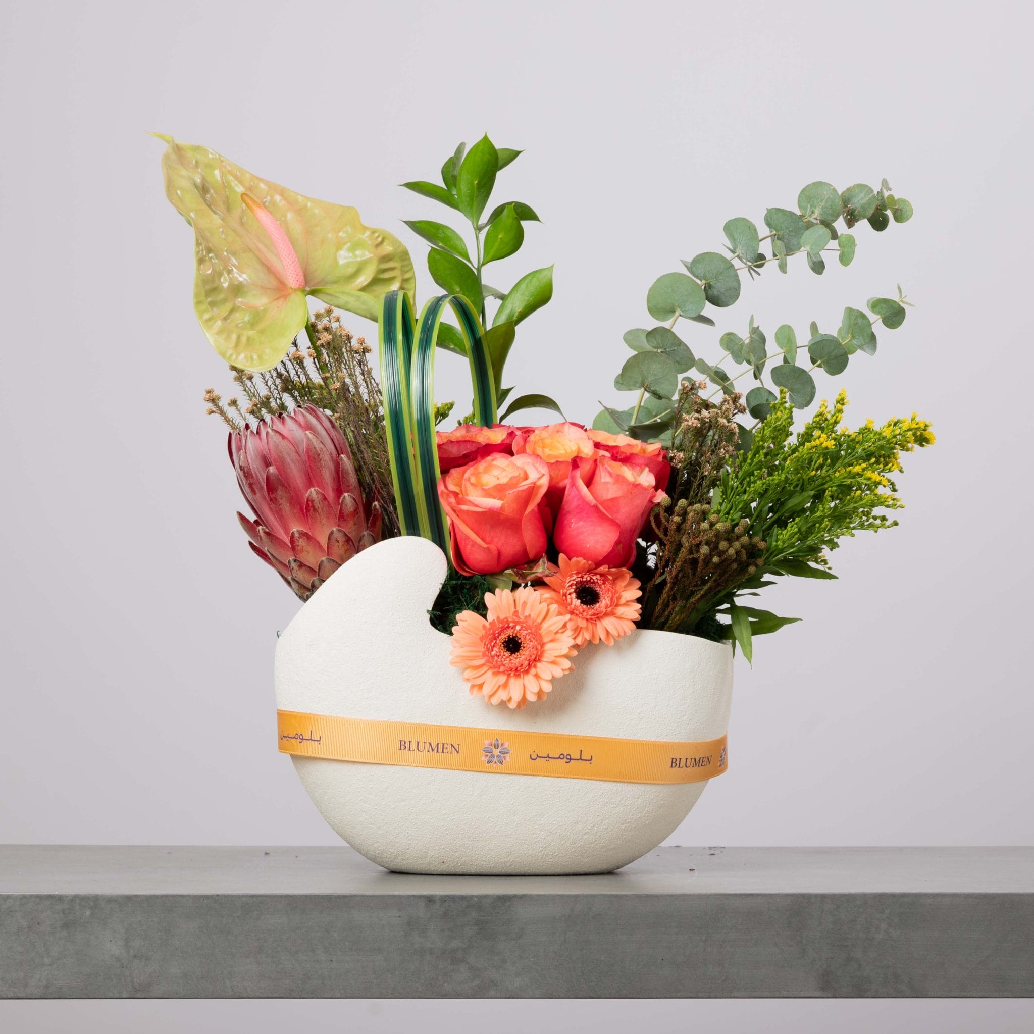 The Sunset Grove gathers the warm colors of a late afternoon sky into a modern bowl. Coral-orange roses and peach gerbera daises glow at the center, framed by exotic pink protea, fresh eucalyptus, green anthurium, and wild-style foliage. Set in a sculpted white bowl wrapped with a sunny yellow Blumen ribbon, this arrangement is perfect for living rooms, thank-you gifts, and celebrations that call for a cozy yet luxurious touch.