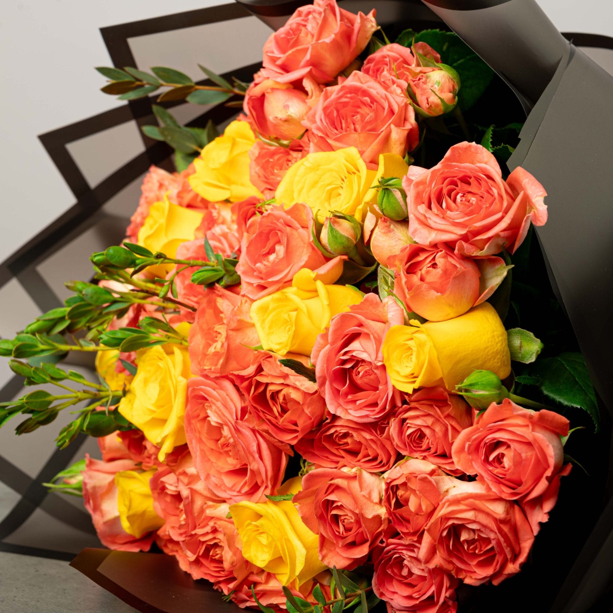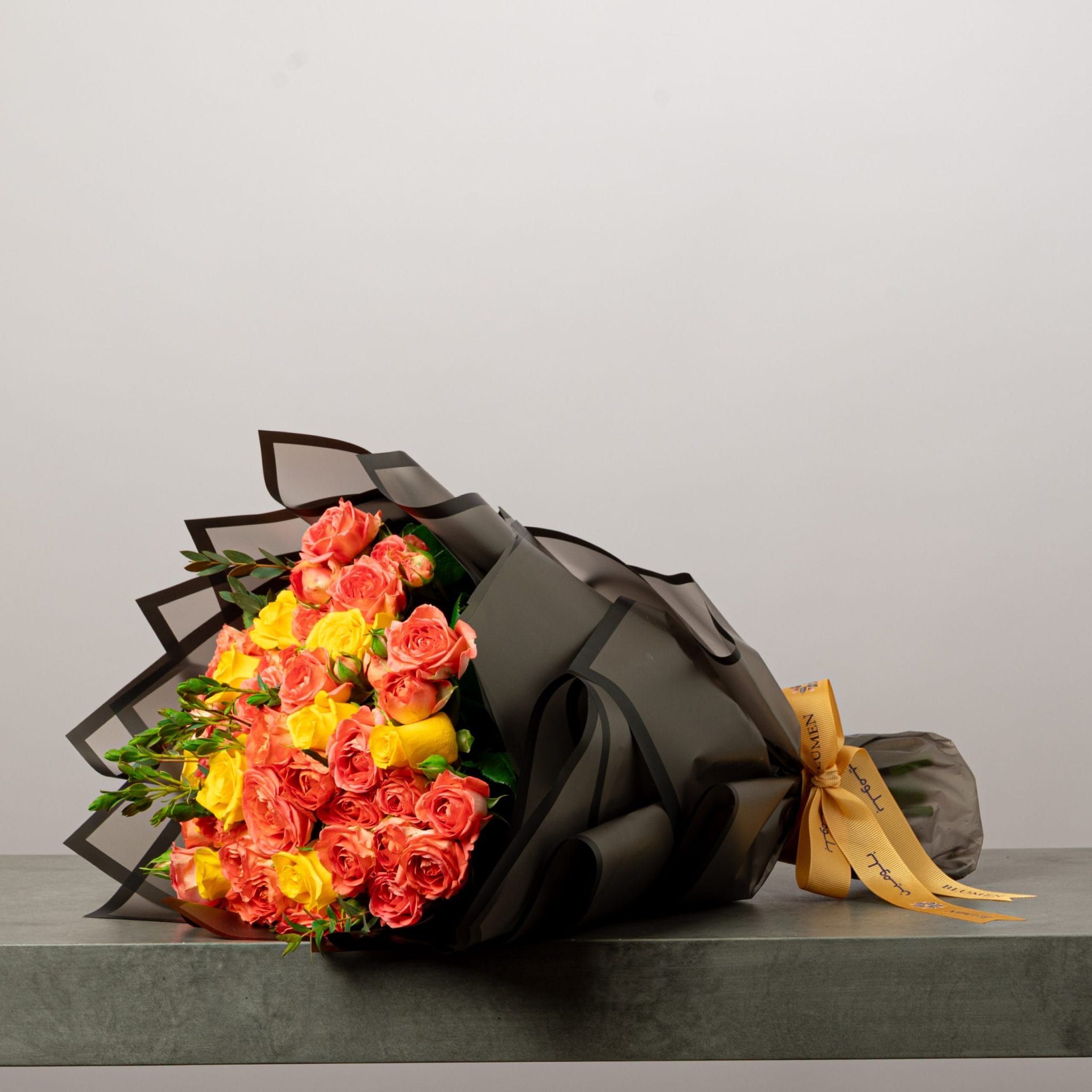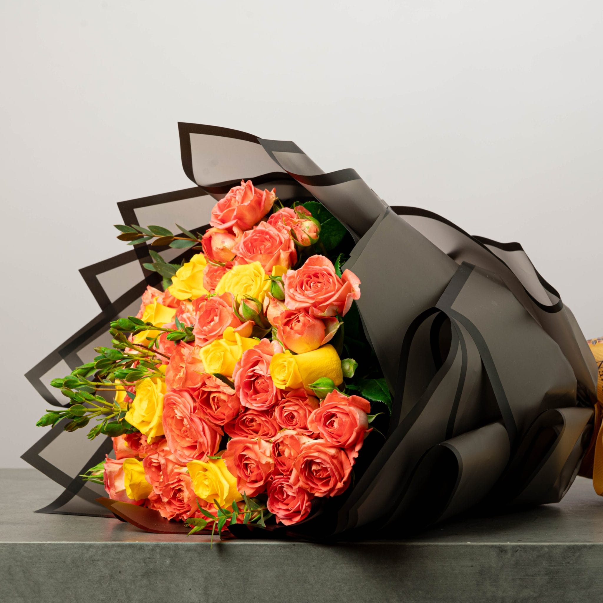A vibrant bouquet bursting with energy and warmth, featuring radiant orange and yellow roses hand-tied in sleek black wrapping and finished with a golden satin ribbon. Perfect for celebrations, congratulations, or adding a touch of modern elegance to any occasion. Each bloom is selected for freshness and arranged to balance color, form, and emotion — a bold statement of joy and sophistication.
