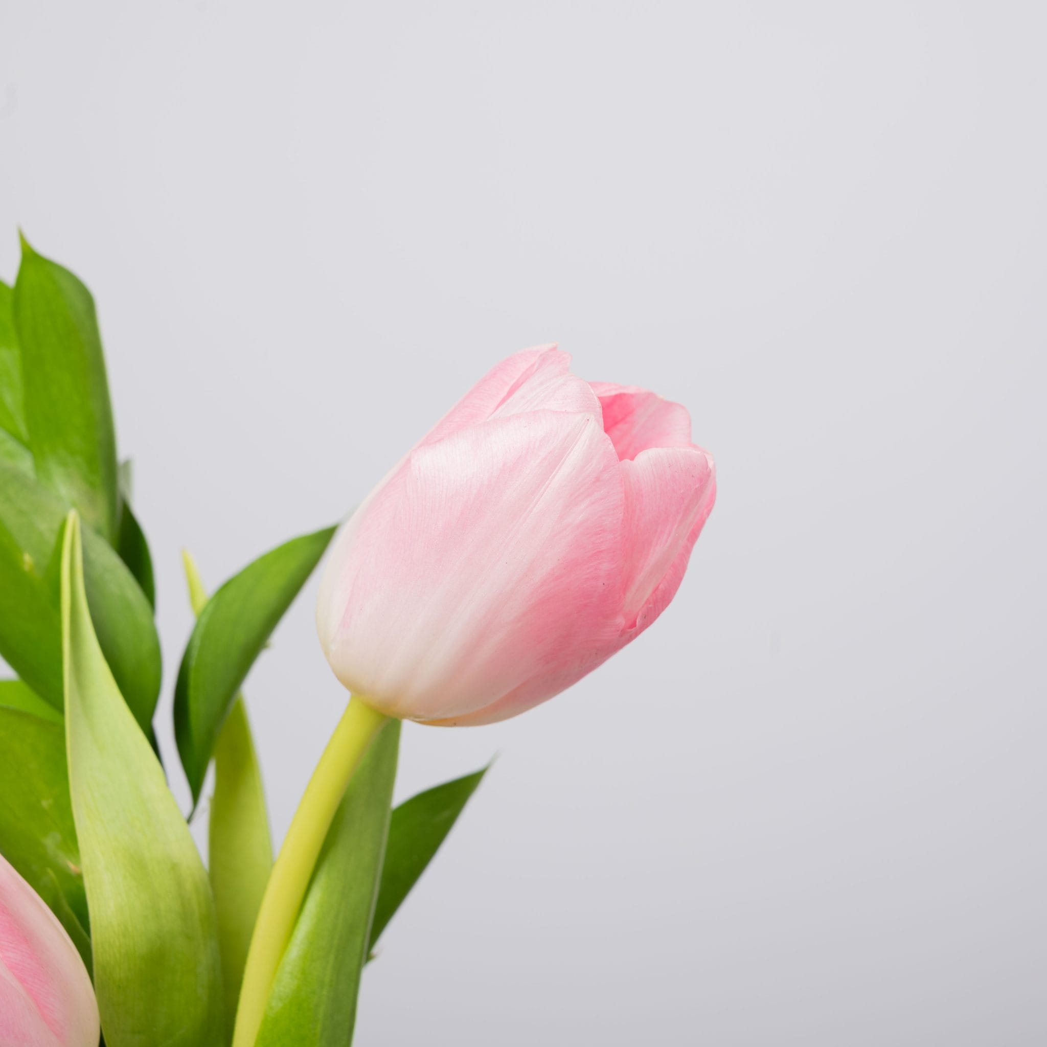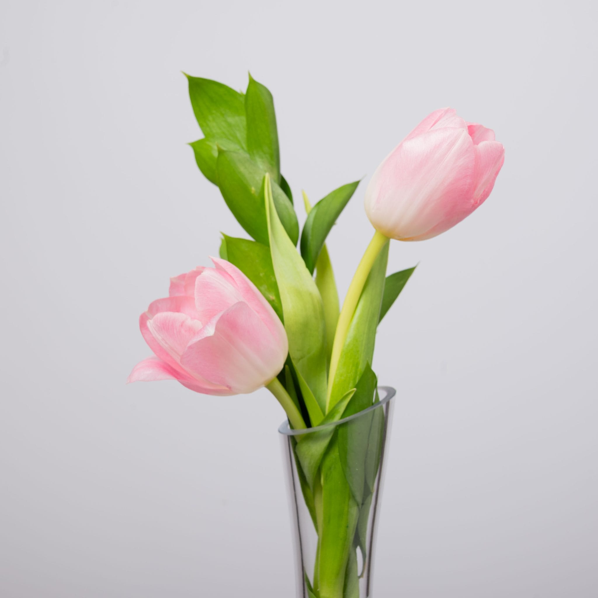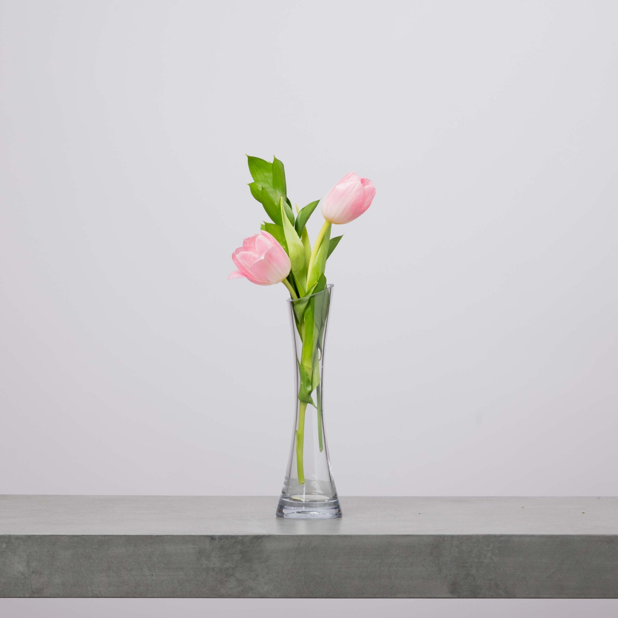 The Tulip Pair proves that simplicity can be deeply romantic. Two soft pink tulips stand side by side in a slender clear vase, accented with fresh green leaves for a clean, modern look. This minimalist design is perfect for bedside tables, office desks, or as a subtle, elegant gesture of affection.