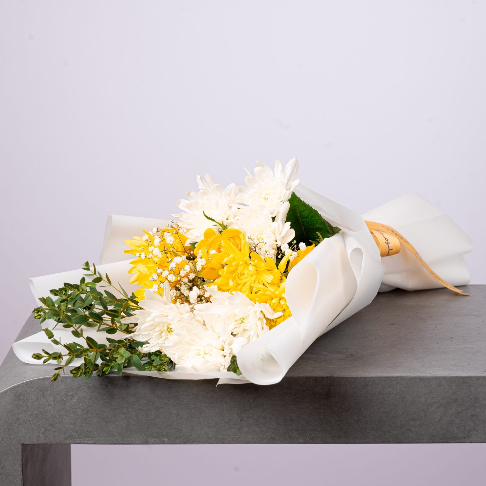 A hand-tied bouquet of white and yellow chrysanthemums, eucalyptus complemented by delicate baby’s breath and fresh greenery. Wrapped in elegant white paper with a satin ribbon, it’s a bright and heartfelt gesture for any moment worth celebrating.