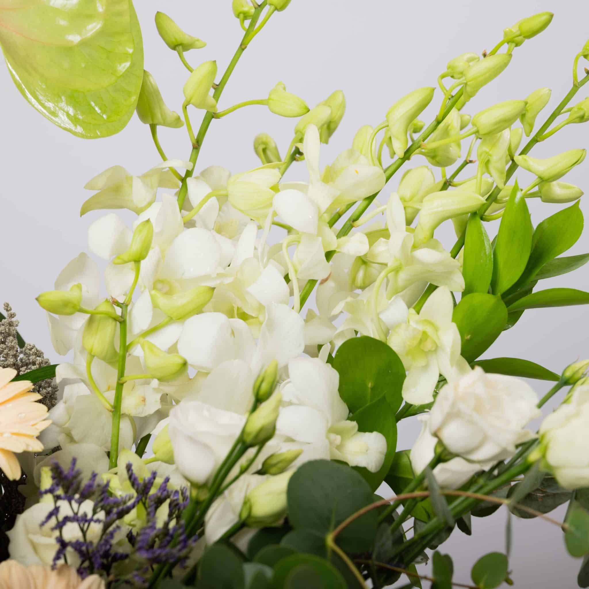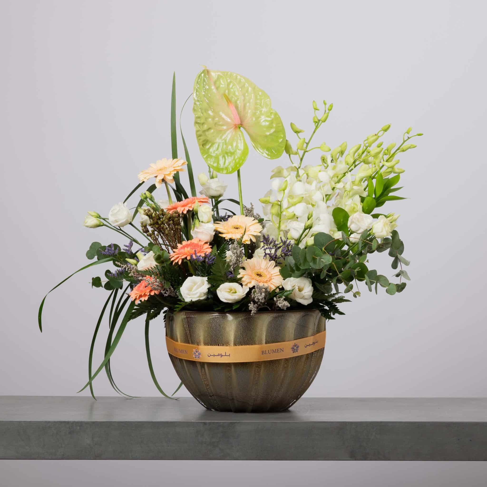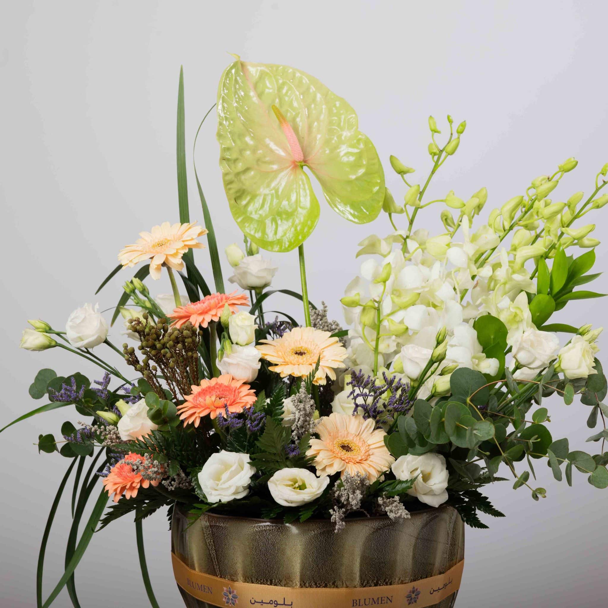 يجسّد باستيل ميدو رقة مرج ربيعي مليء بالأزهار. تتداخل الورود البيضاء مع أوركيد ناصع وجربيرا بدرجات الخوخي والمرجاني، يحيط بها زهور ناعمة وأوراق الأوكالبتوس وأنثوريوم أخضر فاتح داخل مزهرية ذهبية على شكل وعاء مزينة بشريط عنبري من بلومن. تنسيق هادئ وأنيق مثالي لاستقبال الضيوف، وتزيين طاولات الطعام، أو لتقديمه كهدية تضيف لمسة من الفخامة والانتعاش الرقيق.