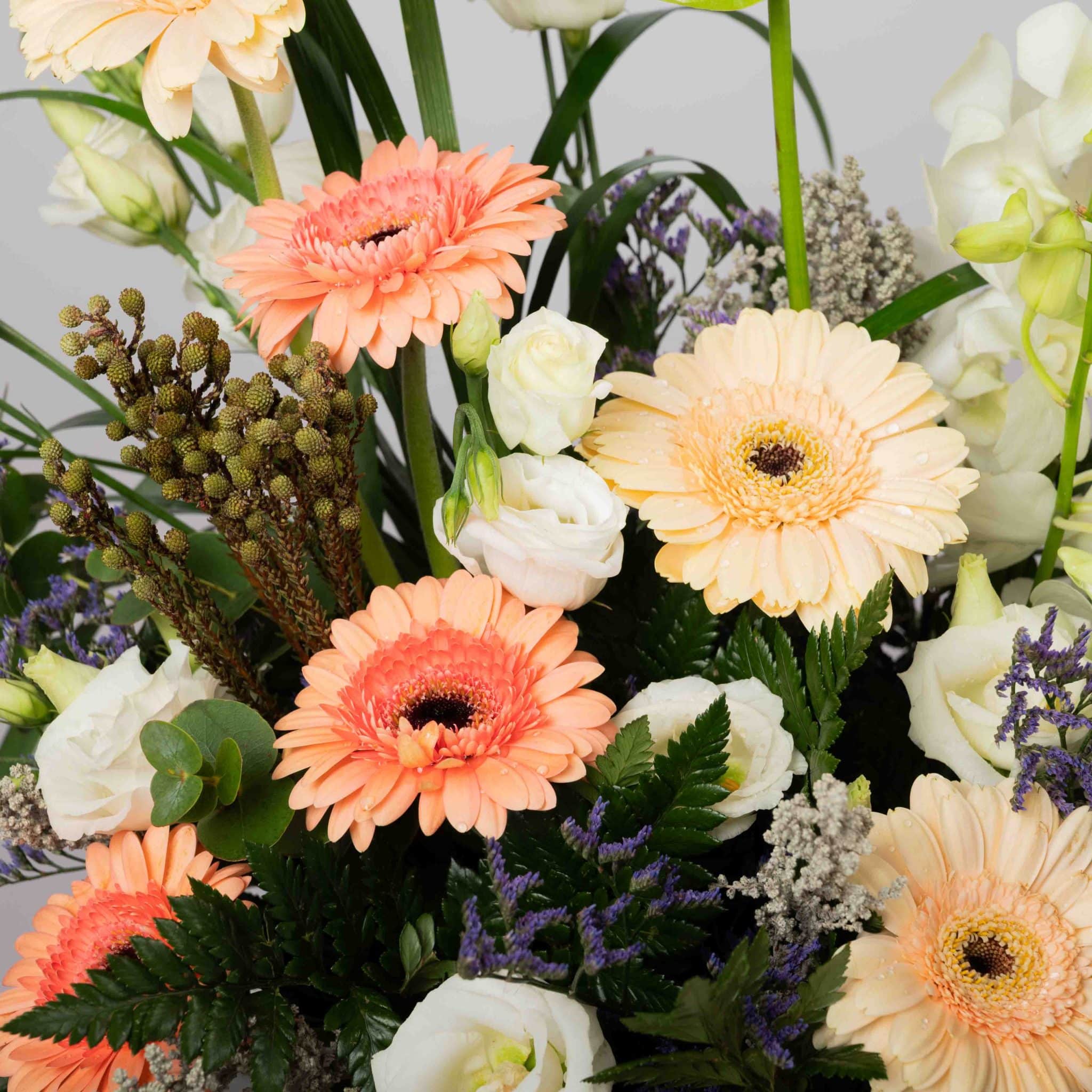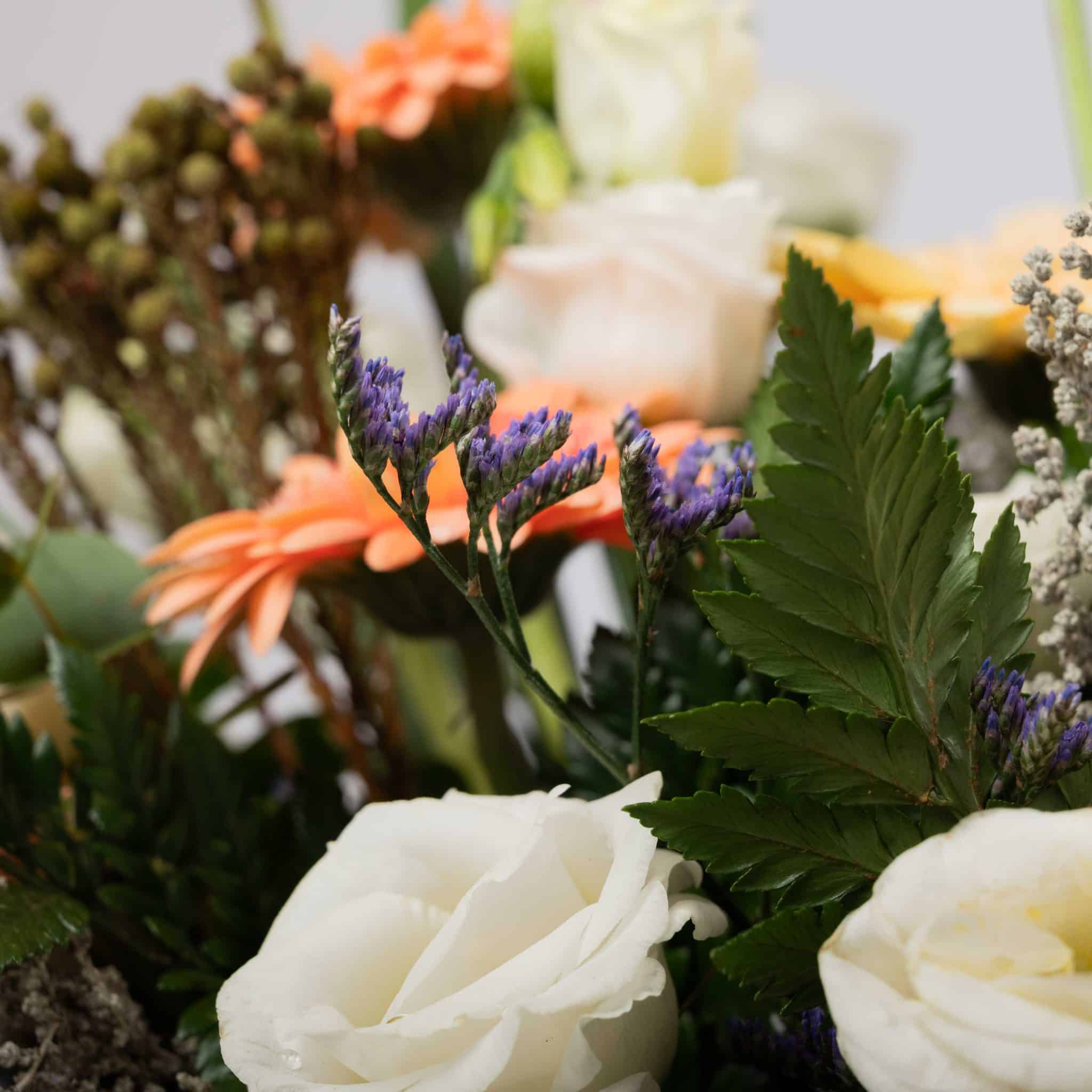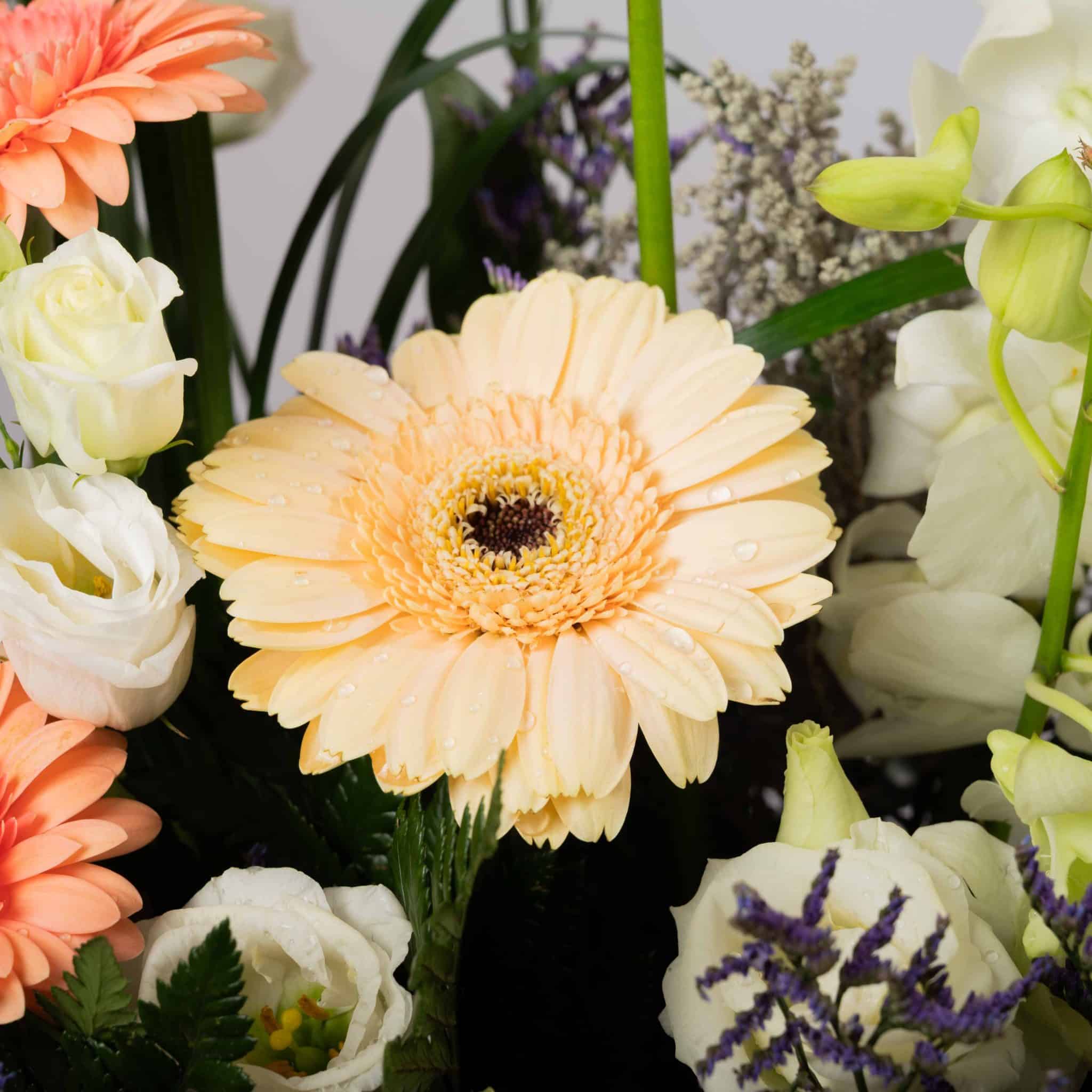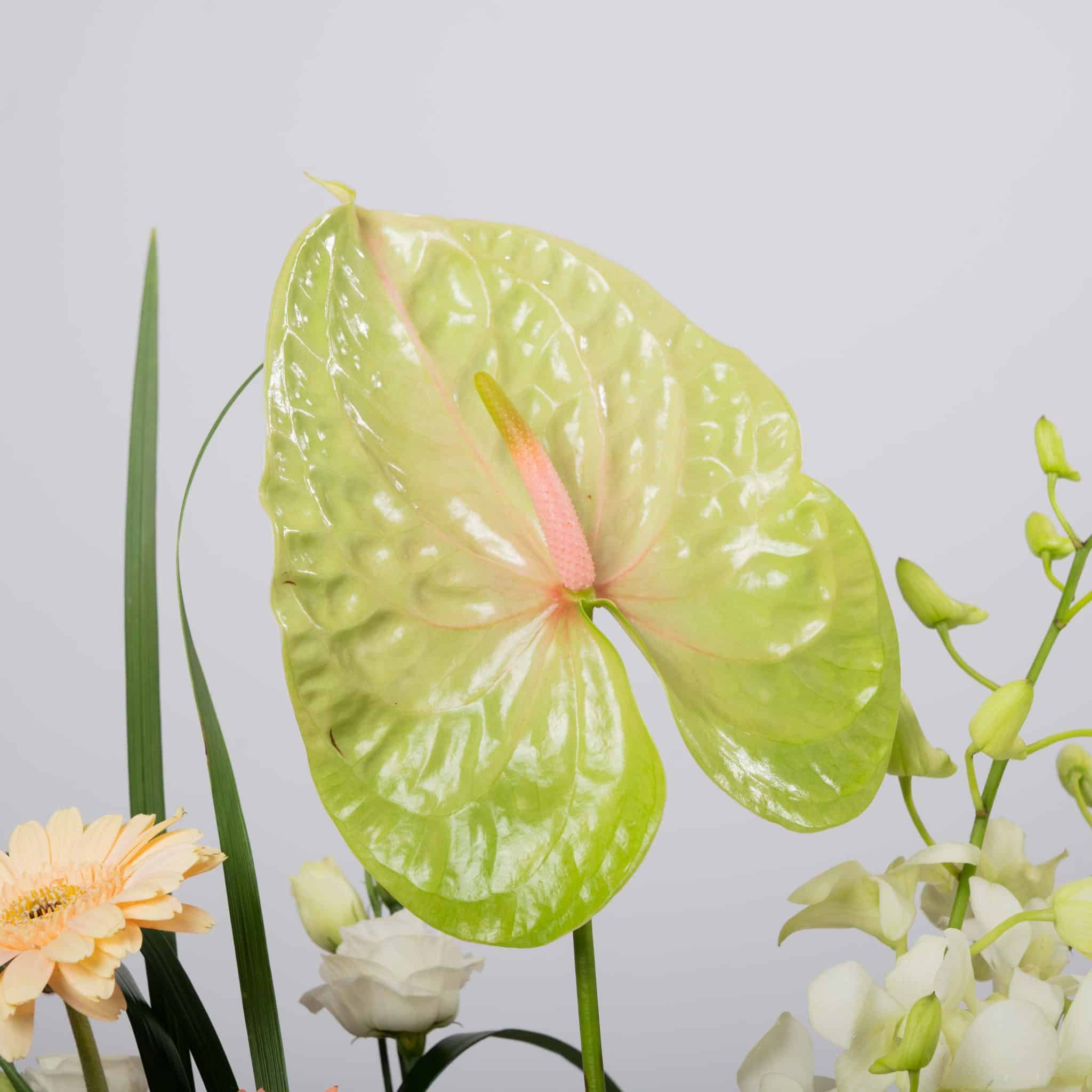يجسّد باستيل ميدو رقة مرج ربيعي مليء بالأزهار. تتداخل الورود البيضاء مع أوركيد ناصع وجربيرا بدرجات الخوخي والمرجاني، يحيط بها زهور ناعمة وأوراق الأوكالبتوس وأنثوريوم أخضر فاتح داخل مزهرية ذهبية على شكل وعاء مزينة بشريط عنبري من بلومن. تنسيق هادئ وأنيق مثالي لاستقبال الضيوف، وتزيين طاولات الطعام، أو لتقديمه كهدية تضيف لمسة من الفخامة والانتعاش الرقيق.