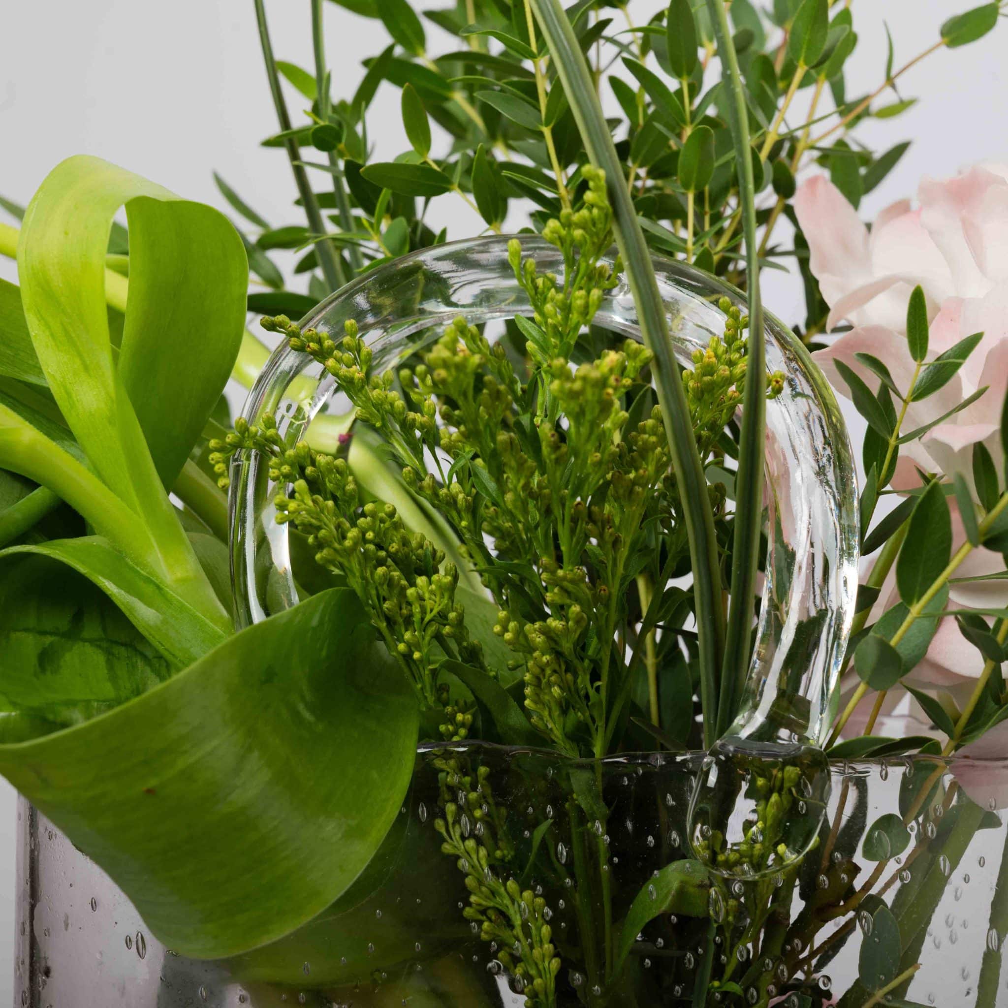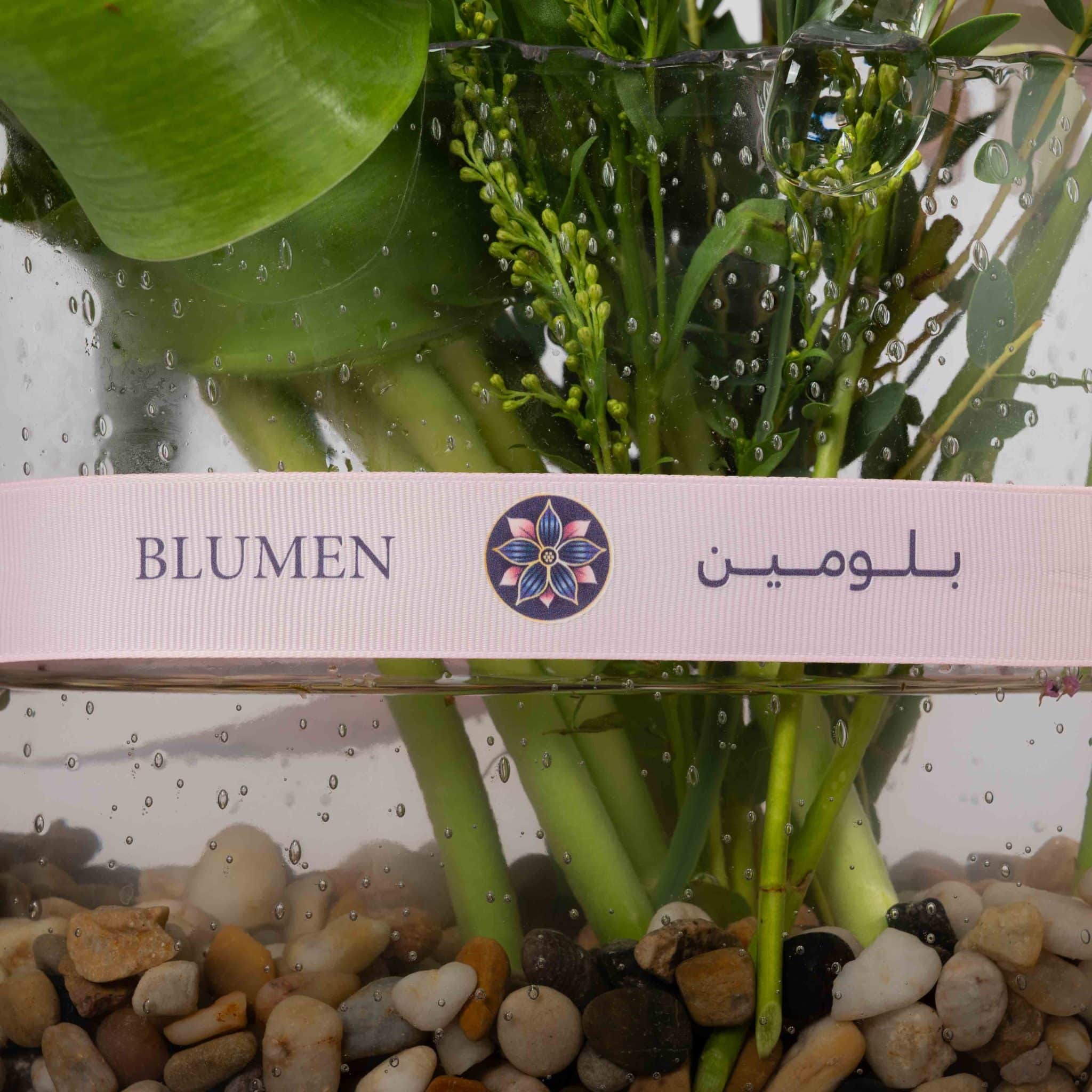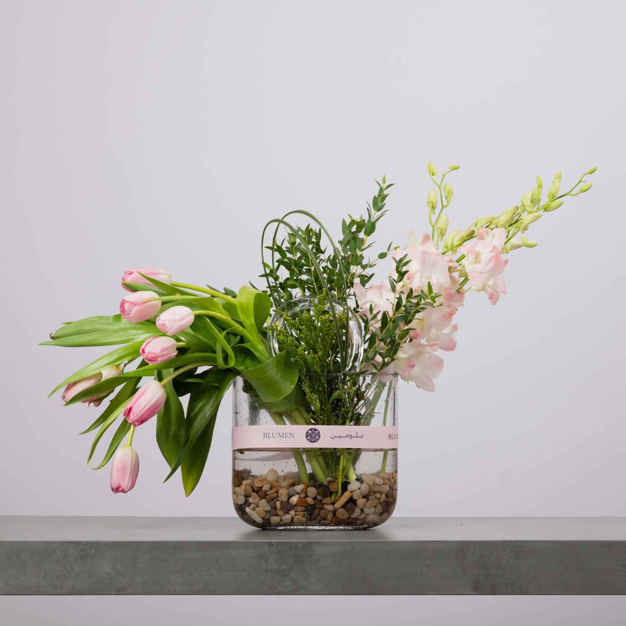 يمنح بلاشينغ بيبلز إحساس حديقة صغيرة على ضفة نهر محبوسة داخل زجاج. تتدلّى أزهار التوليب الوردية برقة على جانب واحد، بينما ترتفع الزهور الوردية الناعمة مع الخضار الطبيعي من قاعدة من الماء والحصى الطبيعية، وتكتمل اللمسة بشريط وردي رقيق من بلومن. تصميم عصري وخفيف مثالي لطاولات السرير والمكاتب أو كهدية أنيقة تهمس بالهدوء والرقة.