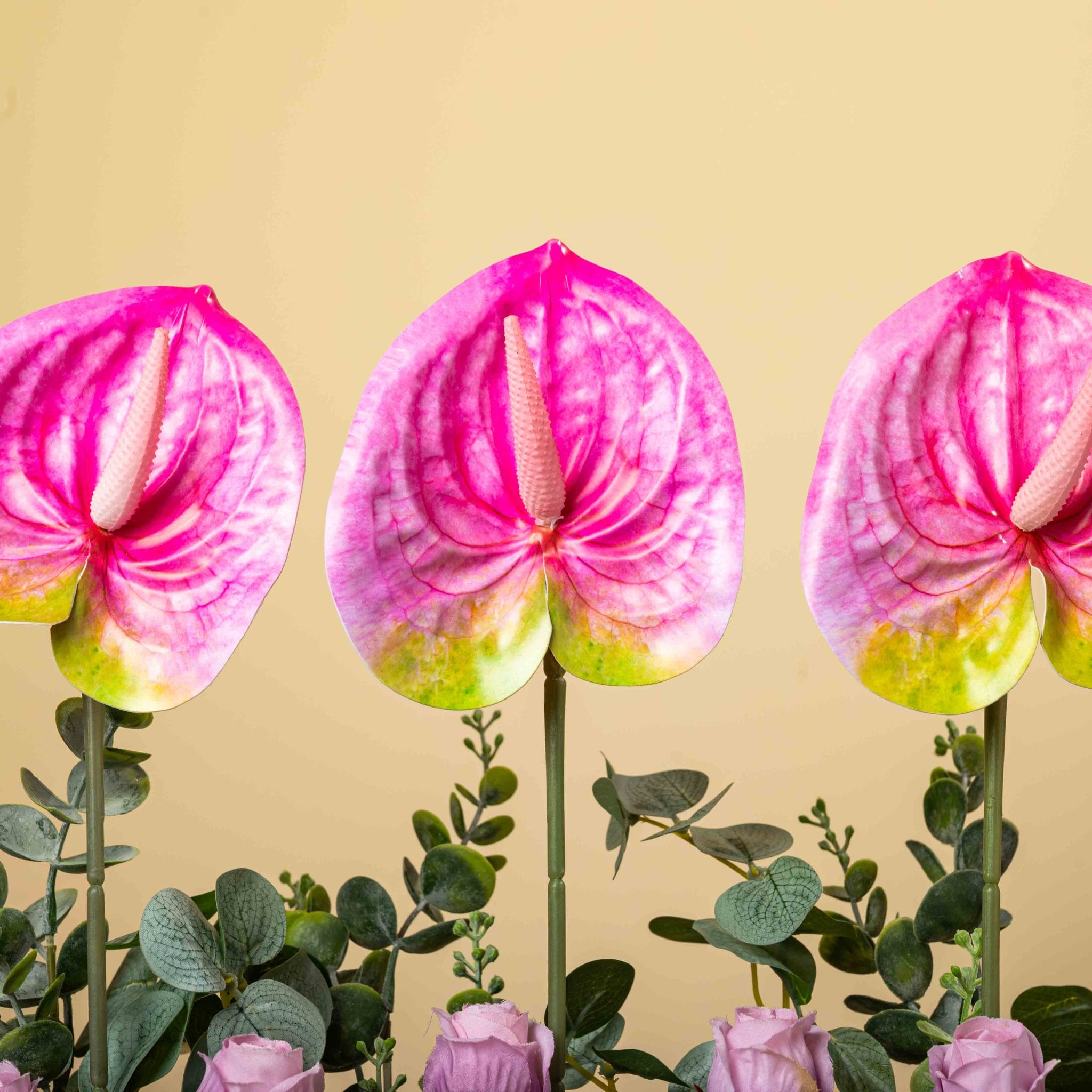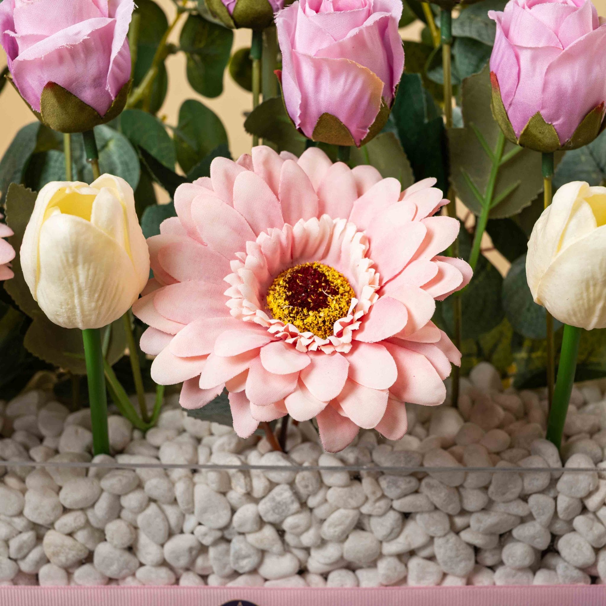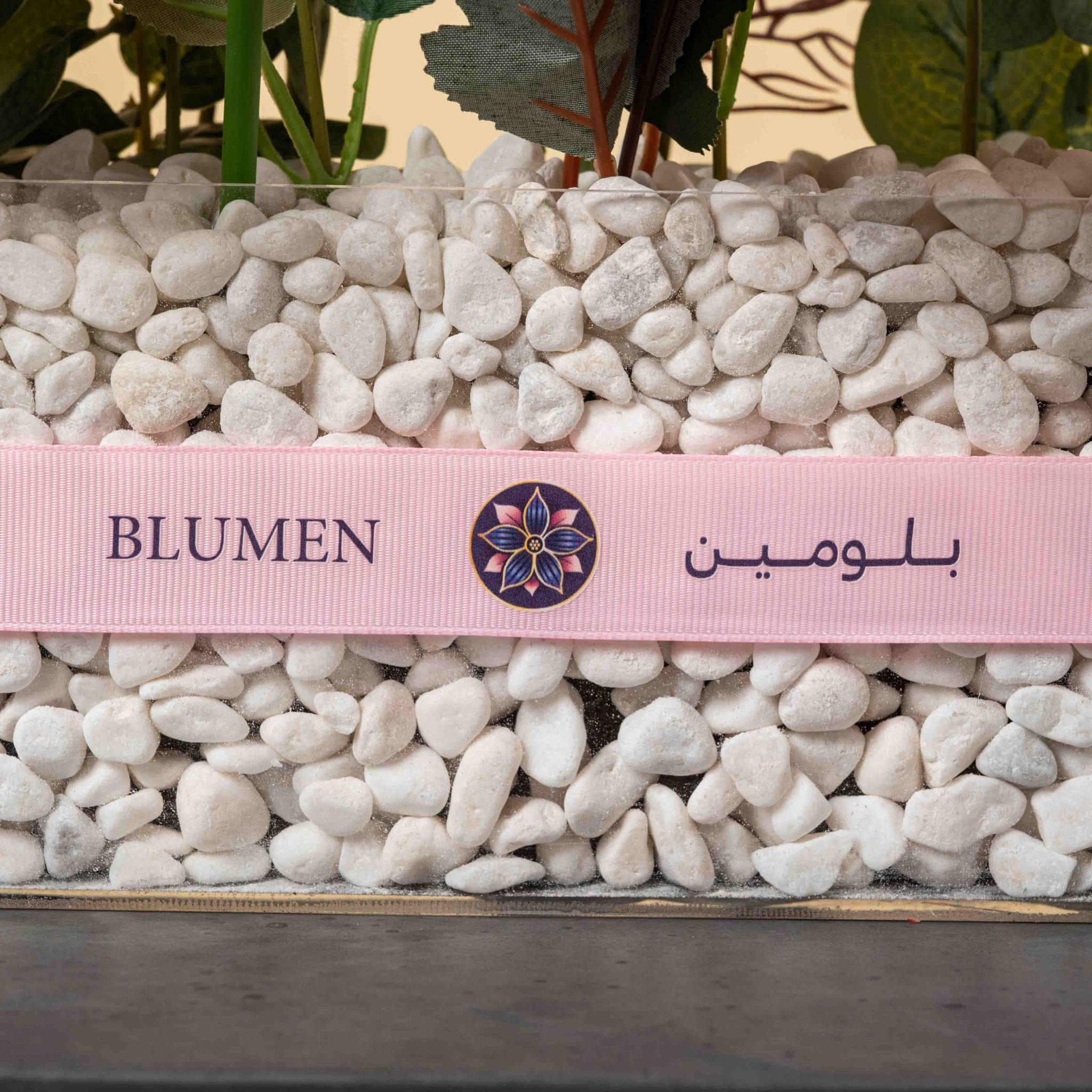 يقدّم بلش باريد استعراضاً مبهجاً من الأناقة الوردية. تتقدّم أزهار الأنتوريوم المتدرجة بين الوردي والأخضر في الأعلى كصف موكب، تعلو صفوفاً من الورود الوردية الناعمة والجربيرا الوردية والتوليب الأبيض، فوق طبقة من الحصى البيضاء المزينة بشريط وردي من بلومن. تصميم راقٍ ومرِح في الوقت نفسه، مثالي لطاولات الضيافة والاستقبالات والمناسبات التي تبحث عن لمسة باستيلية أنيقة.
