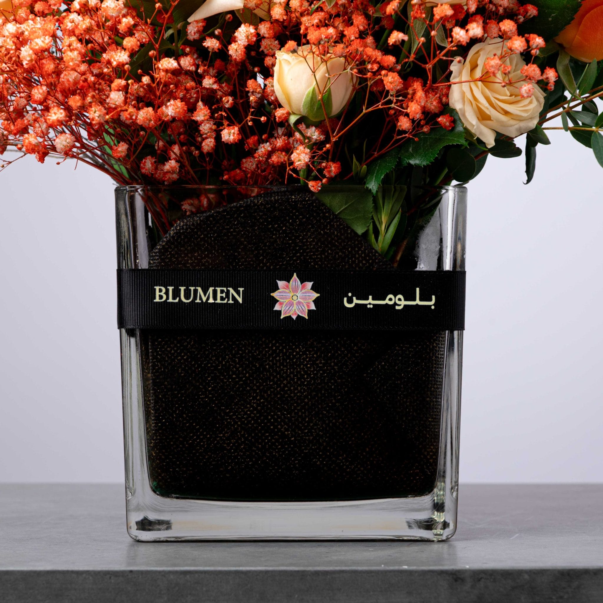 موضوع في مزهرية زجاجية مربعة بشريط بلومن الأسود الفاخر، ما يمنحه حضوراً قوياً ومميزاً في أي مساحة.