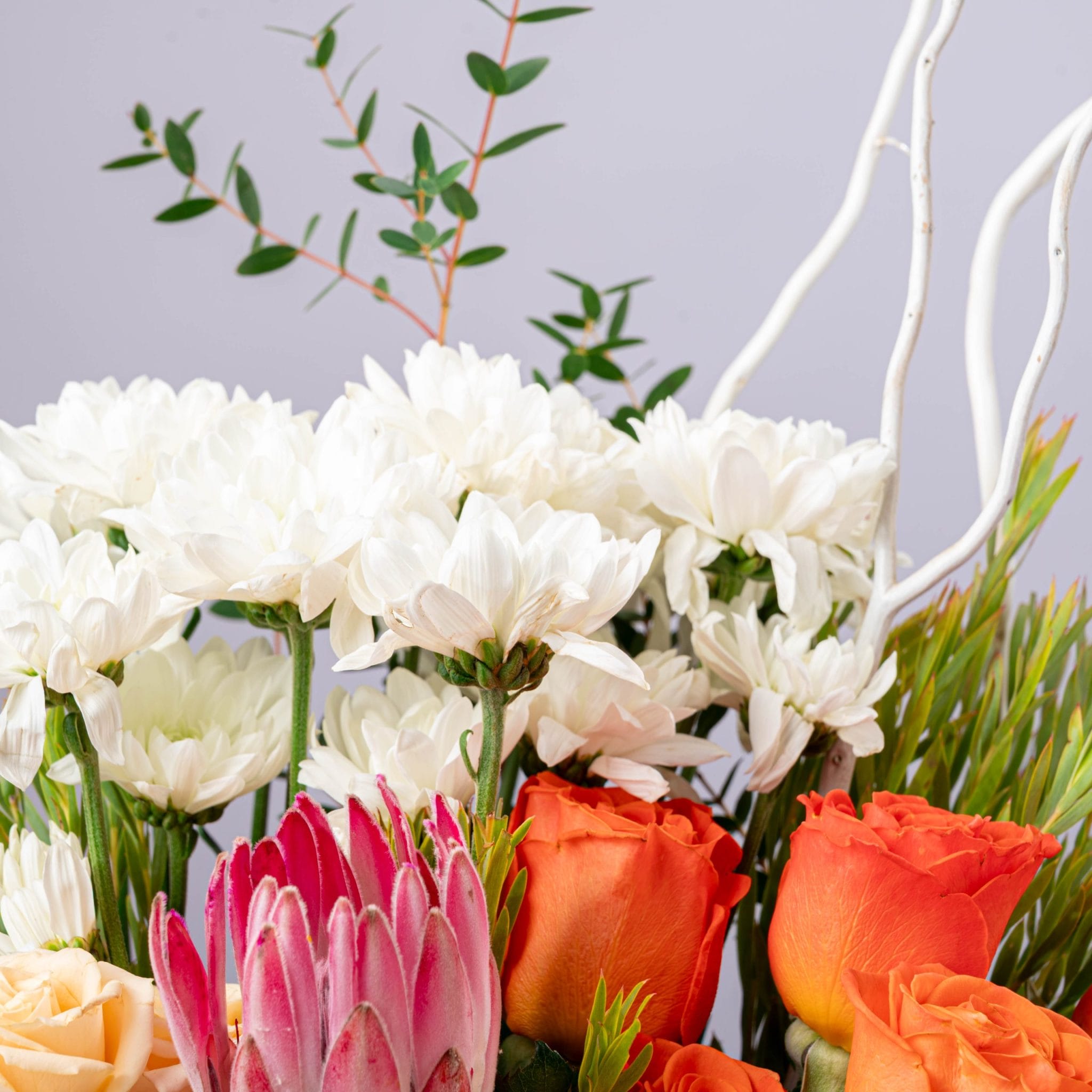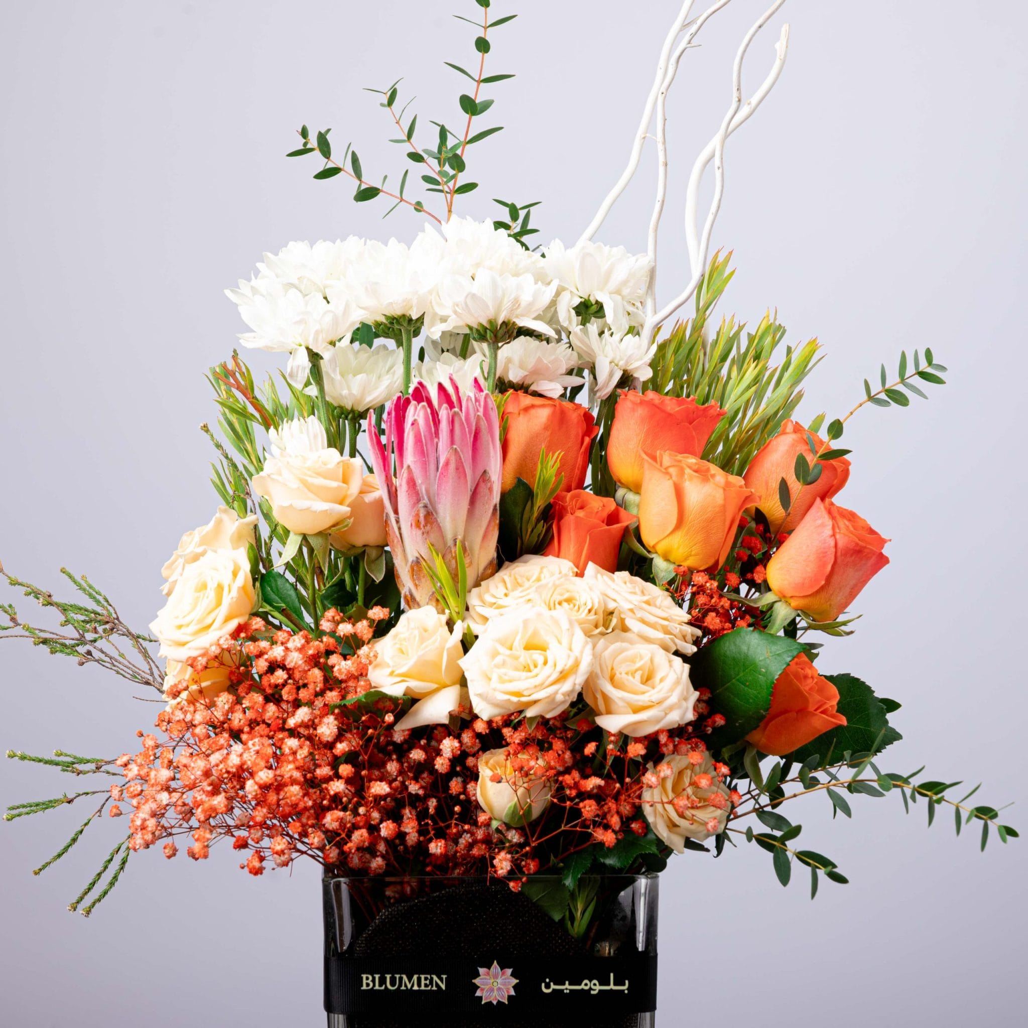 يتألق بمزيج من الورود البرتقالية النابضة بالحياة والزهور الكريمية الراقية، مع لمسات من الزهور البيضاء والبروتيا الوردية التي تضيف بعداً فنياً فريداً.