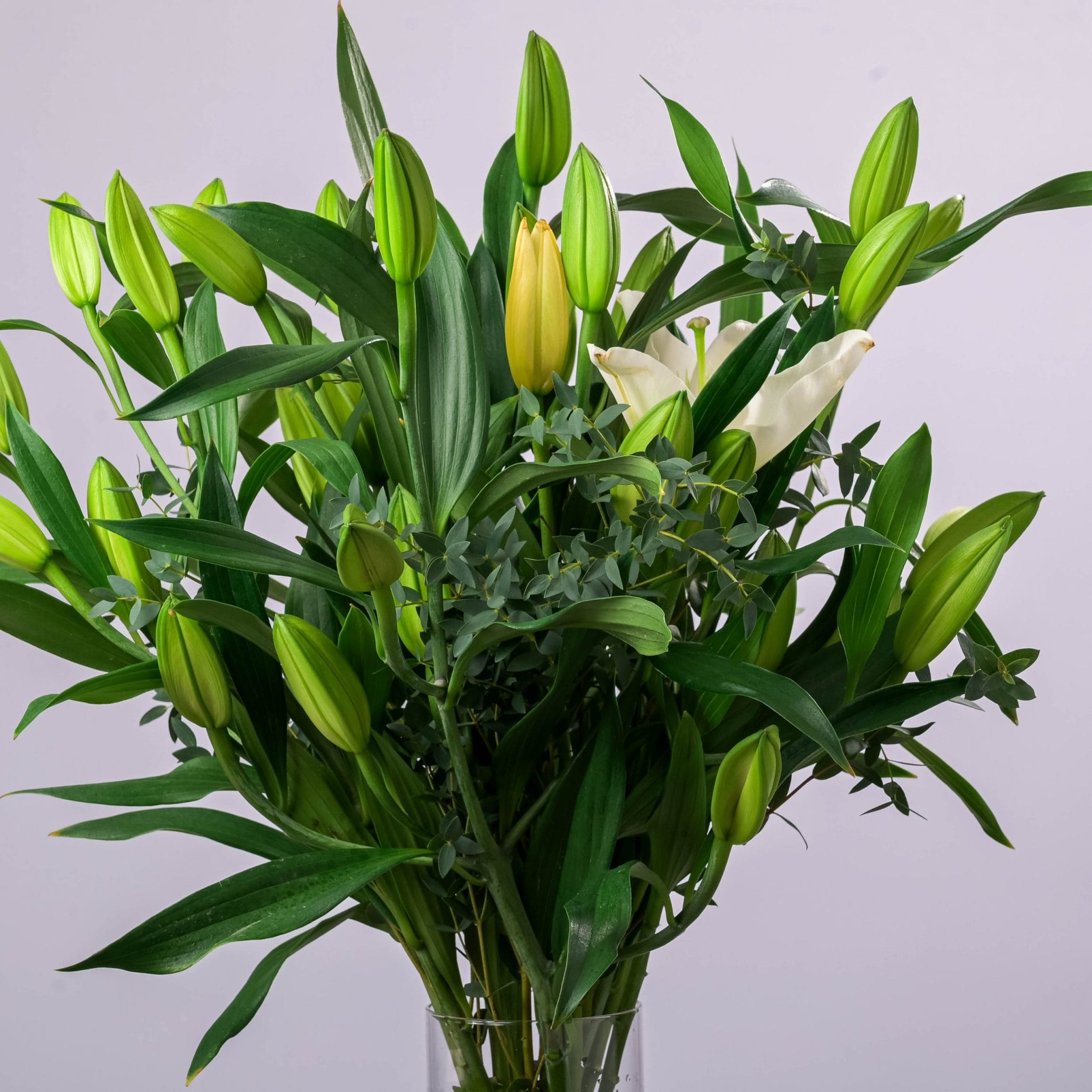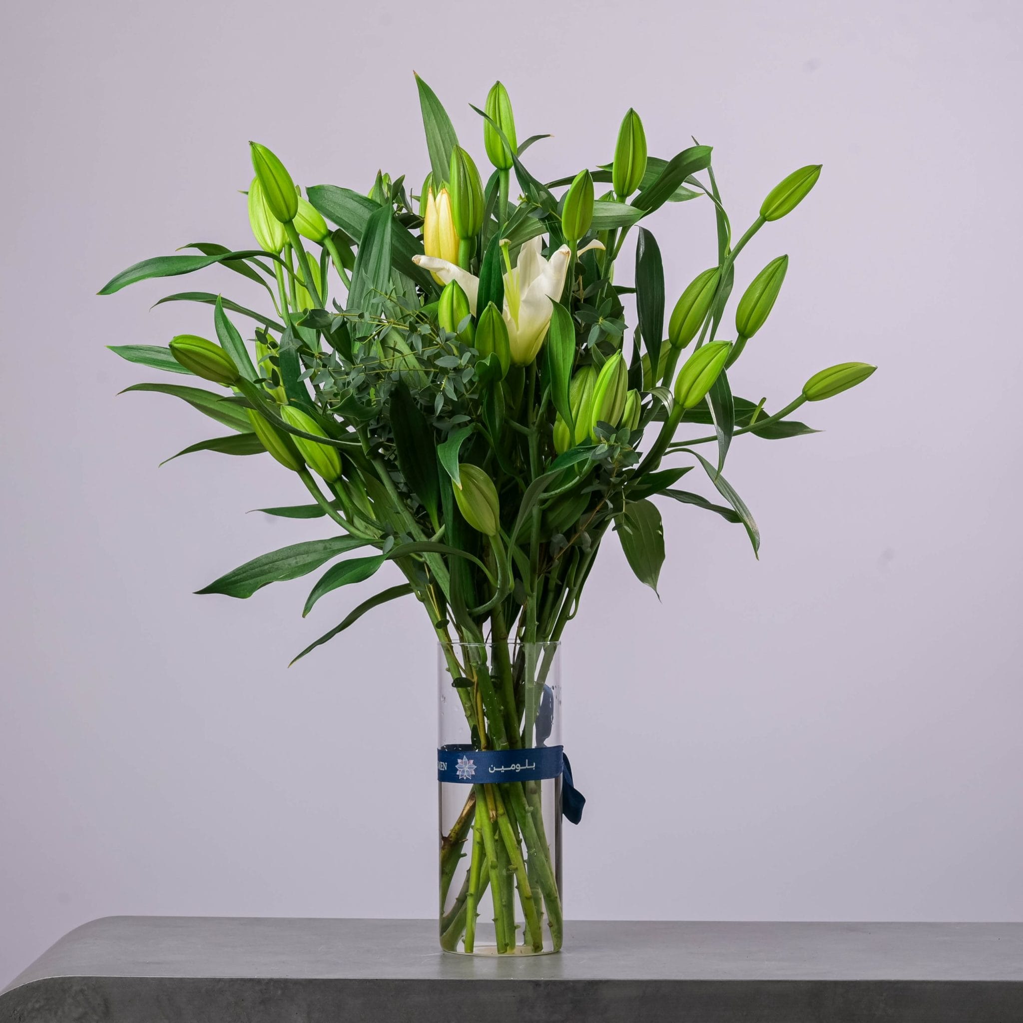 يتكوّن من براعم الزنبق الأبيض الفاخرة وأوراق خضراء طبيعية منسّقة بعناية داخل مزهرية زجاجية أسطوانية طويلة تحمل شريط BLUMEN | بلومن الأزرق الأنيق.