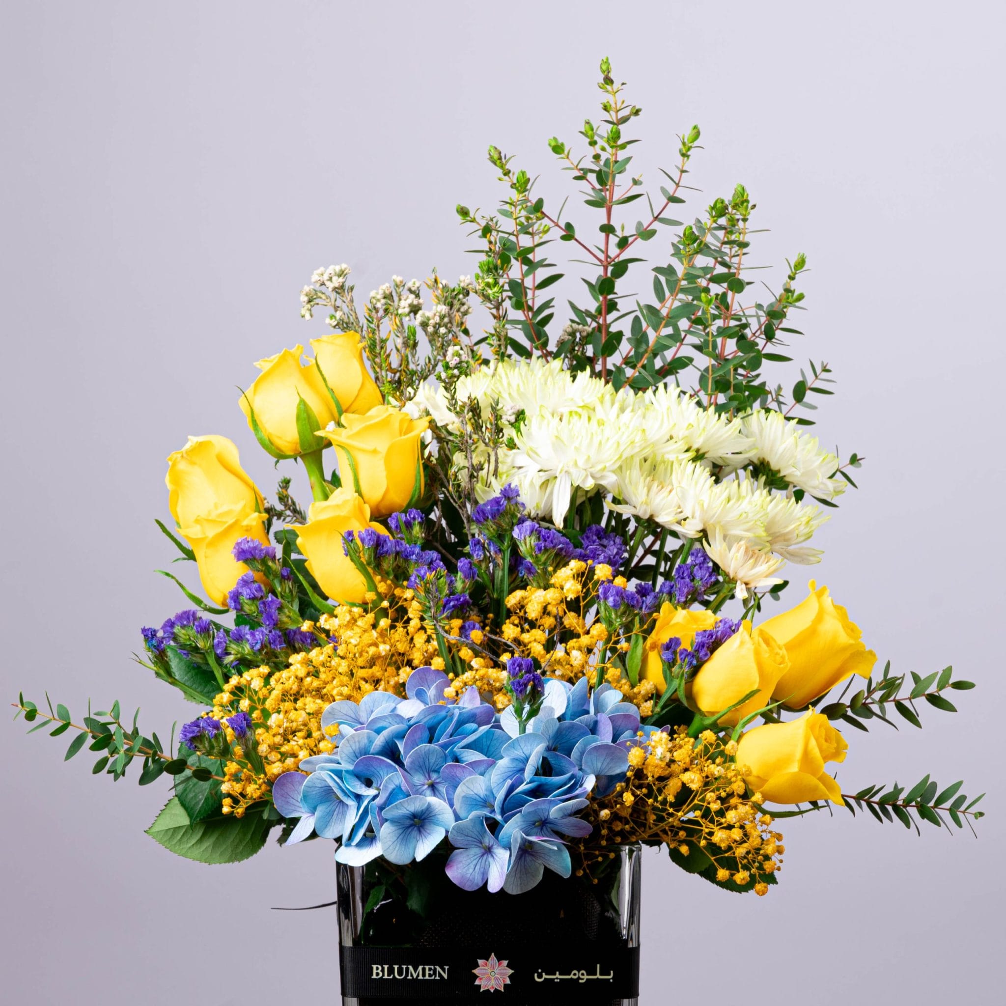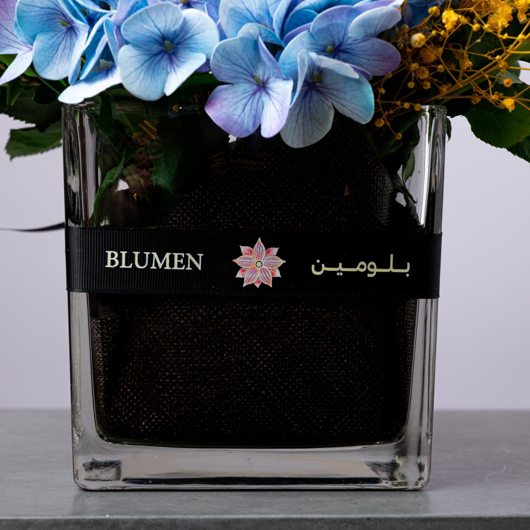 يأتي التنسيق داخل مزهرية زجاجية مربعة شفافة تحمل شريط BLUMEN | بلومن الأسود الفاخر، مما يضفي عليه لمسة من الأناقة الحديثة.