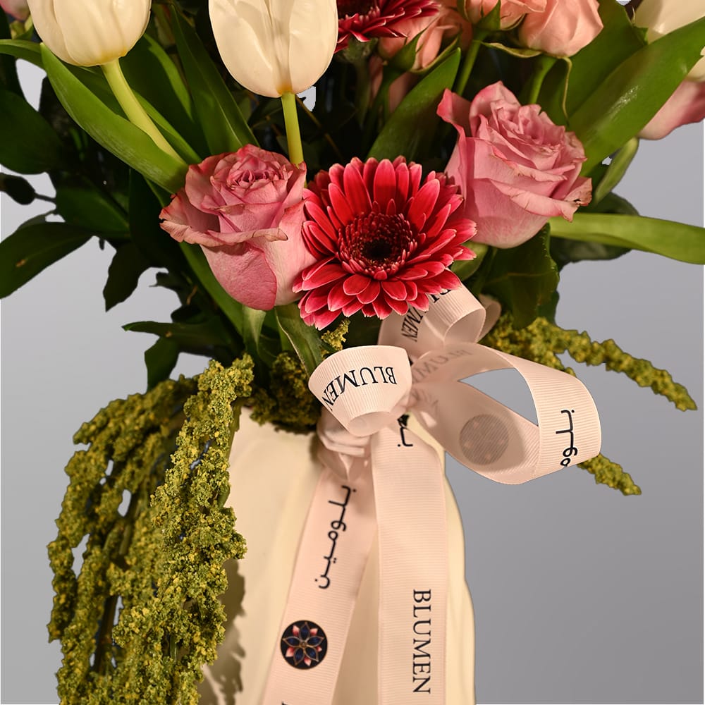 ذا فيلفت ويسبر هو تنسيق زهري شاعري يجمع بين الملمس الناعم والألوان الرومانسية الغنية. تم ترتيب كل زهرة بعناية لخلق إحساس بالحركة والانسيابية، بينما تضيف المزهرية الفنية والأوراق المتدلية لمسة جمالية مميزة. مثالي للتعبير عن المشاعر الهادئة، ويحوّل أي مساحة إلى لوحة من الجمال الراقي والسحر الهادئ.