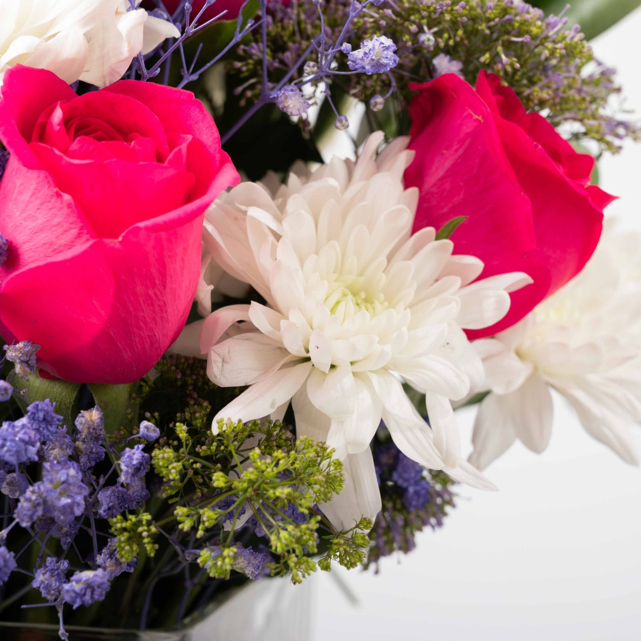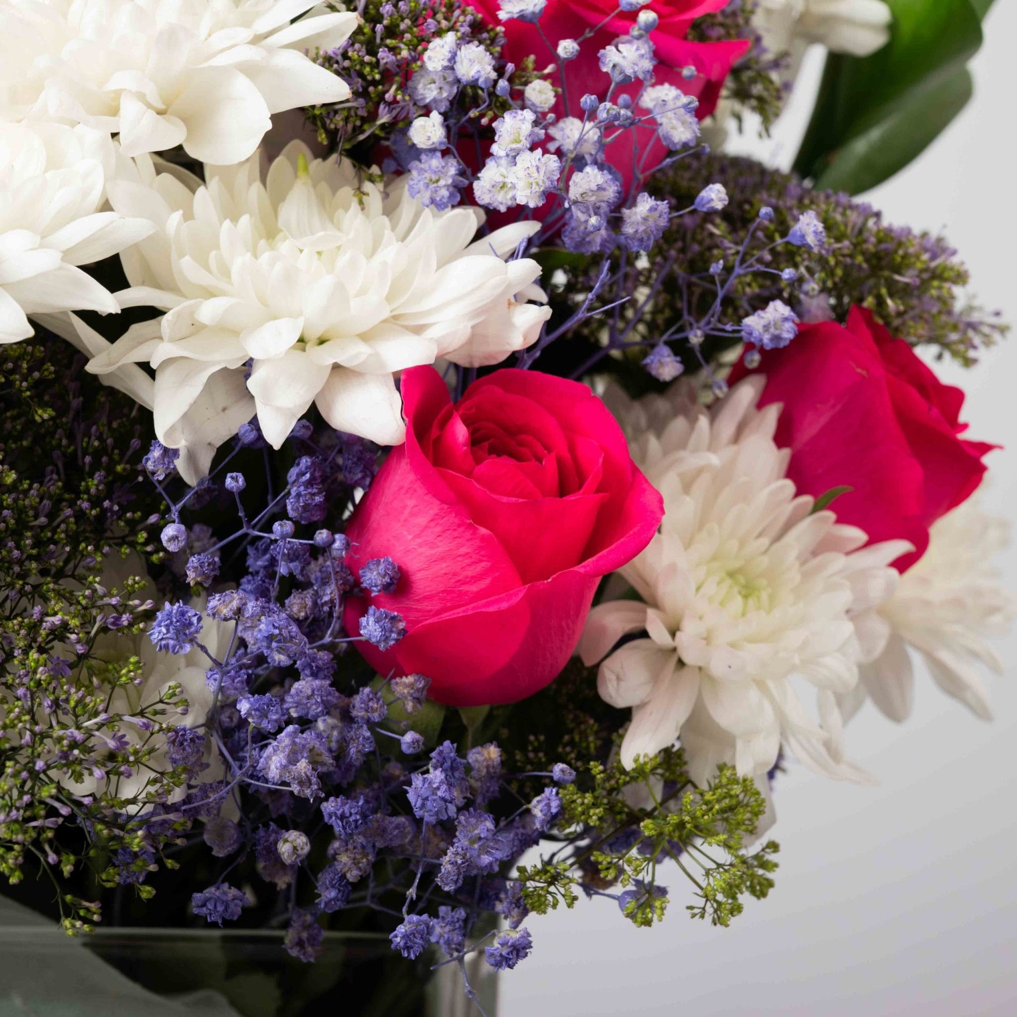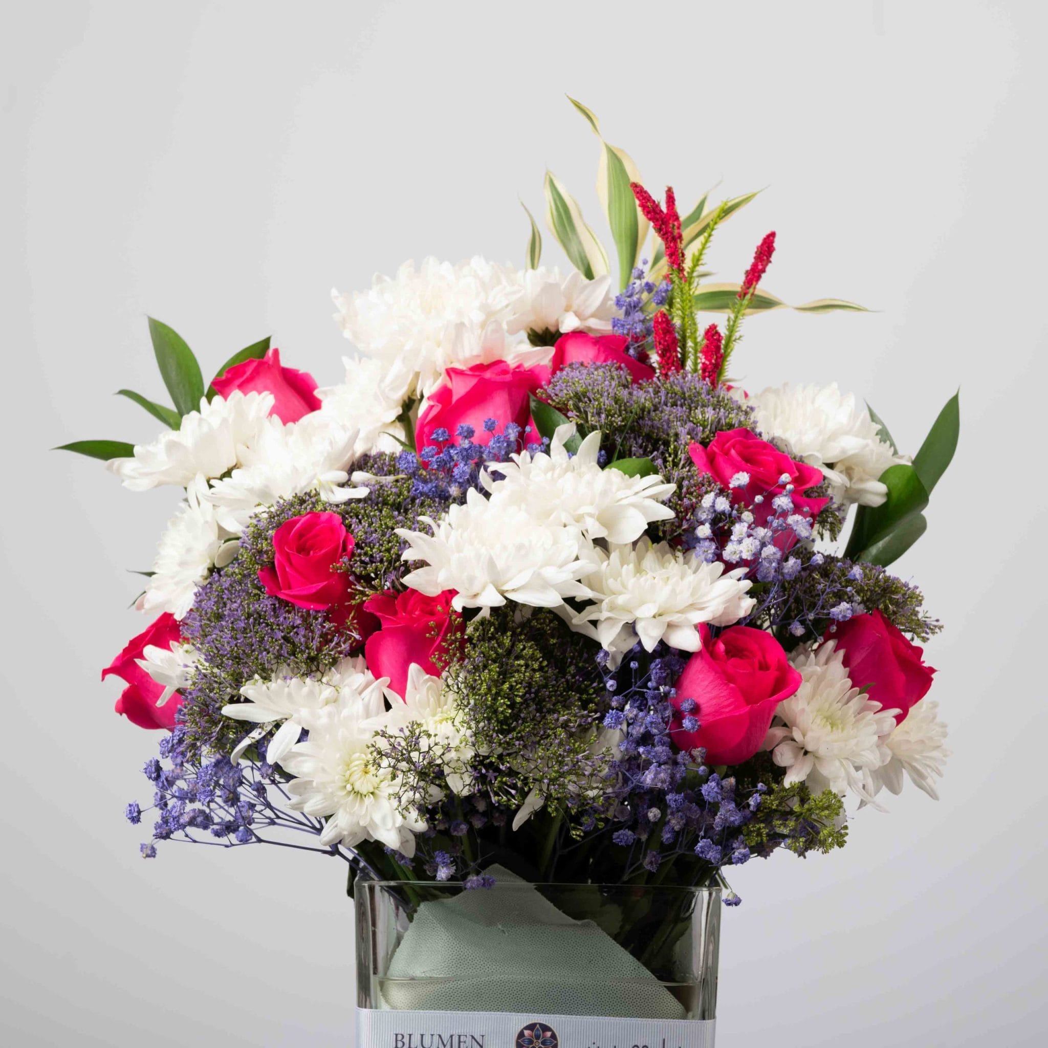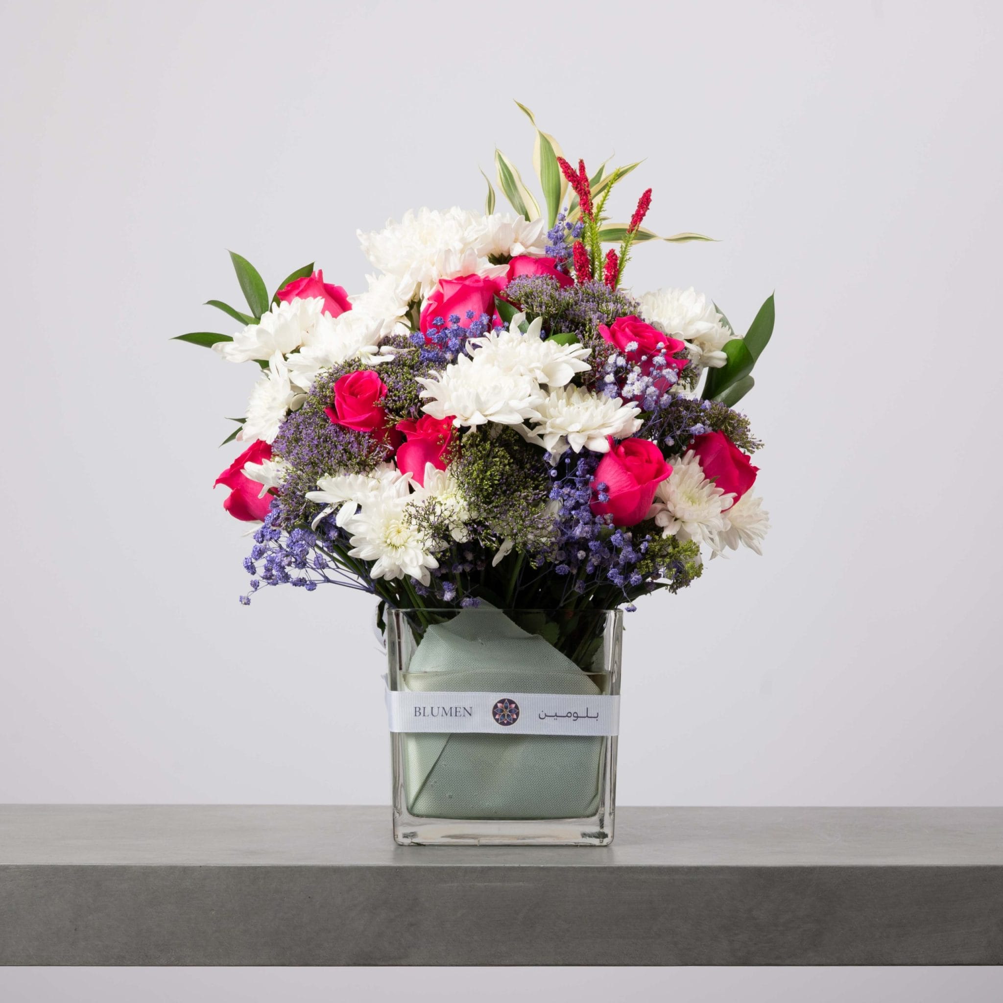 مزيج متوازن وأنيق من الورود الفوشيا الزاهية، والأقحوان الأبيض، ولمسات اللافندر الناعمة داخل فازة زجاجية مربعة من بلومن.