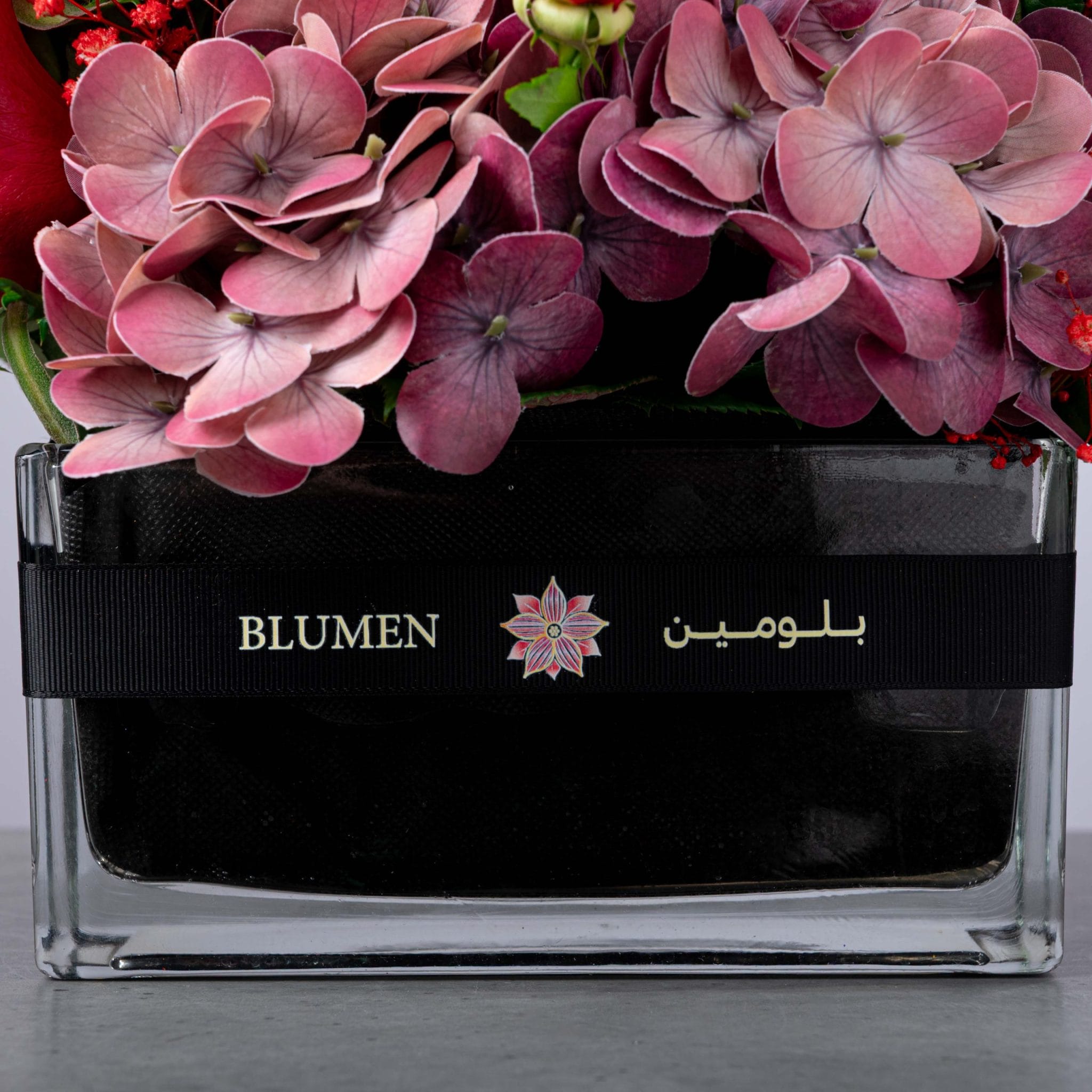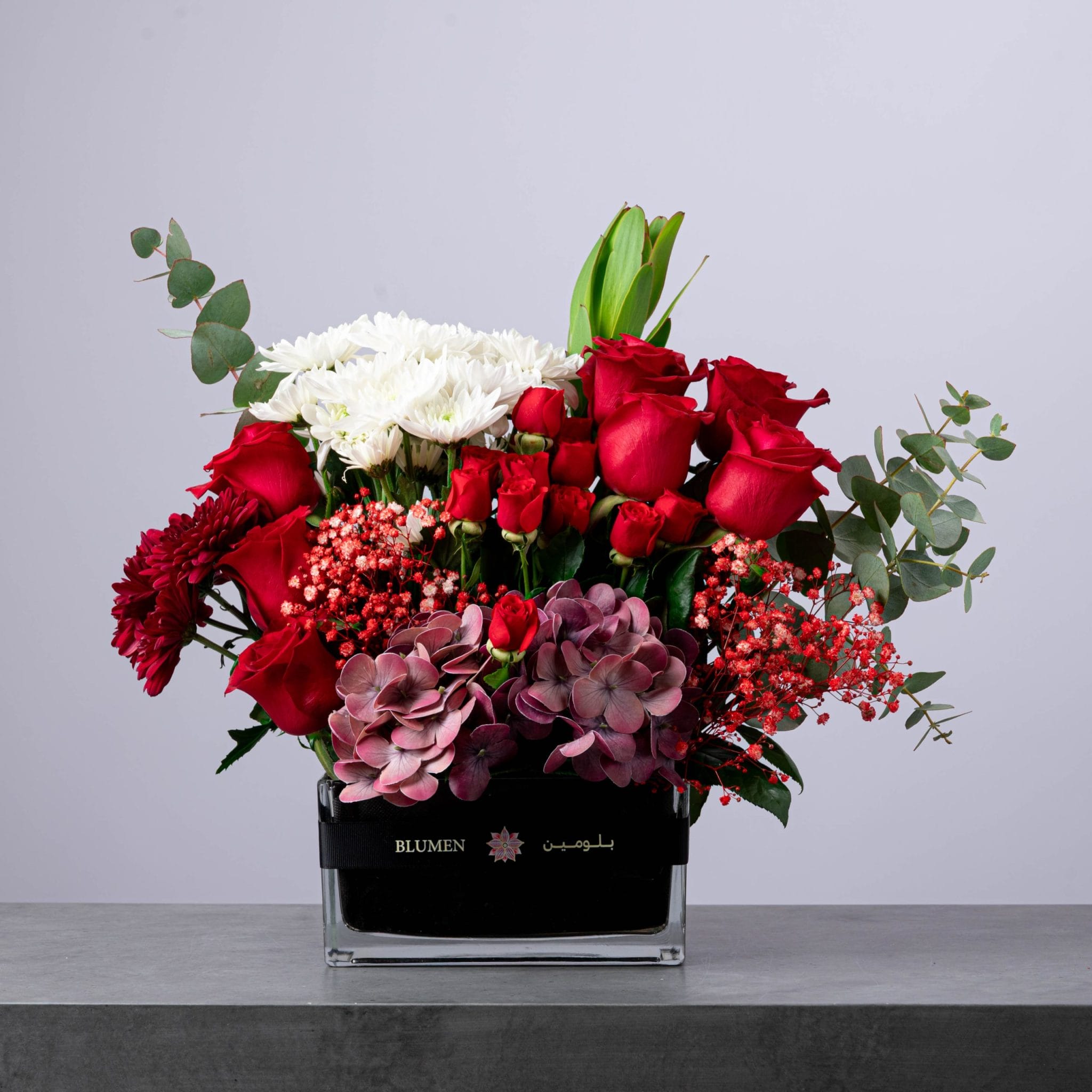 موضوع في مزهرية زجاجية مستطيلة سوداء بتوقيع بلومن، ليعكس مزيجاً متناغماً من الحب، القوة، والرقي الأبدي.