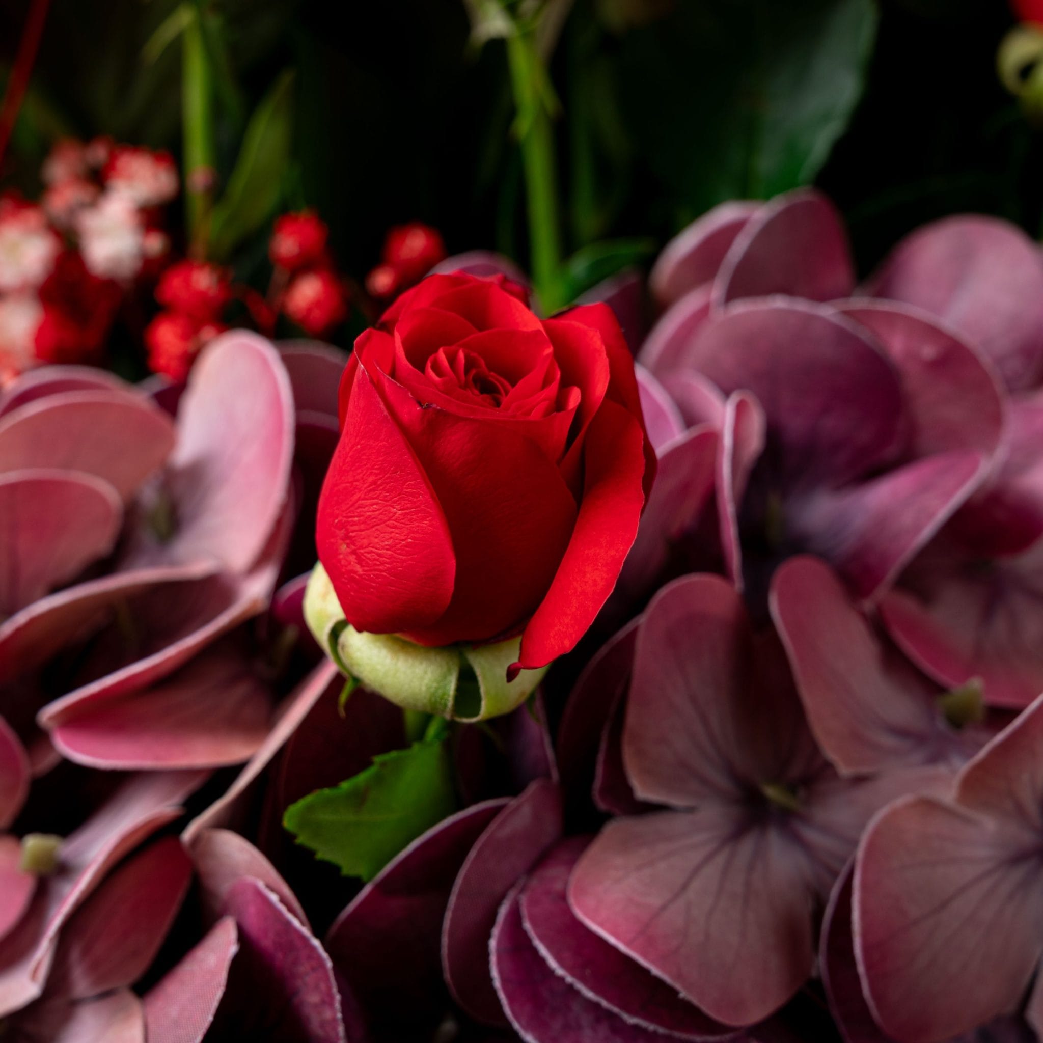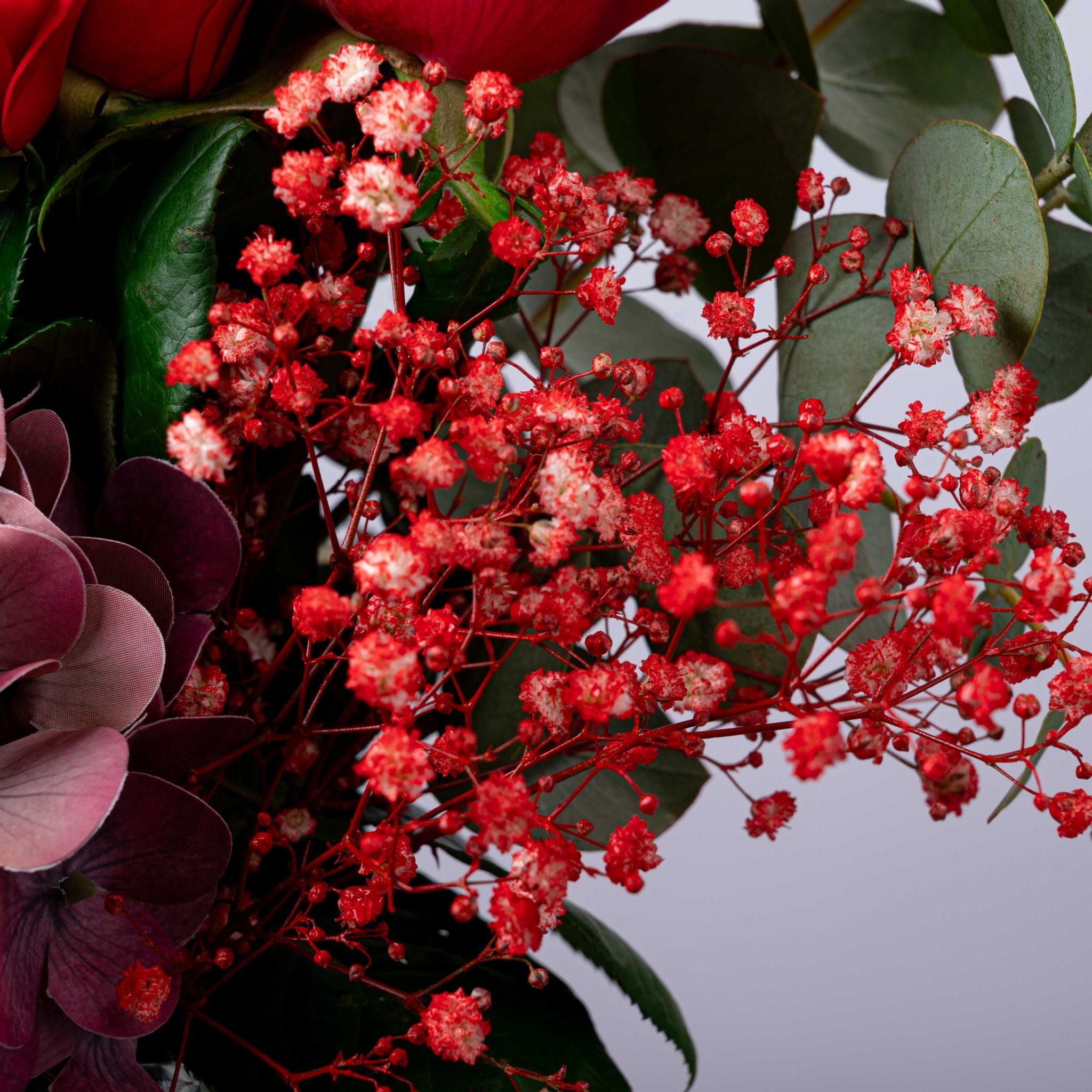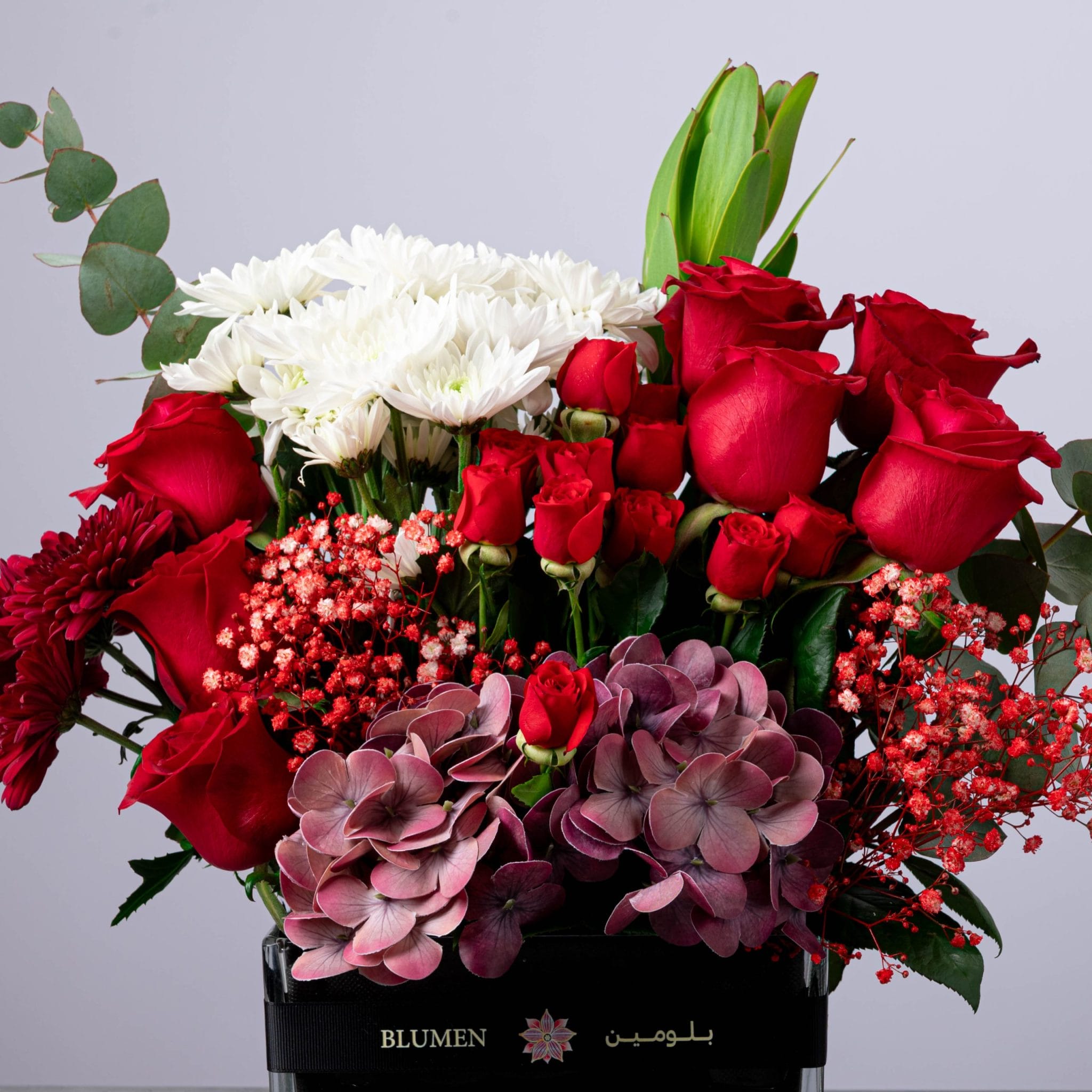 تنسيق فاخر من بلومن يجمع بين الورود الحمراء المخملية وزهور الكريزانتيم البيضاء، تتخللها لمسات من الهدرانجيا البنفسجية الفاتحة والأوكاليبتوس الأخضر لإضفاء توازن طبيعي وأناقة راقية.