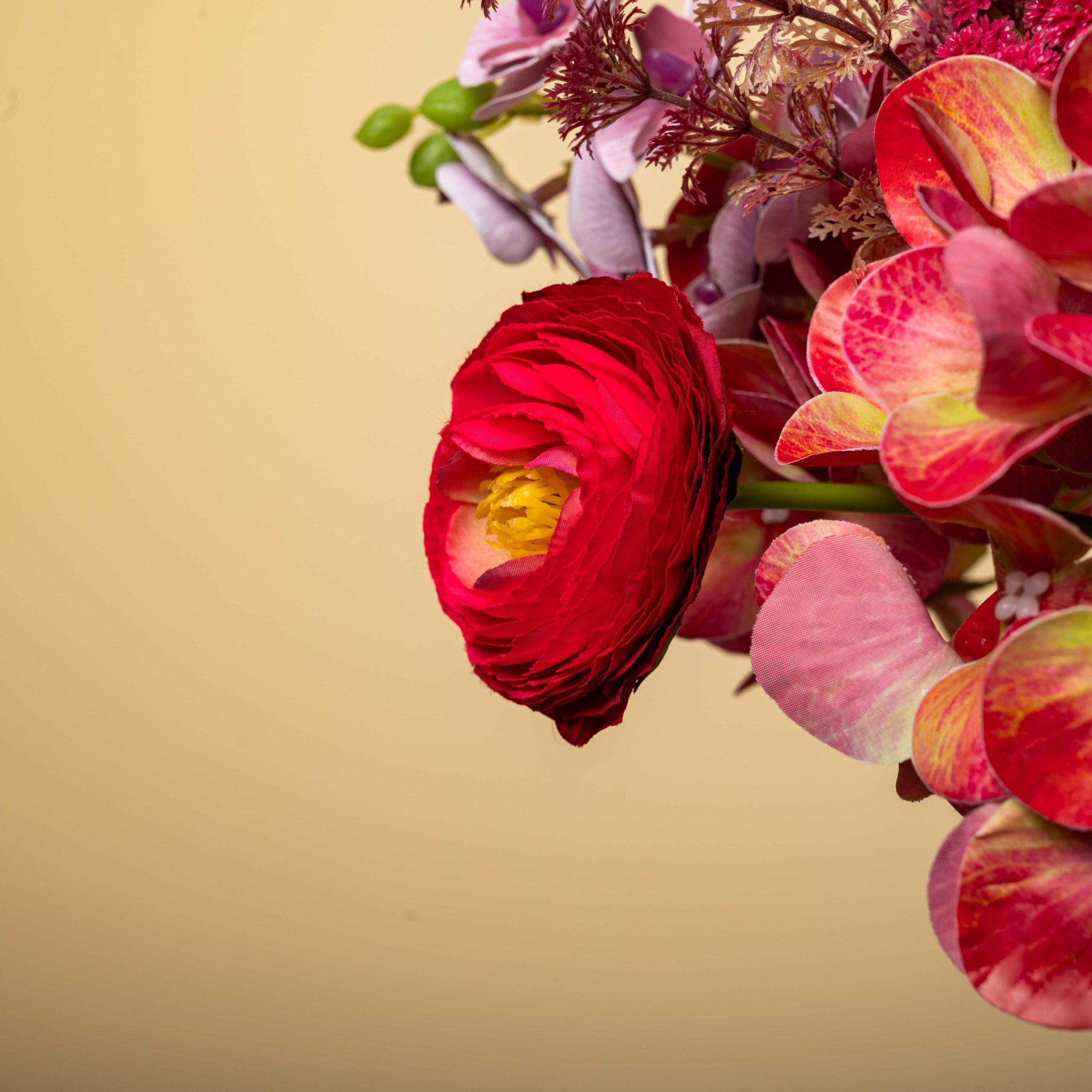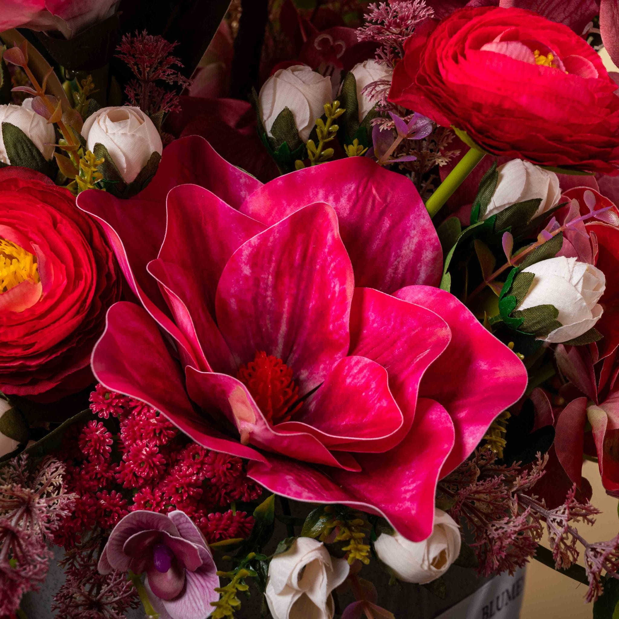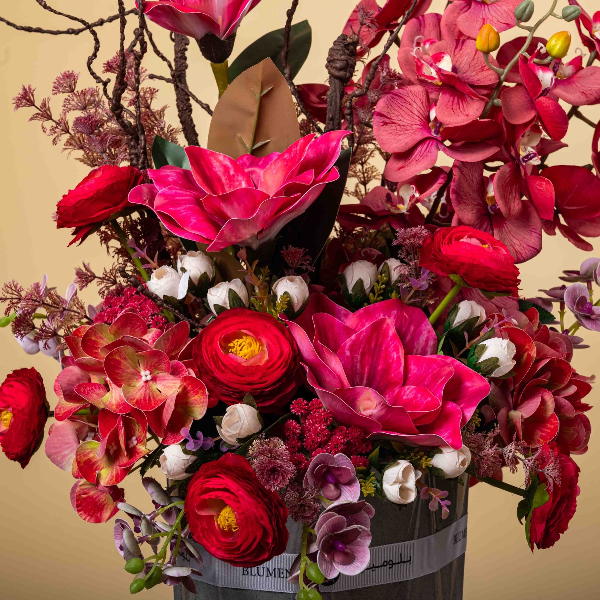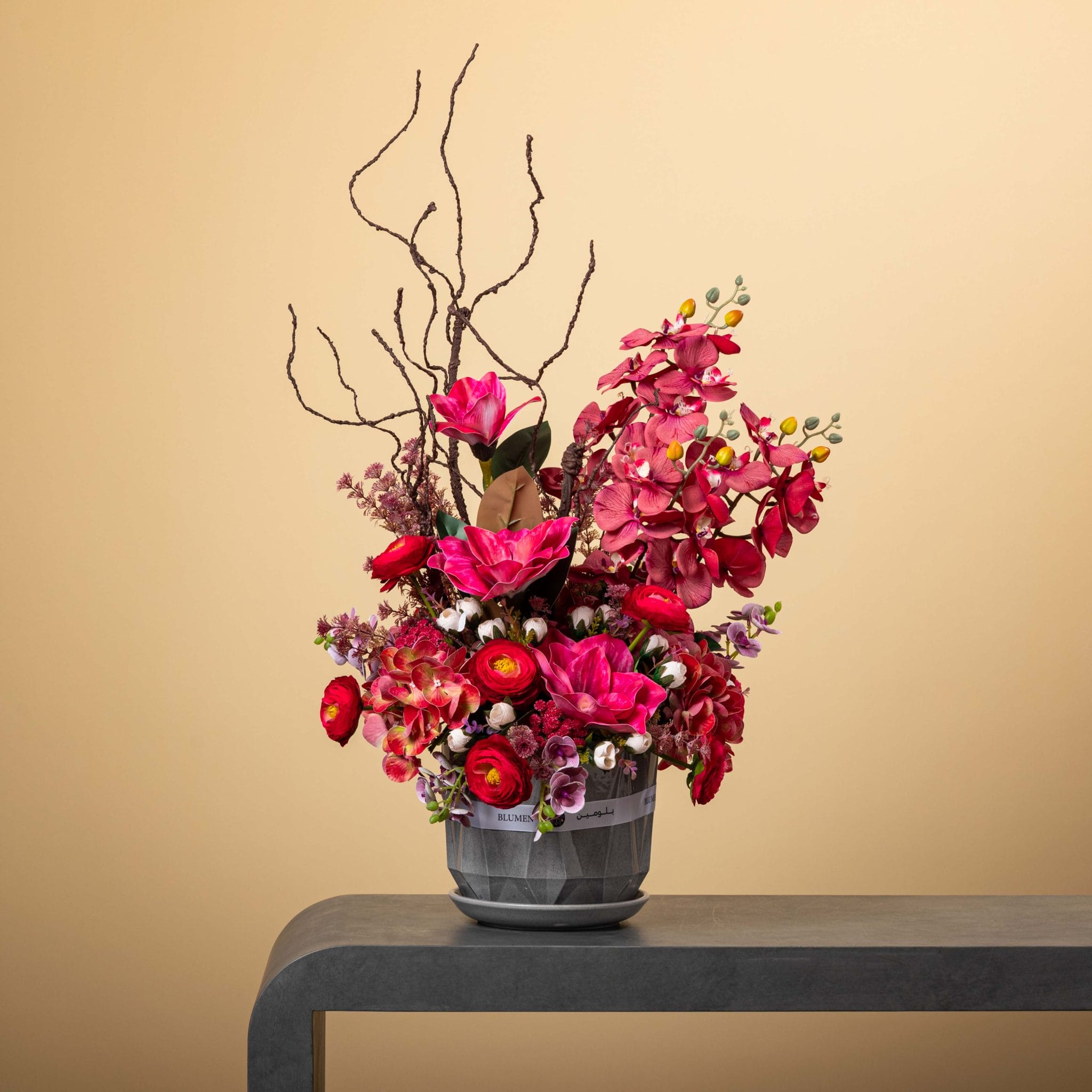 من تشكيلة ربيع/صيف 2025، يجمع هذا التنسيق الجريء بين حيوية الربيع ورومانسية الصيف في قطعة واحدة لافتة. تتداخل طبقات من الأزهار الفوشيا والوردية العميقة – من أوركيد وراننكولس وأزهار موسمية متنوعة – داخل مزهرية رمادية هندسية، وتتوجها فروع ملتوية مجسّمة تضيف ارتفاعًا وحركة. تنسيق غني، عصري ومفعم بالحياة، مثالي للمداخل، غرف الجلوس، والمناسبات التي تحتاج إلى ألوان نابضة وأناقة معاصرة.