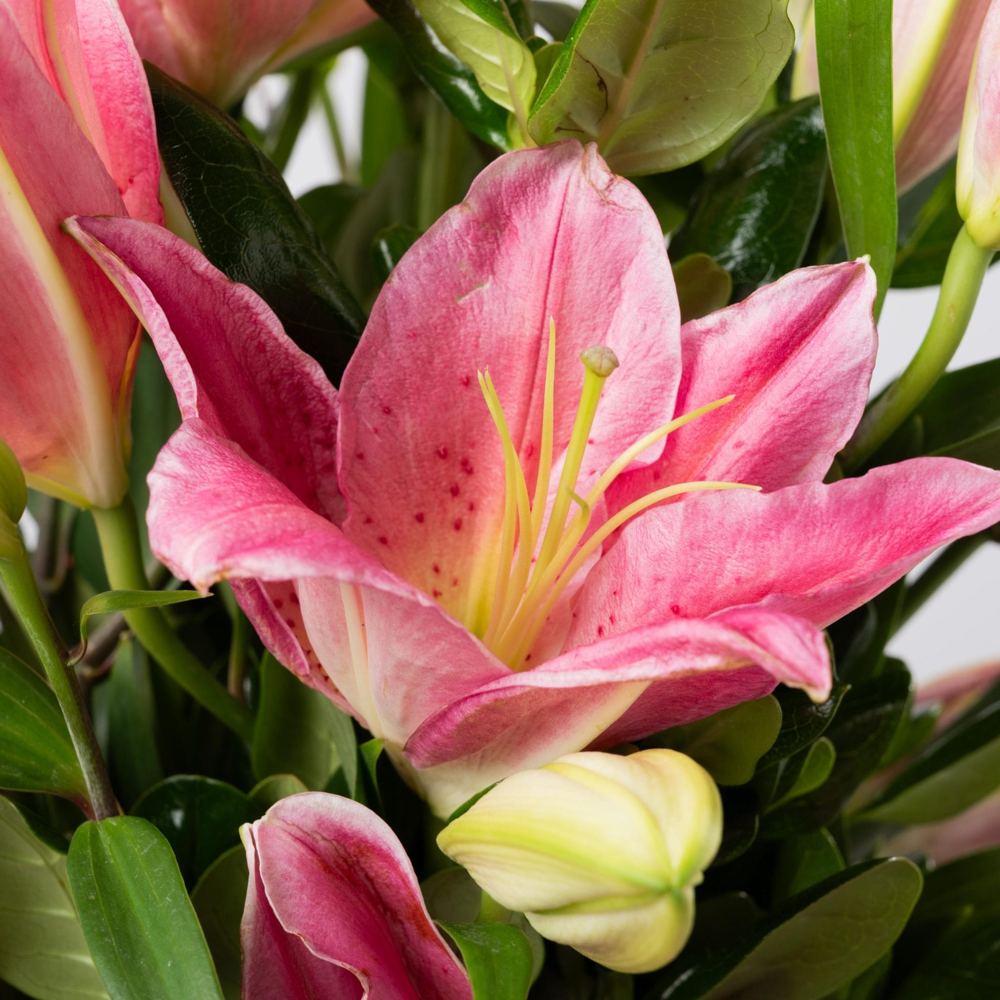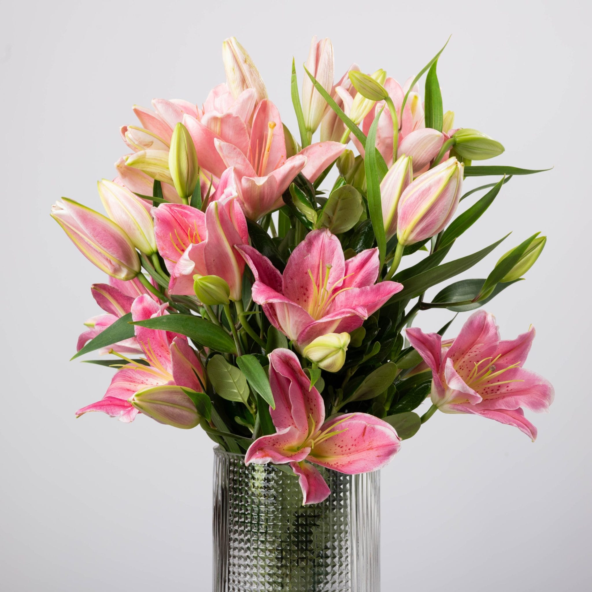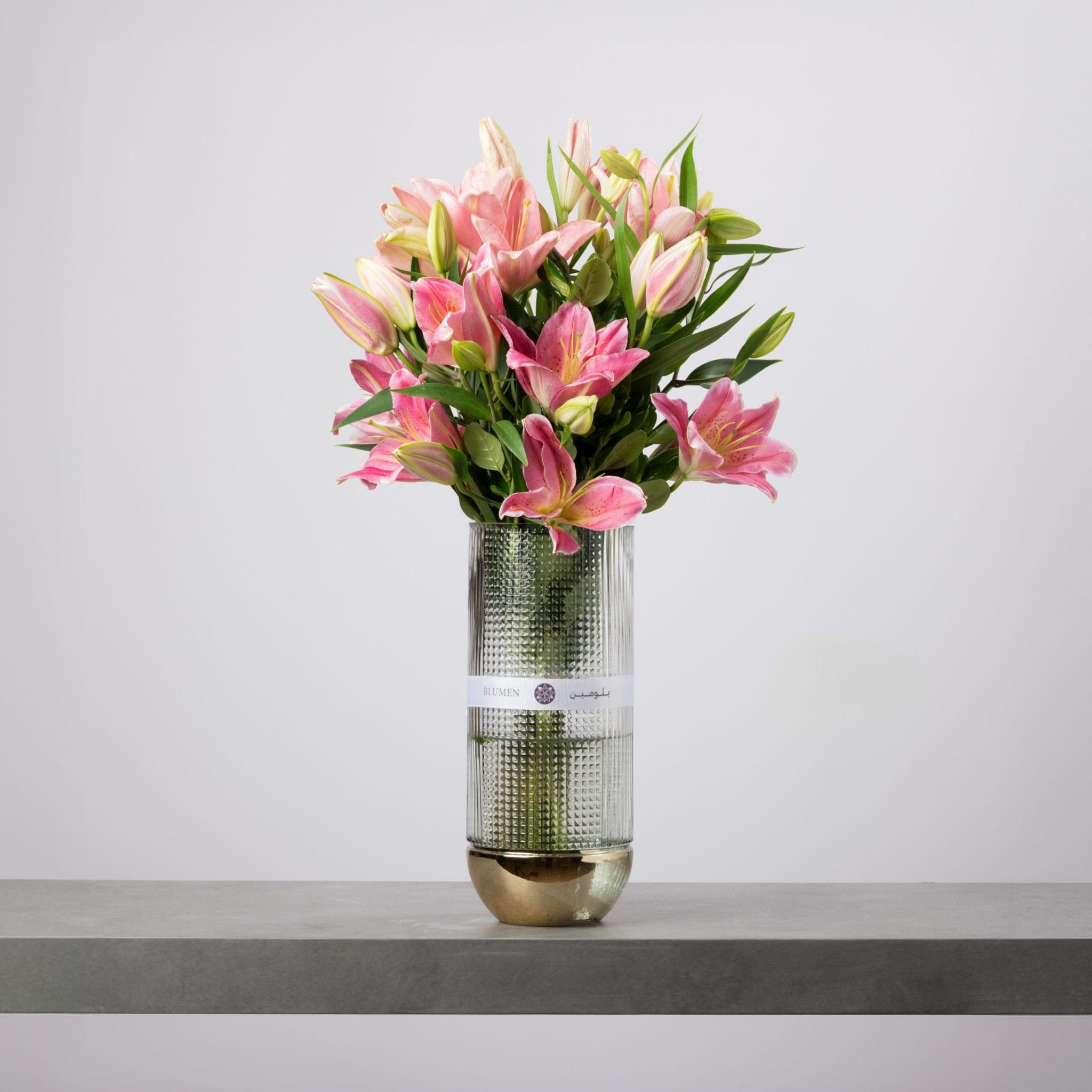 تنسيق راقٍ من زهور الزنبق الوردية الفاتنة داخل فازة زجاجية فاخرة بتفاصيل ذهبية أنيقة من توقيع بلومن.