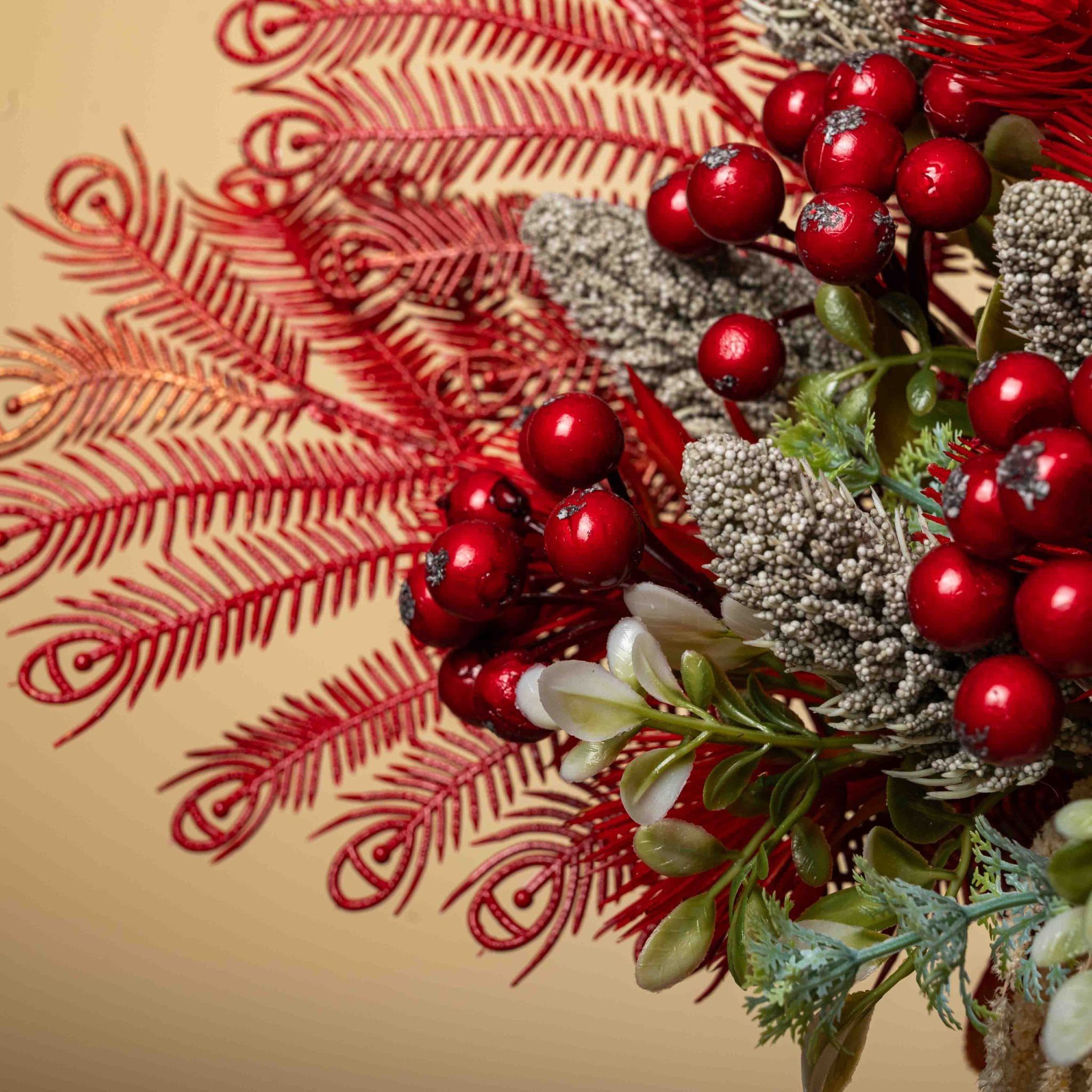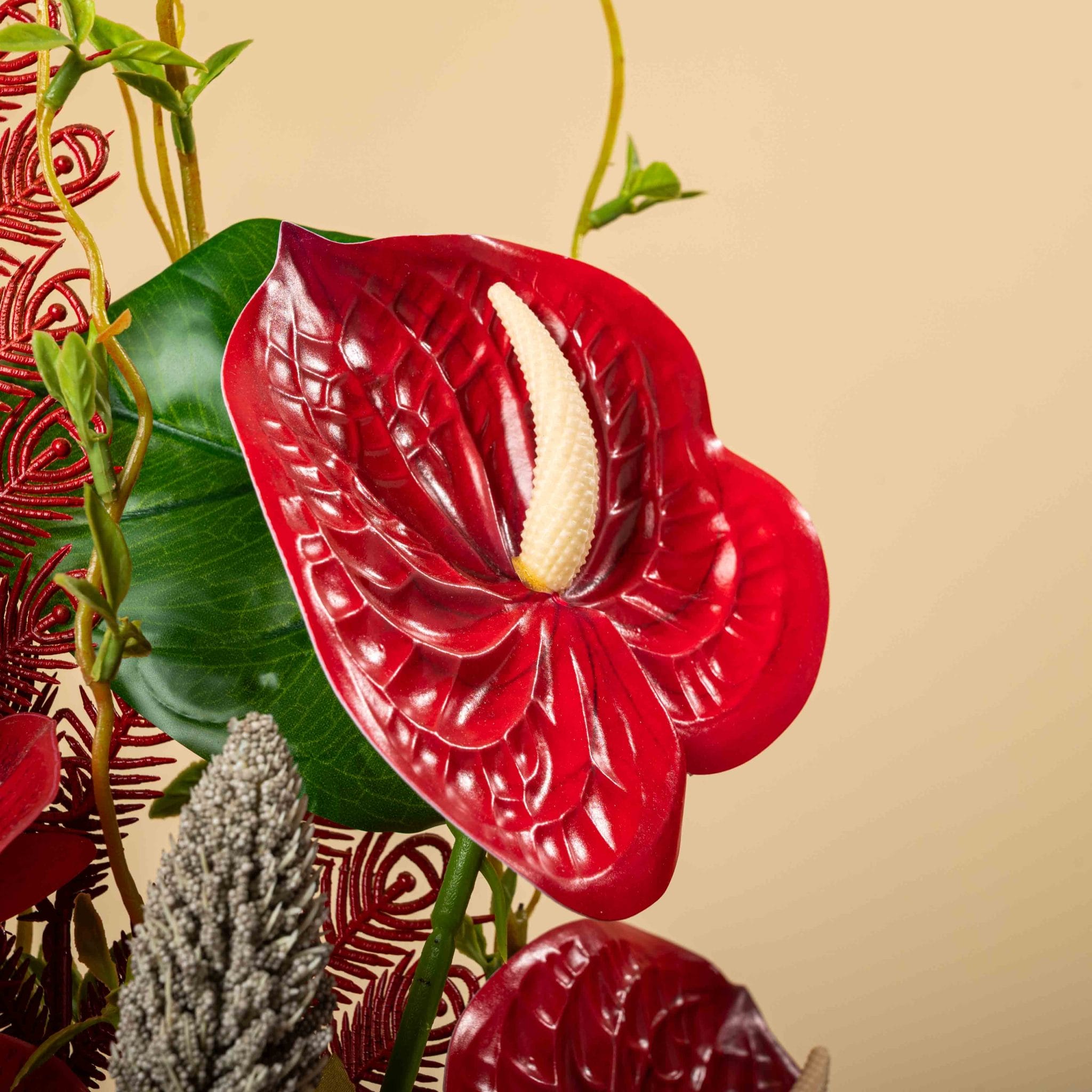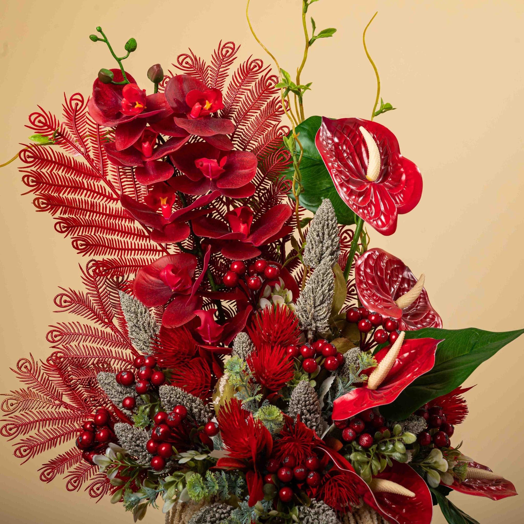 تنسيق ورد صناعي غني بالألوان الحمراء الداكنة والأوركيد الفخم مع ريش زخرفي صناعي أنيق ضمن فازة ملفوفة بالقماش الأحمر.