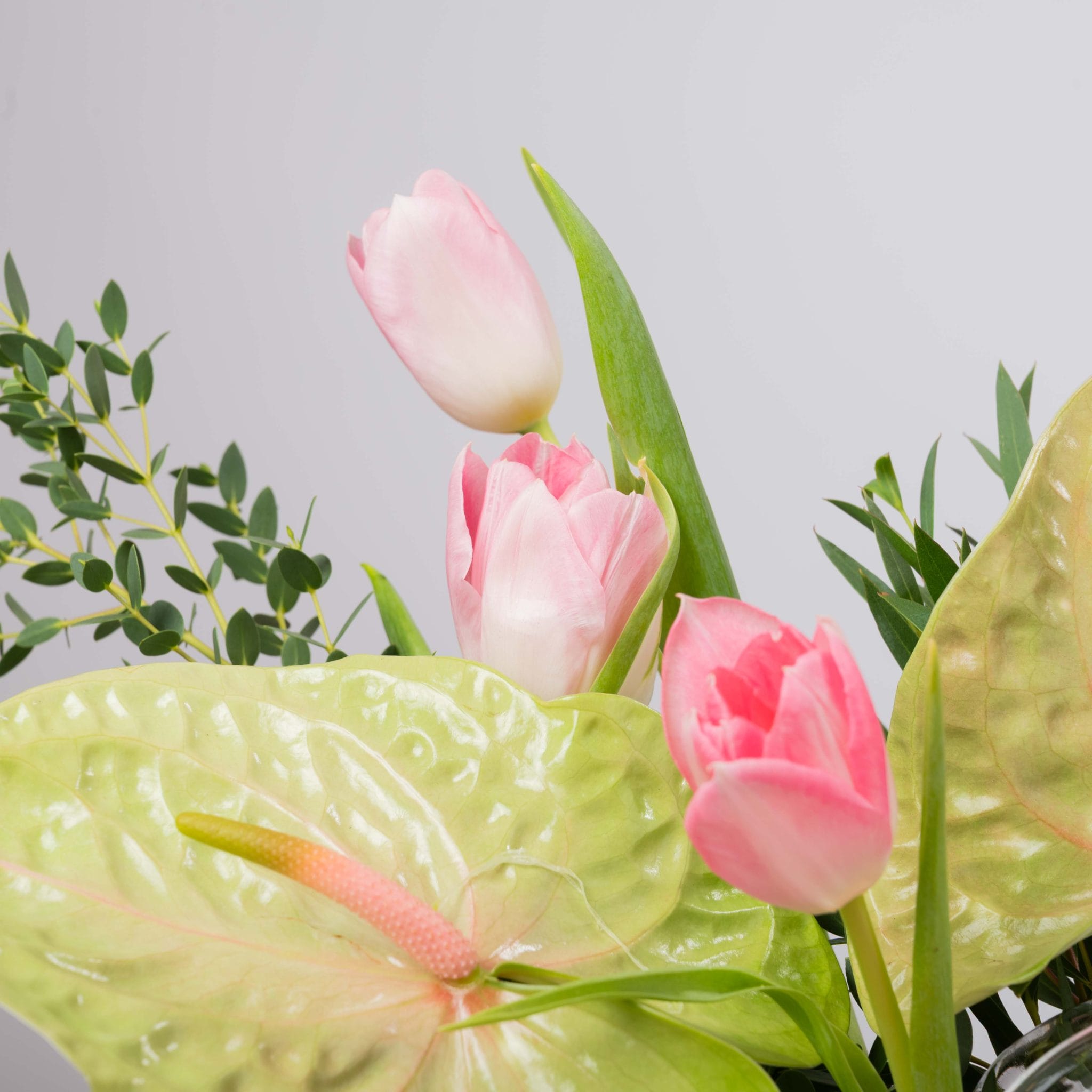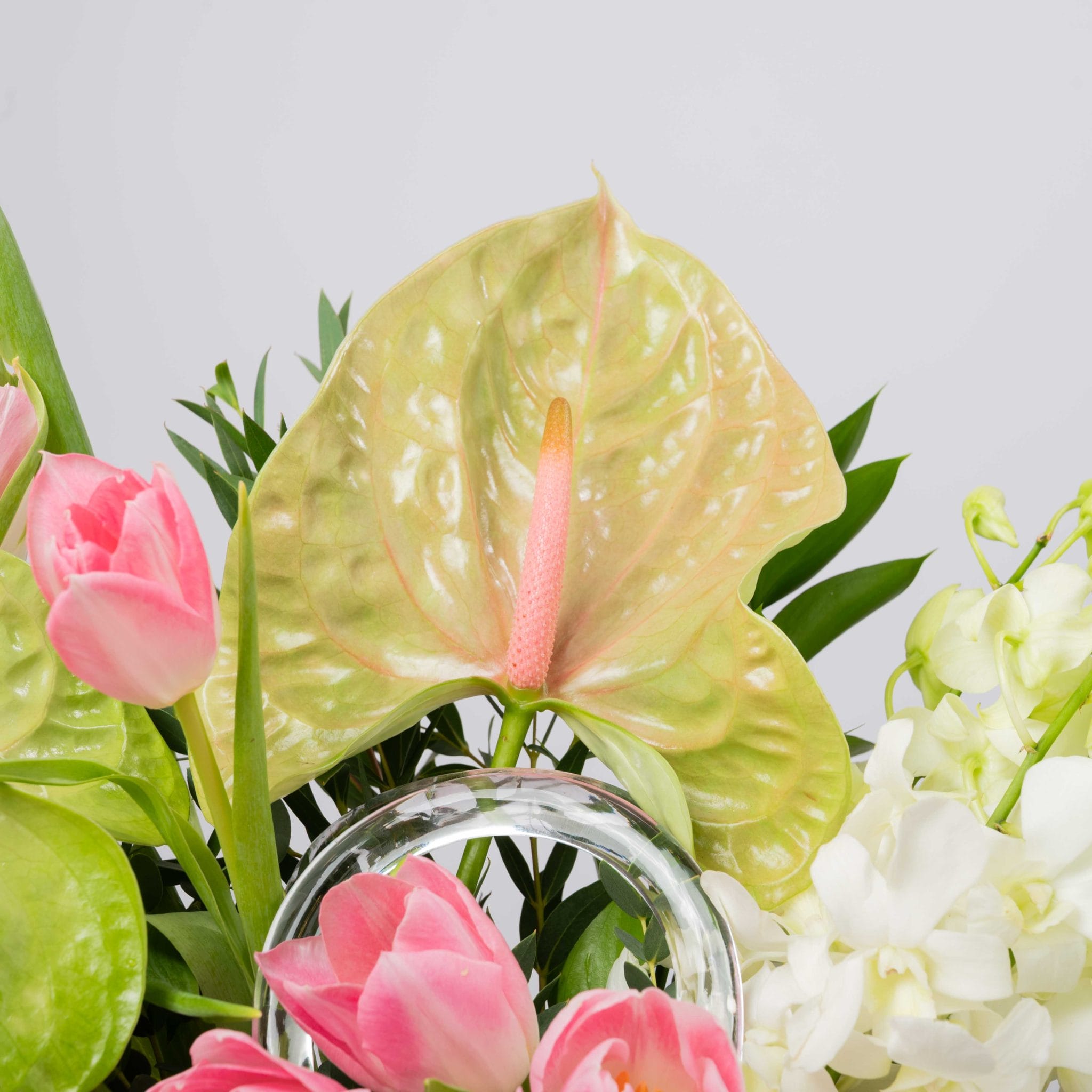 يمنح سبرنغ بيبل غاردن إحساس جدول ربيعي منعش داخل المنزل. تتصاعد أزهار التوليب الوردية بخفة بين أوراق الأنثوريوم الخضراء الناعمة وشلال من الأوركيد الأبيض، وكأنها تنمو من قاعدة من الماء الصافي والحصى الطبيعية داخل جرة زجاجية عصرية. يكتمل التنسيق بشريط وردي ناعم من بلومن، ليكون مثالياً لمداخل مضيئة وكونترات المكاتب أو كهدية تضيف لمسة ربيعية منعشة وخفيفة.