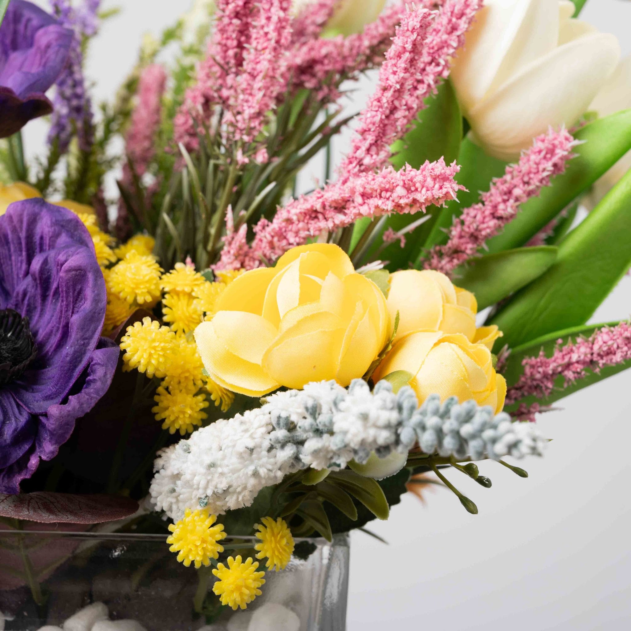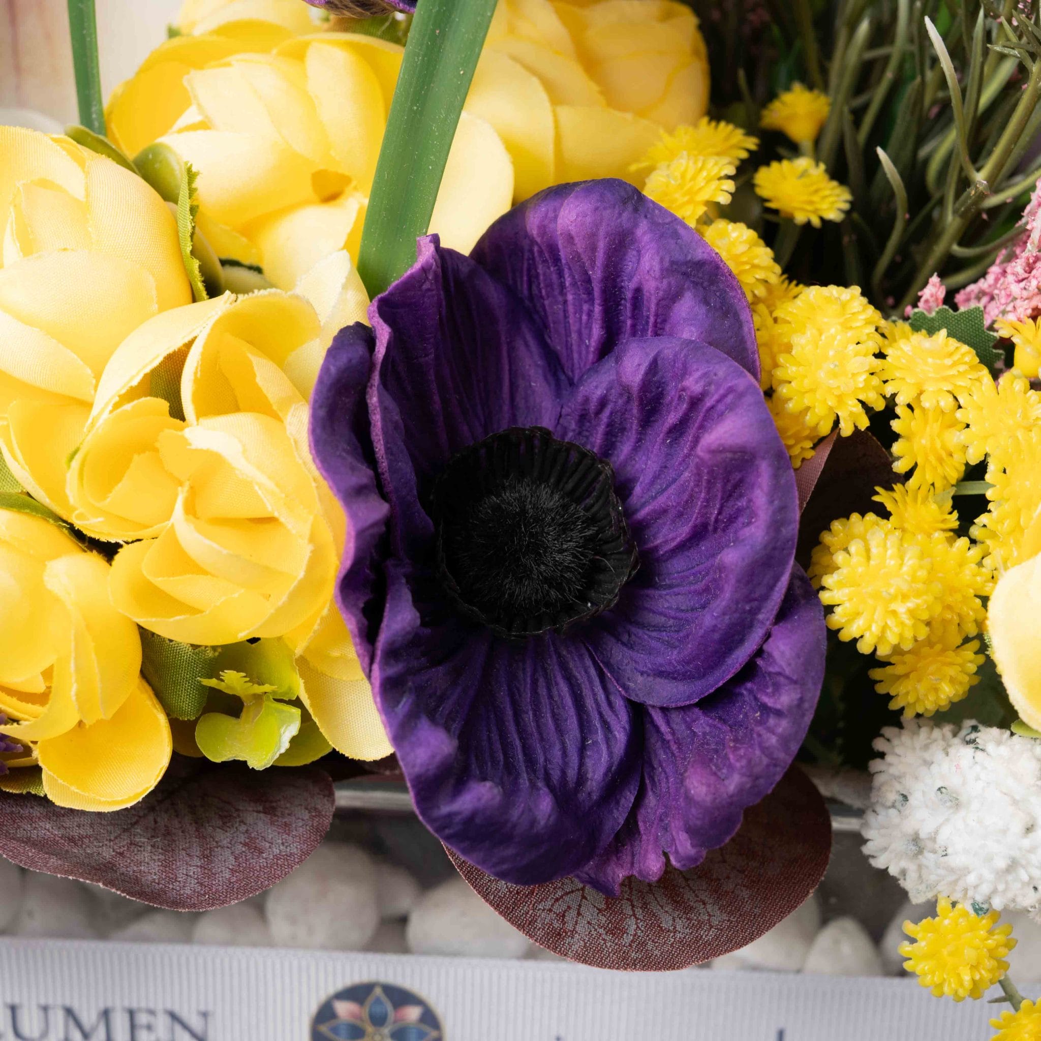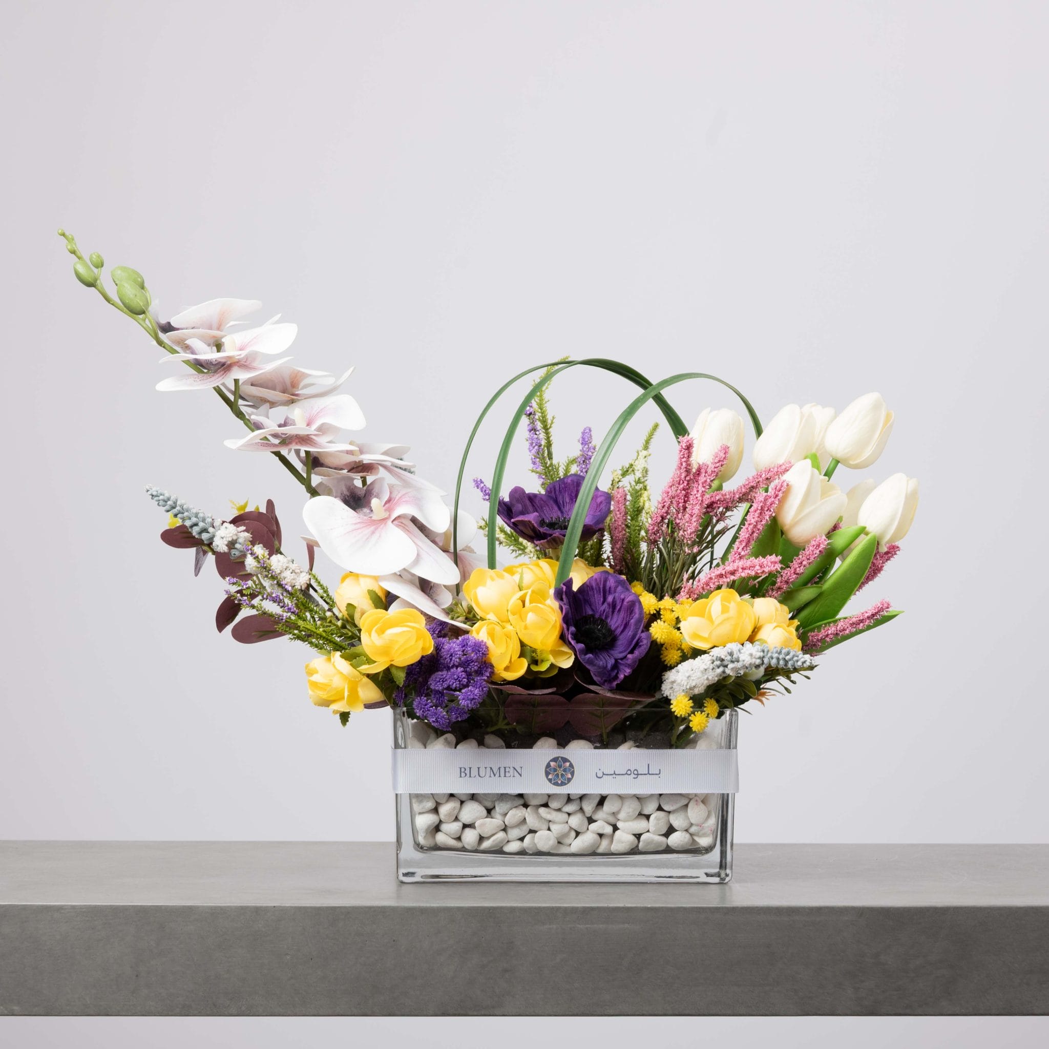يجسد “سراب الأوركيد” رؤية من الأناقة الانسيابية والفن الطبيعي. تمتد زهور الأوركيد البيضاء برقة فوق توليبات وورود صفراء وأنايمونات بنفسجية، لتشكل تنسيقًا يجمع بين التوازن والحرية. يجسد هذا التصميم انسجام الخطوط والتباين في لوحة شعرية من الطبيعة – راقية، مشرقة، وعصرية بلا تكلف.