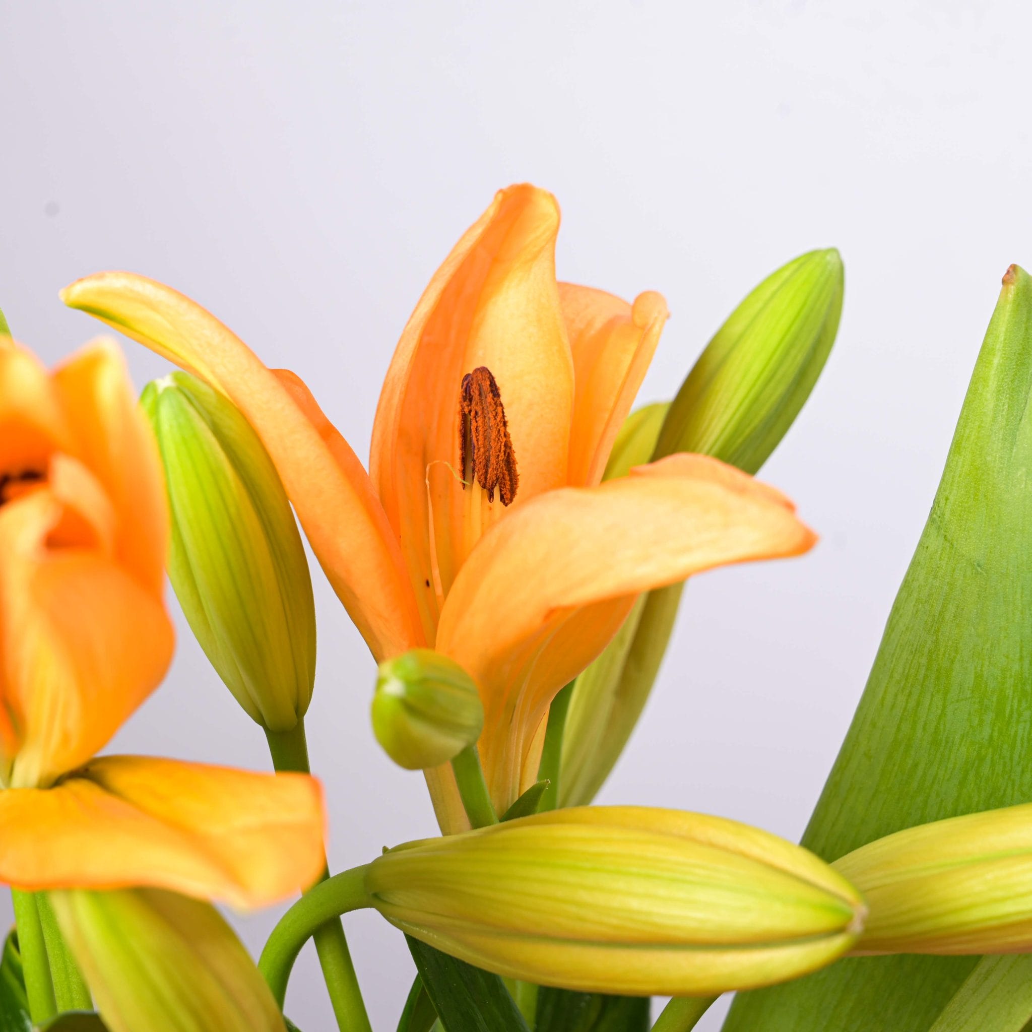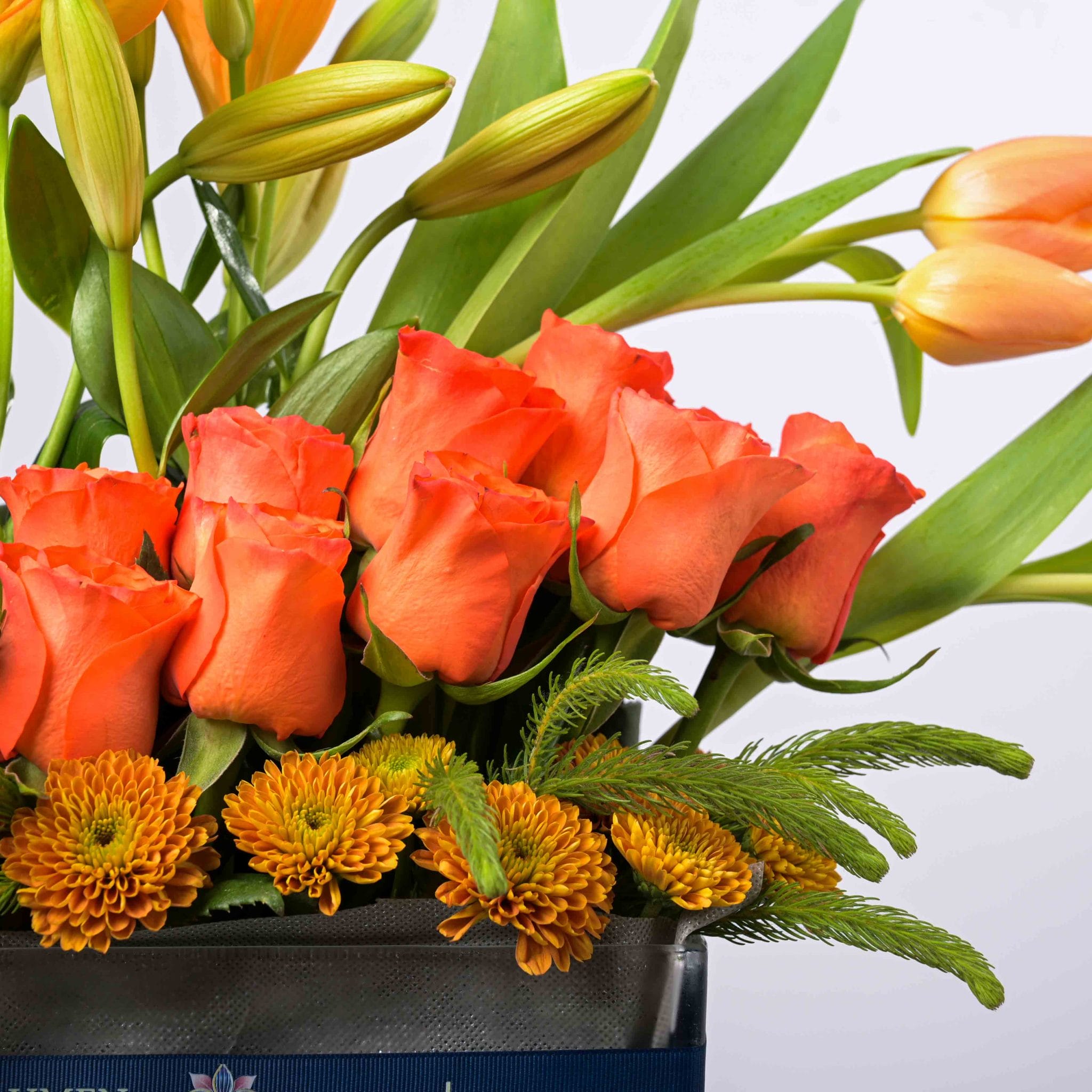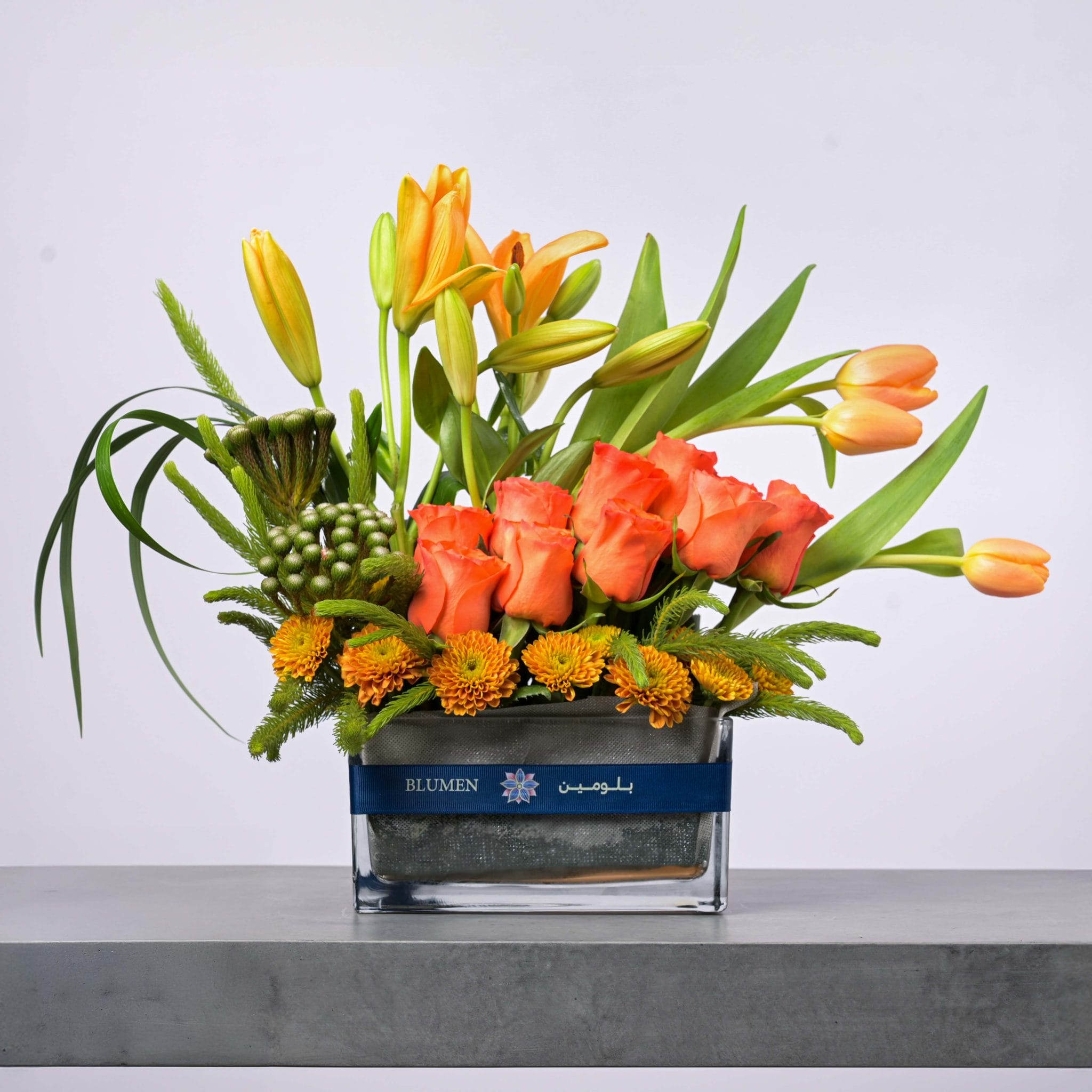 تنسيق تناغم شروق الشمس يجمع بين دفء الورود البرتقالية وإشراقة الزنابق والتوليب الصفراء ليشكل عرضًا مبهجًا ومنعشًا. صُمم في مزهرية زجاجية أنيقة مع شريط بلومن المميز، ليمنح لمسة من الأناقة والفرح، مثالي لتزيين المكان أو لتقديمه كهدية مميزة.