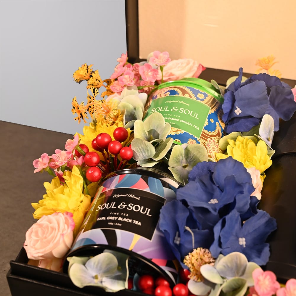 يأتي داخل صندوق أنيق يضم علبتي شاي فاخرتين مع ترمس عصري، محاطًا بتنسيق زهري ملون يضفي حيوية وجمالًا على التصميم. تضيف الأزهار لمسة من الإشراق والبهجة، بينما تمنح عناصر الشاي إحساسًا بالدفء والاسترخاء.