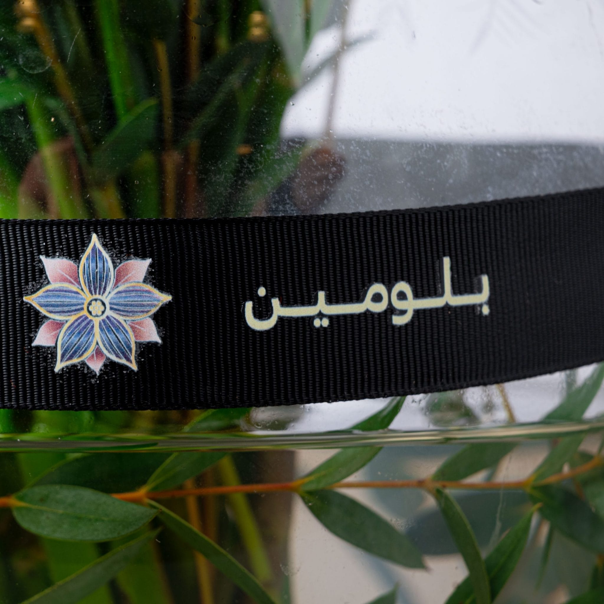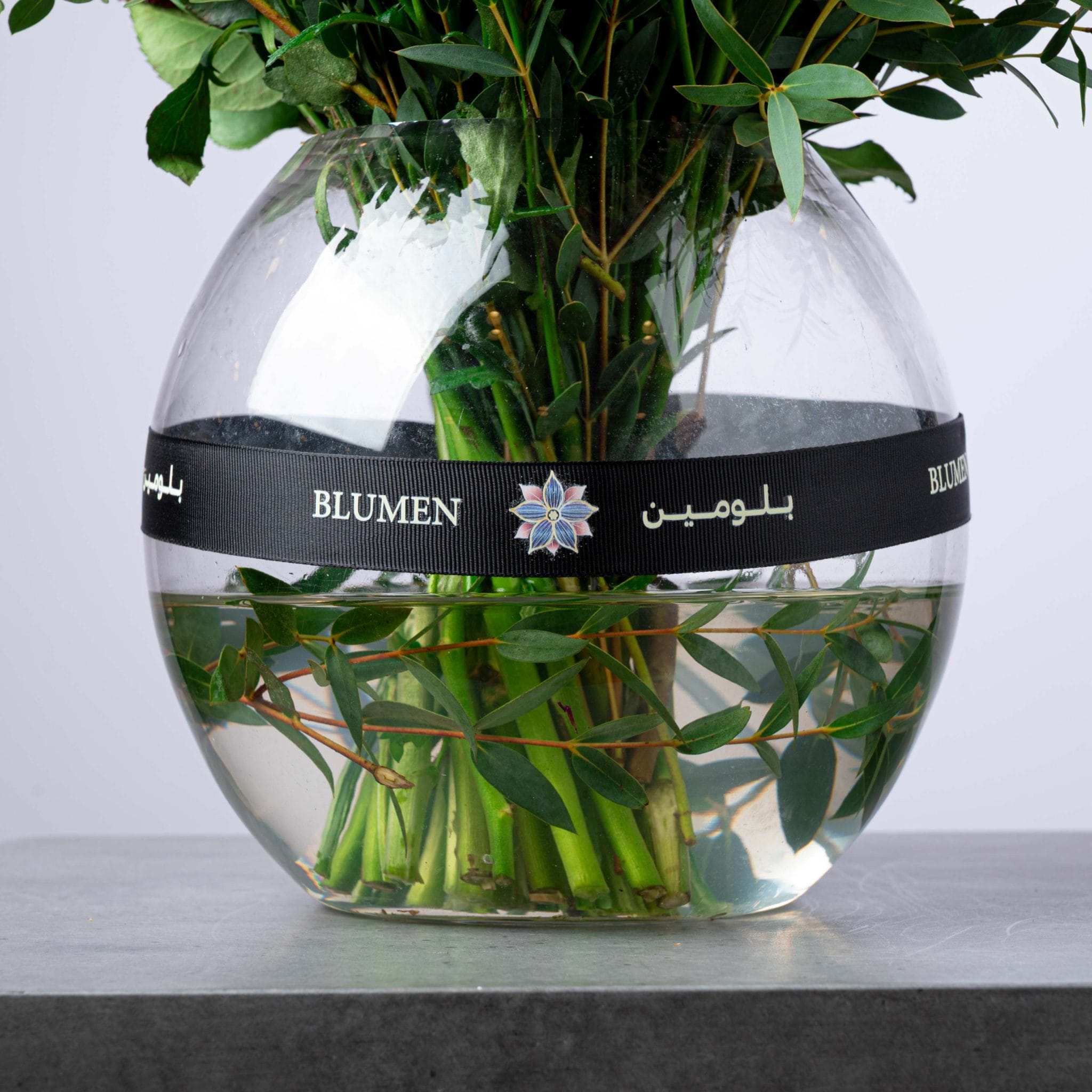 موضوع في مزهرية زجاجية كروية بتوقيع بلومن، حيث يعكس هذا التكوين توازناً مدهشاً بين الطبيعة الغنية والذوق العصري.