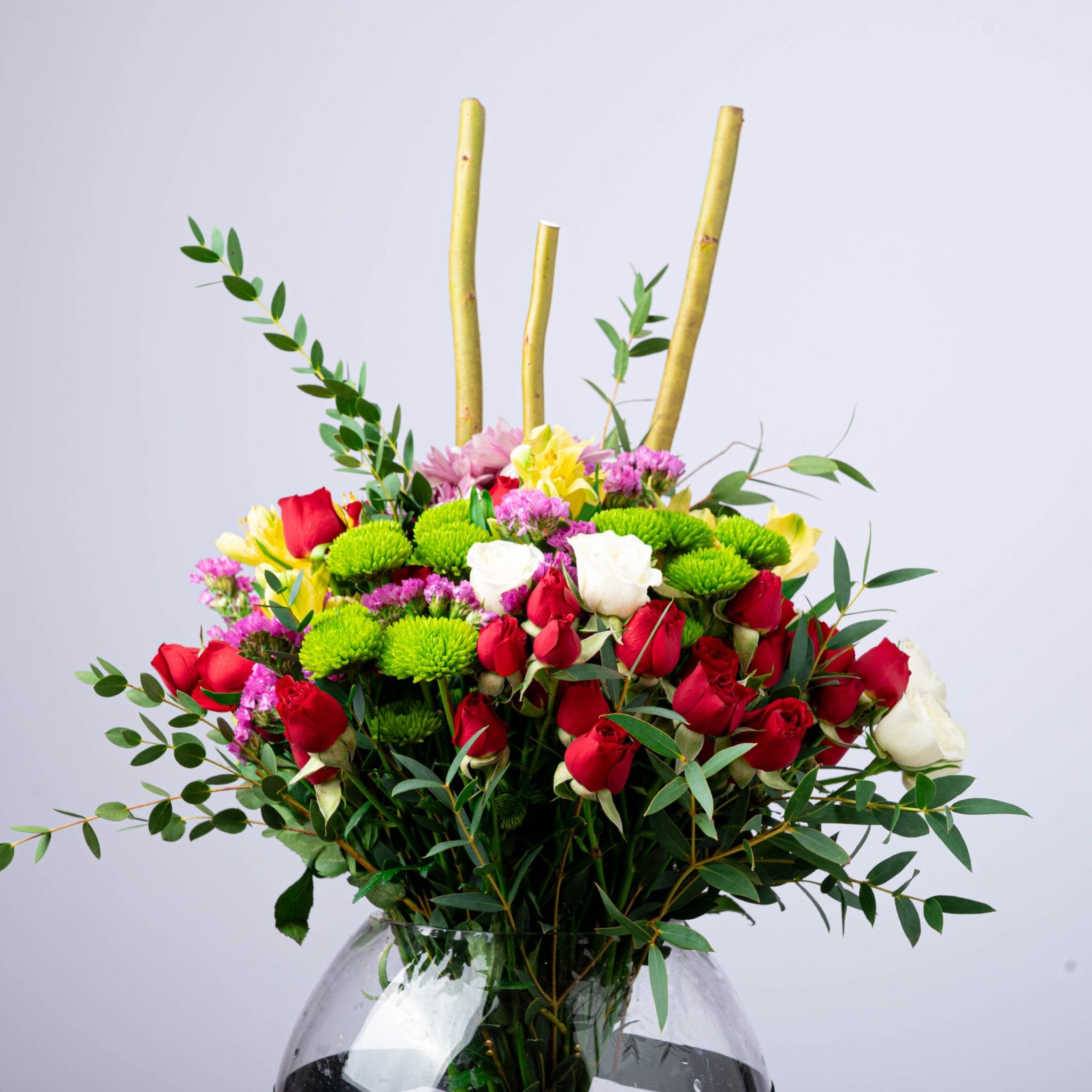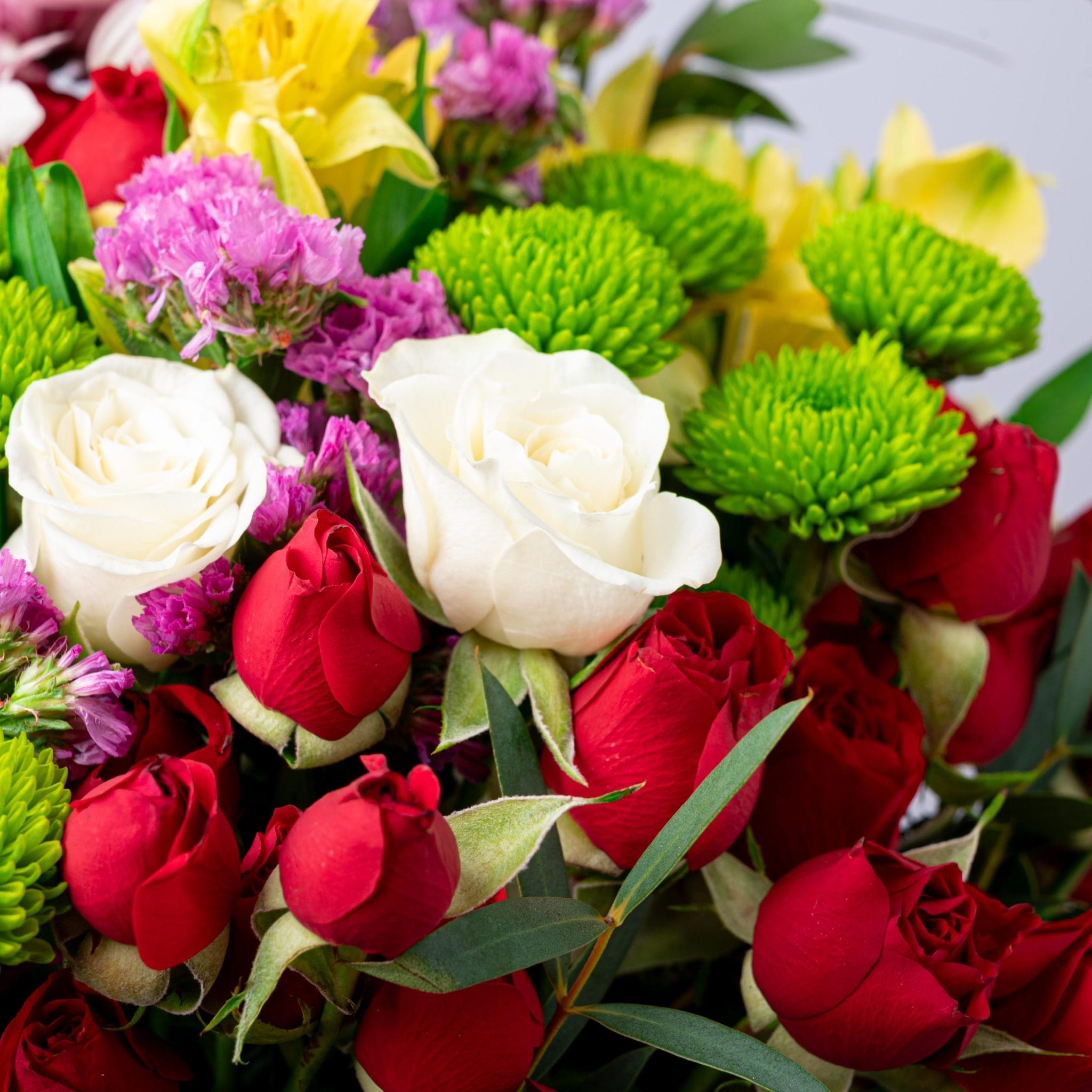 تنسيق زهور فريد من بلومن يجمع بين الورود الحمراء والبيضاء مع زهور الأقحوان الخضراء ولمسات من الأزهار البنفسجية والصفراء، تحيط بها أوراق خضراء أنيقة تضيف حركة وحيوية للتصميم.