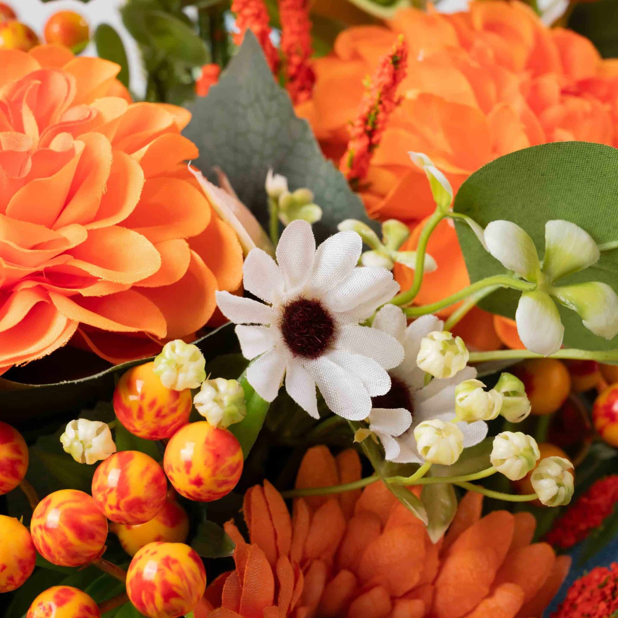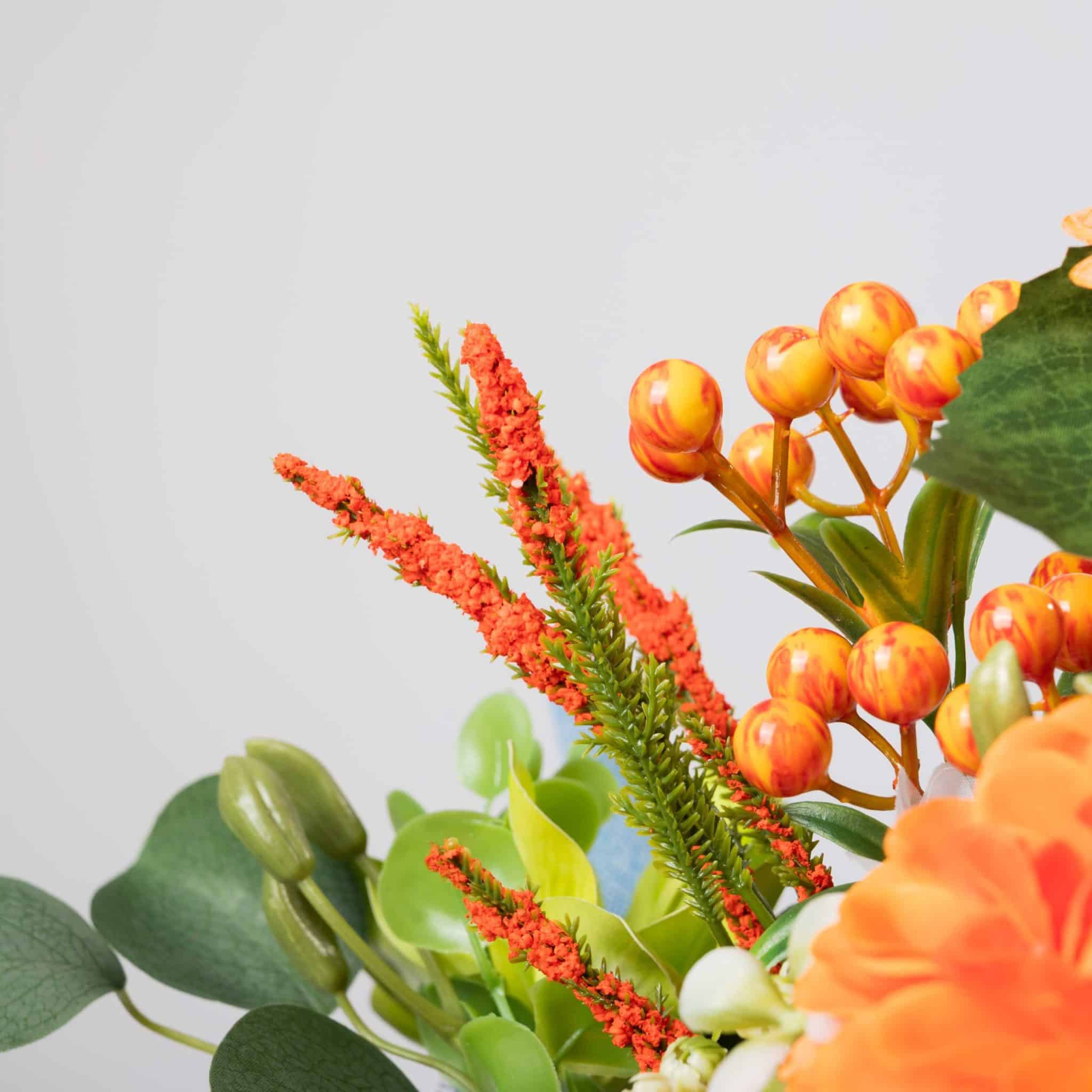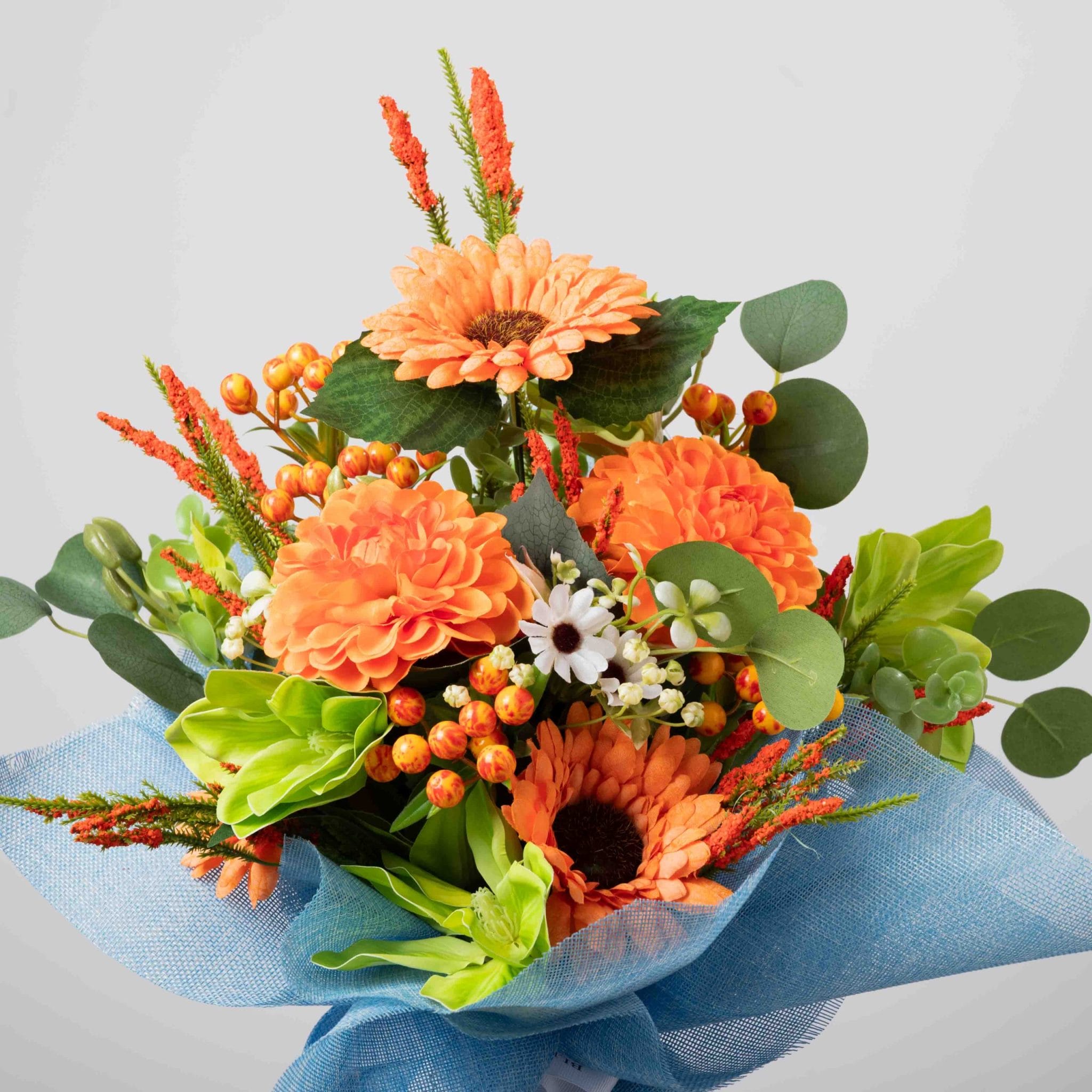 مزيج مشرق من زهور الجربيرا البرتقالية والداليا والزهور البيضاء والأوراق الخضراء مغلف بـ قماش أزرق سماوي ومزين بـ شريط بلومن الأنيق.