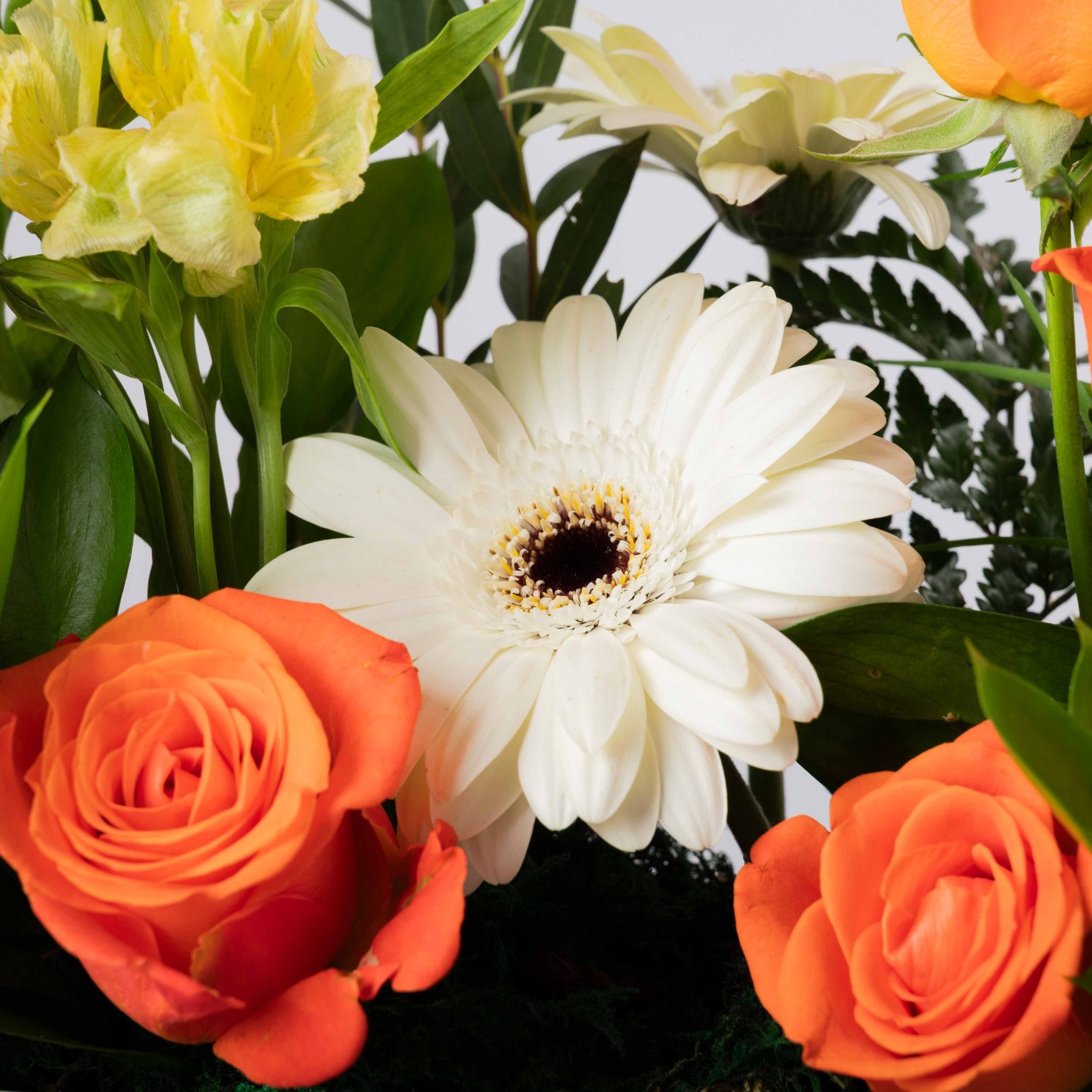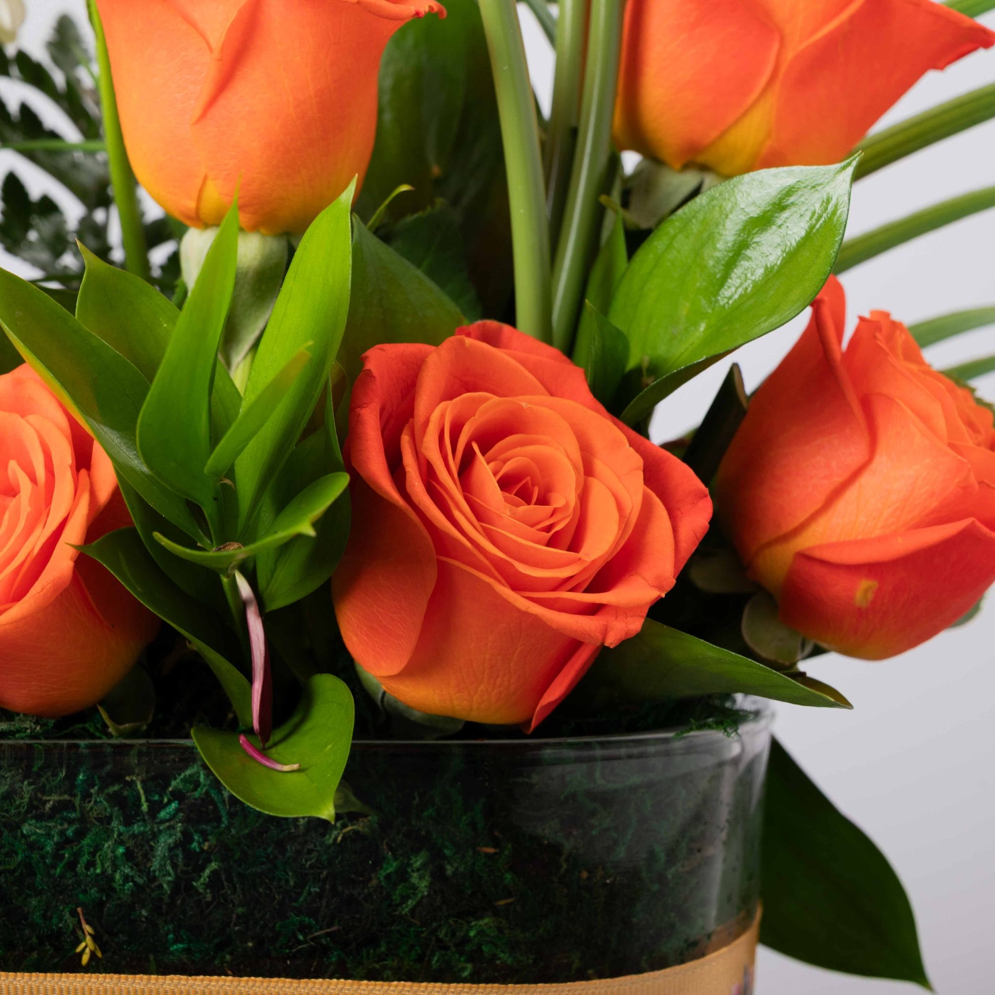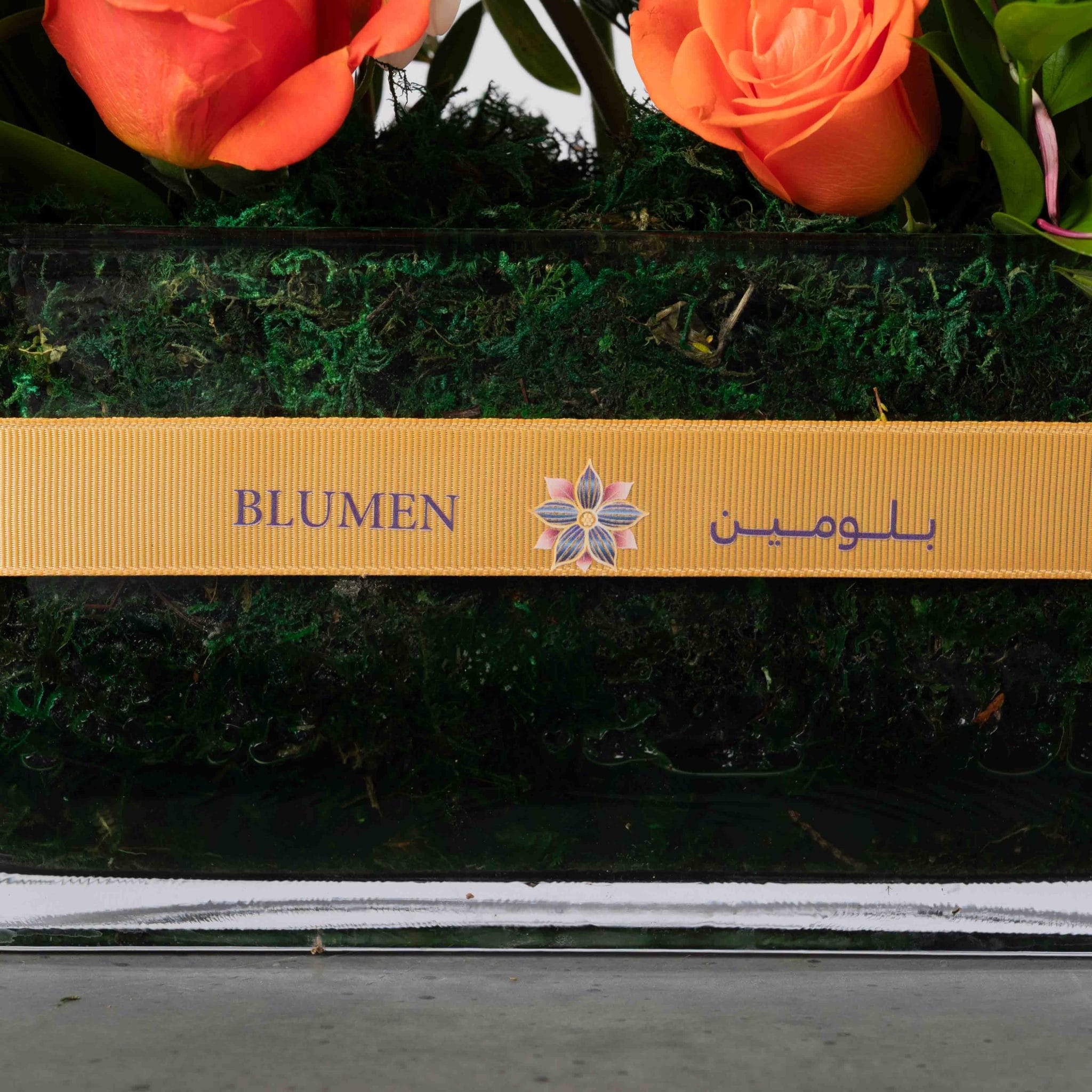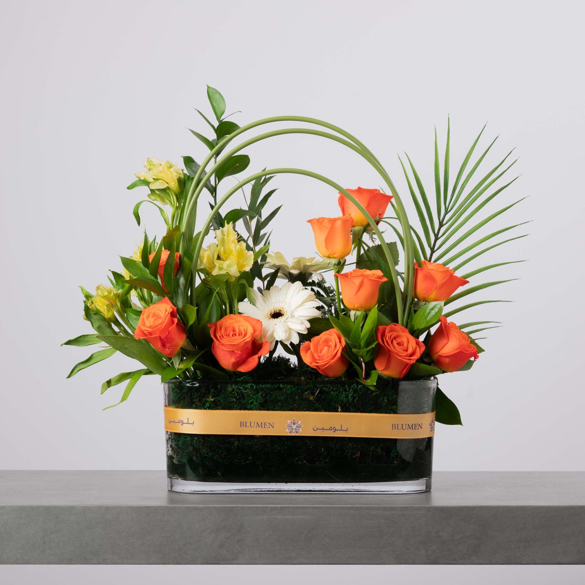 يجسد صن سِت آرك لحظة تحوّل السماء إلى درجات الذهب والبرتقالي قبل الغروب. مزهرية مستطيلة أنيقة مبطنة بطحالب خضراء داكنة وملفوفة بشريط أصفر من بلومن تحمل صفاً حيوياً من الورد البرتقالي يحتضن جربيرا بيضاء في المنتصف. تحيط به زهور صفراء ناعمة وأوراق نخيل وأقواس من الخضار ترسم شكل شمس تغرب على الأفق. هذا التنسيق المشرق والراقي مثالي لإضفاء الدفء على المكاتب، وتهنئة الأحبة، أو إضافة لمسة عصرية دافئة إلى أي مناسبة.