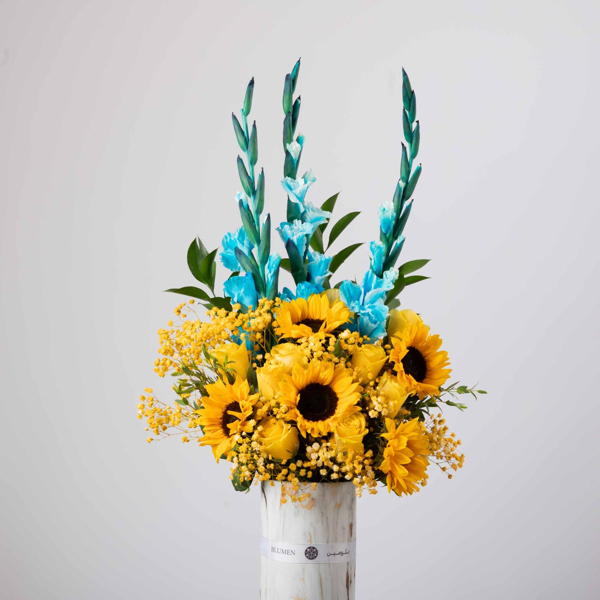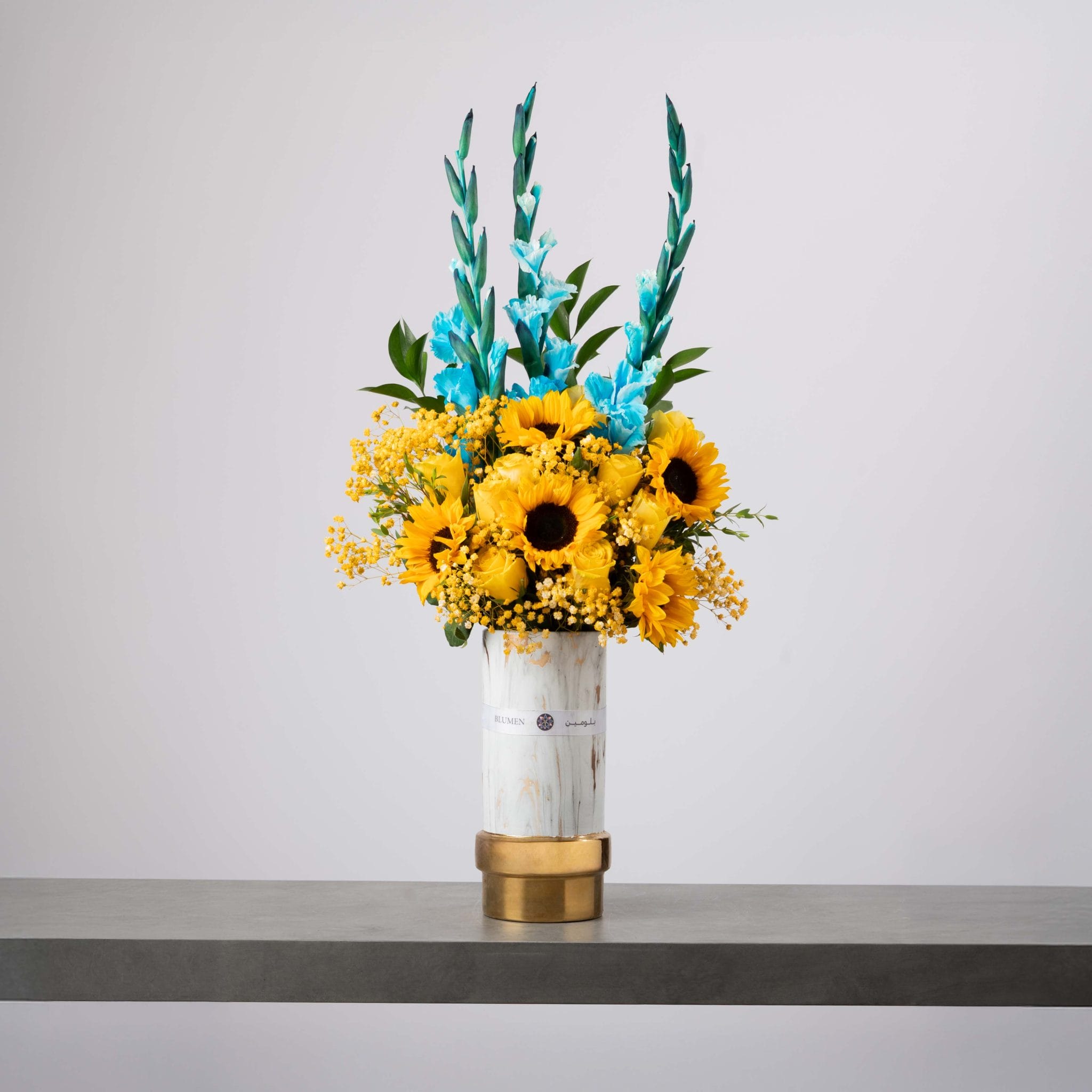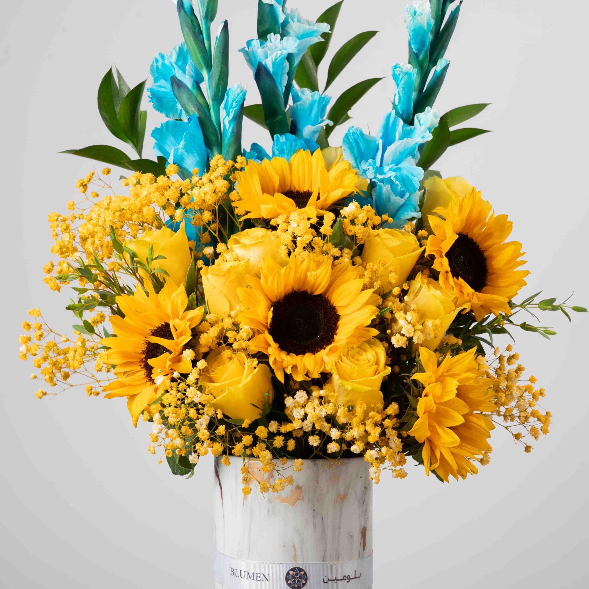 يحتفي “صن هوريزن” بلقاء الضوء والسماء من خلال التباين المذهل بين الأصفر المضيء والأزرق الهادئ. تتألق زهور دوّار الشمس بجانب الزنابق الزرقاء في مزهرية فاخرة بنقشة رخامية ولمسات ذهبية، مما يجسد إحساس اليوم الجديد – مفعم بالقوة والأمل والصفاء.