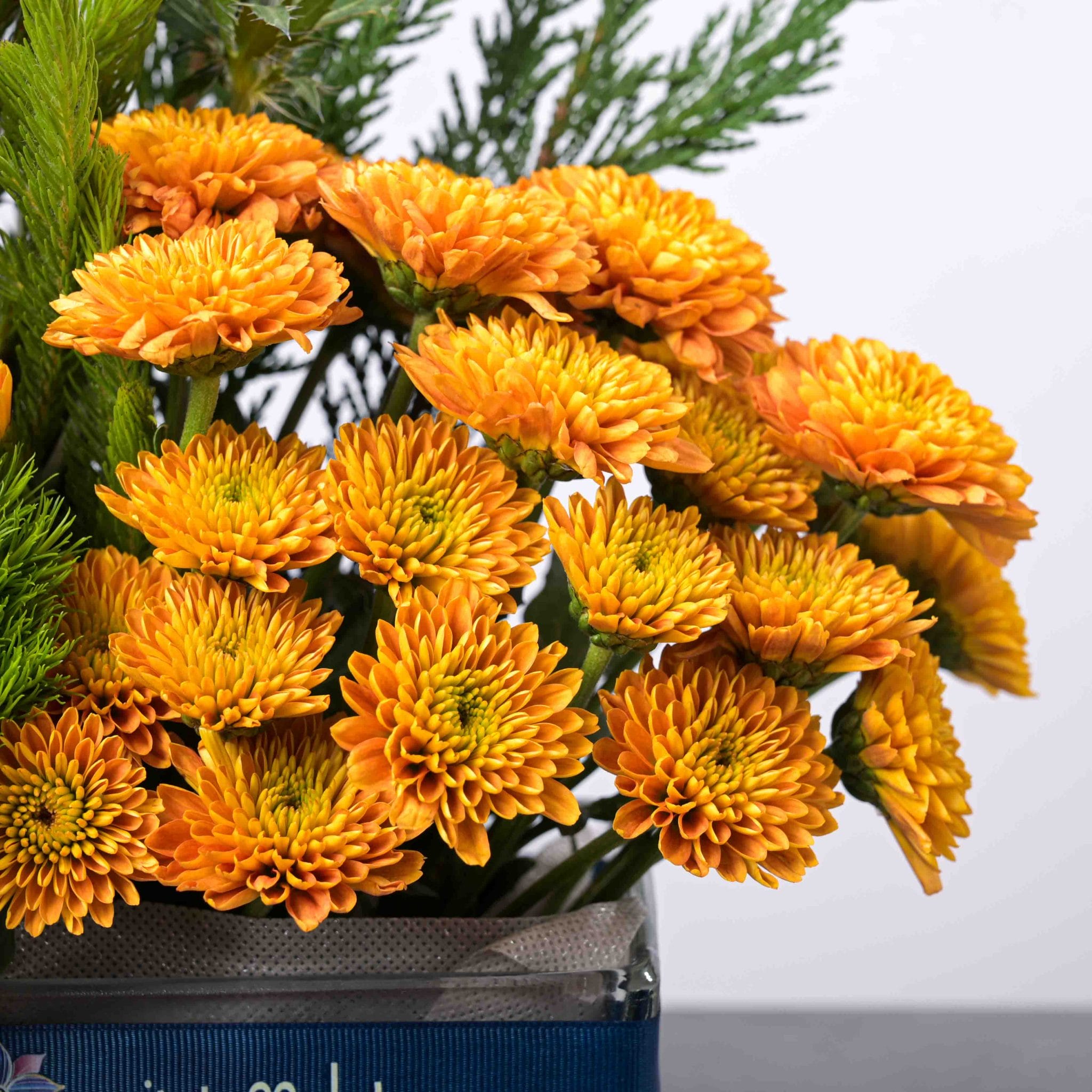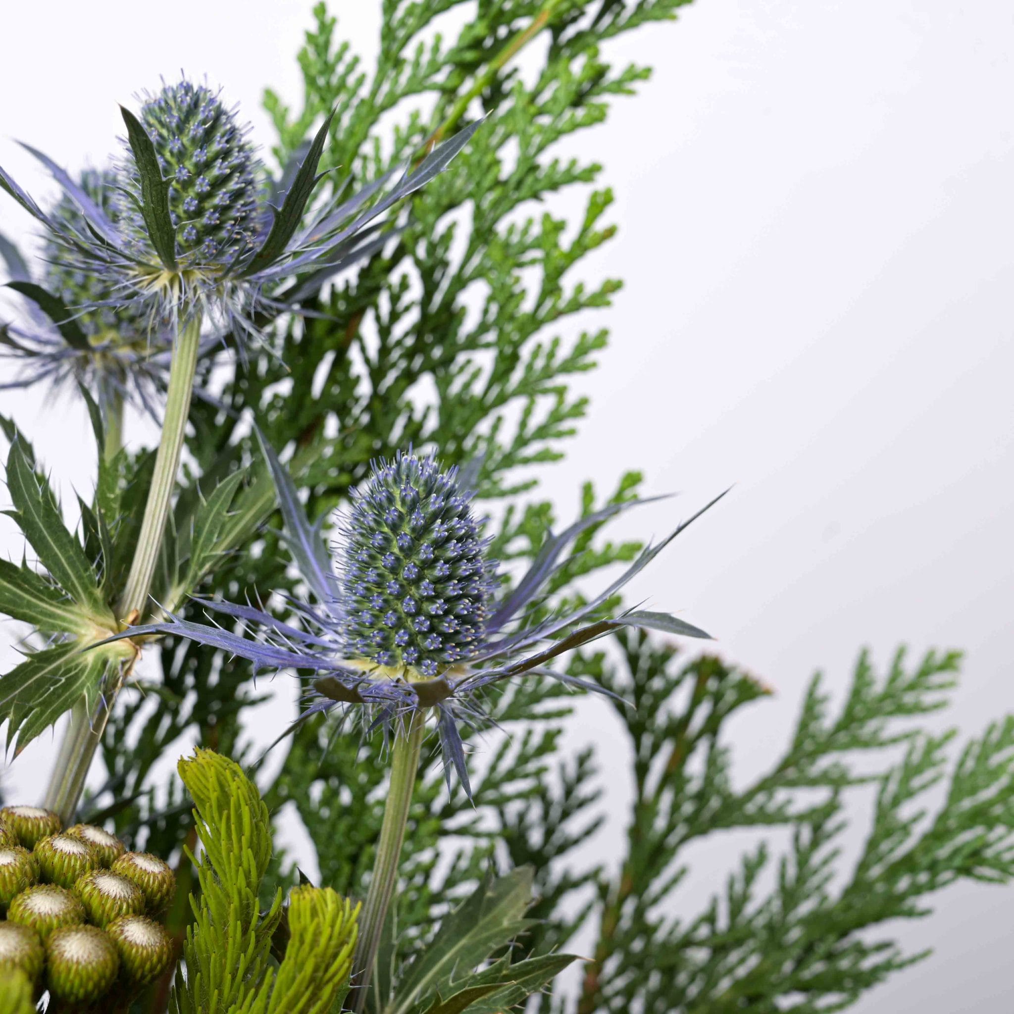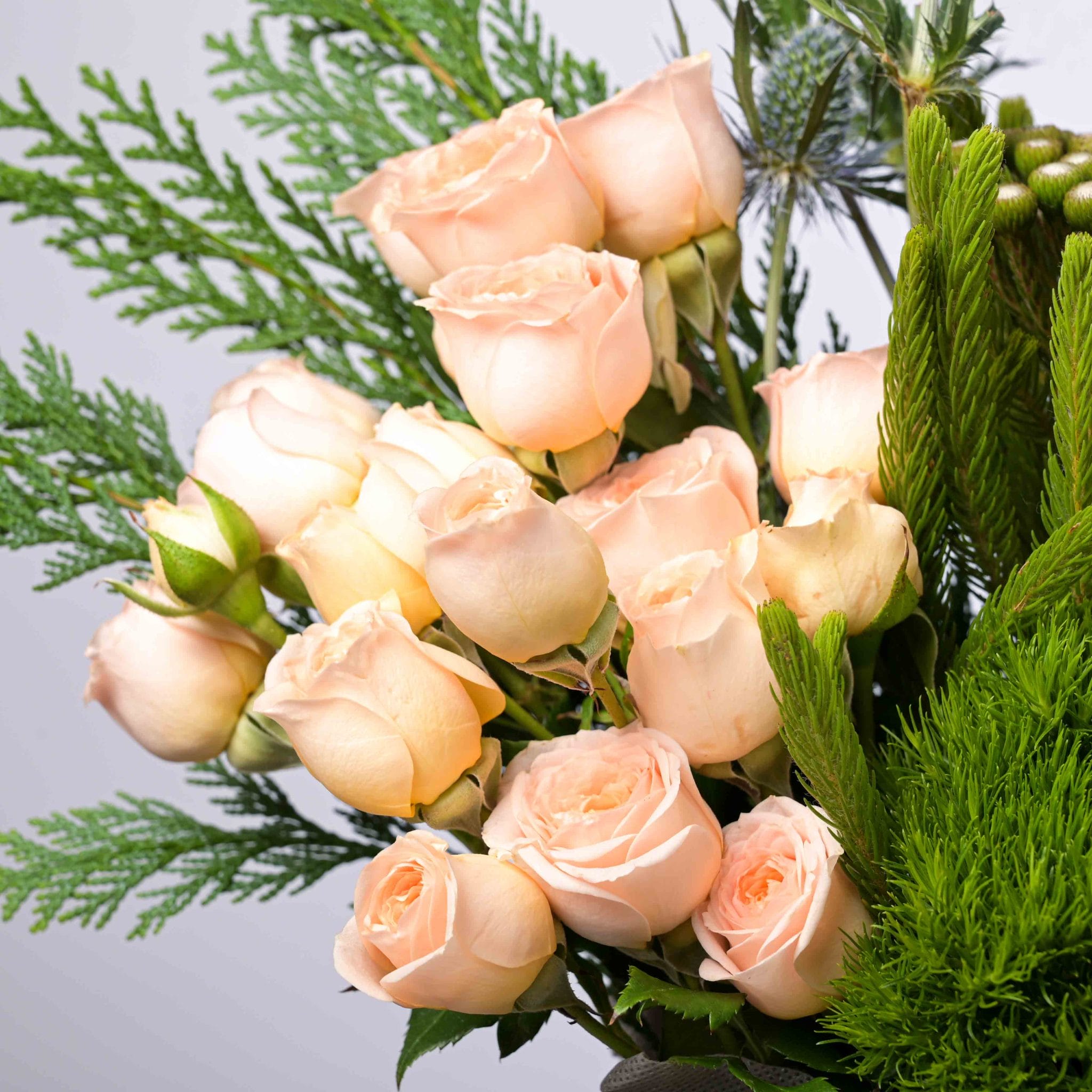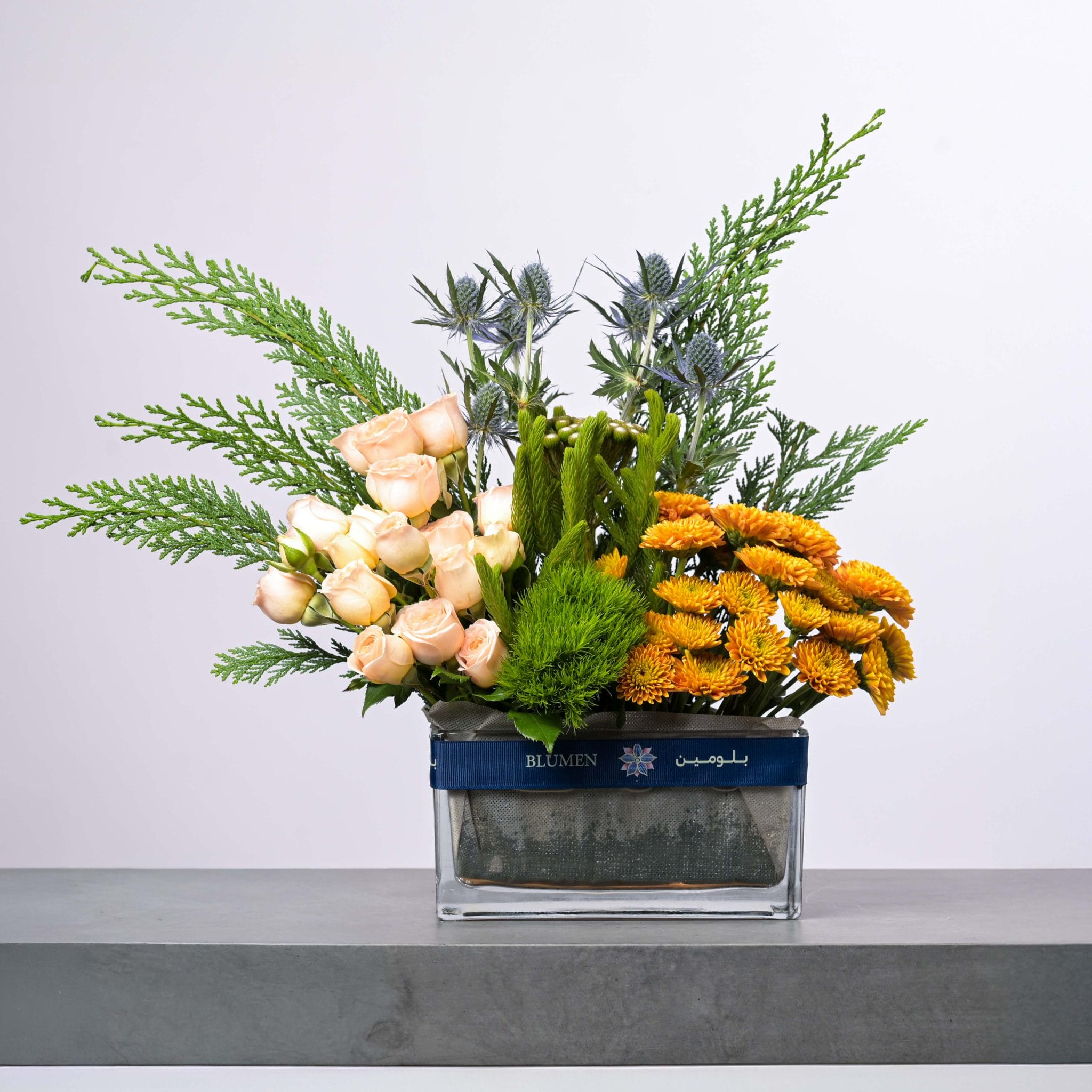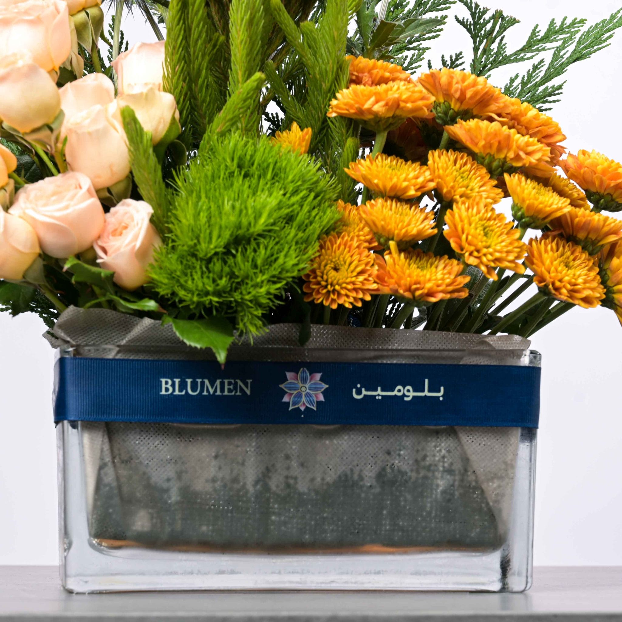 يُجسّد تنسيق الهدوء الذهبي مزيجًا من الأناقة والسكينة من خلال الورود الكريمية والذهبية وزهور الشوك المميزة. يكتمل الجمال بالأوراق الخضراء الكثيفة والمزهرية الزجاجية الأنيقة المزينة بشريط بلومن، ليعكس توازناً رائعاً بين الفخامة والهدوء. مثالي للهدايا الراقية أو لتزيين المساحات الداخلية بأسلوب أنيق.