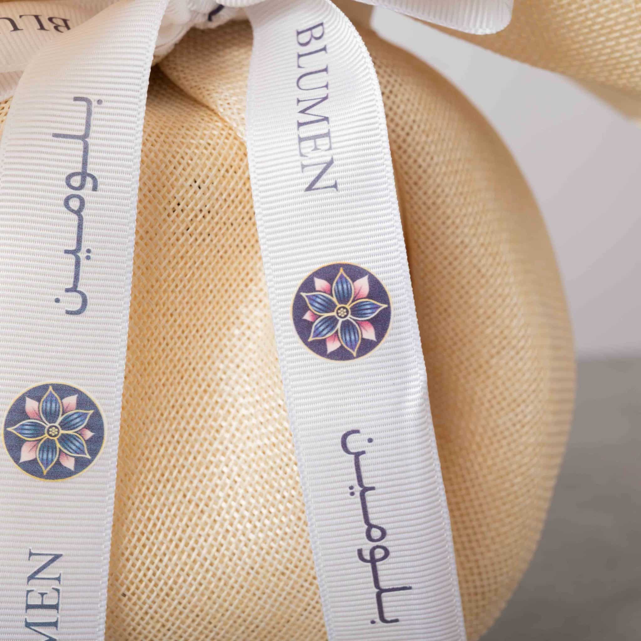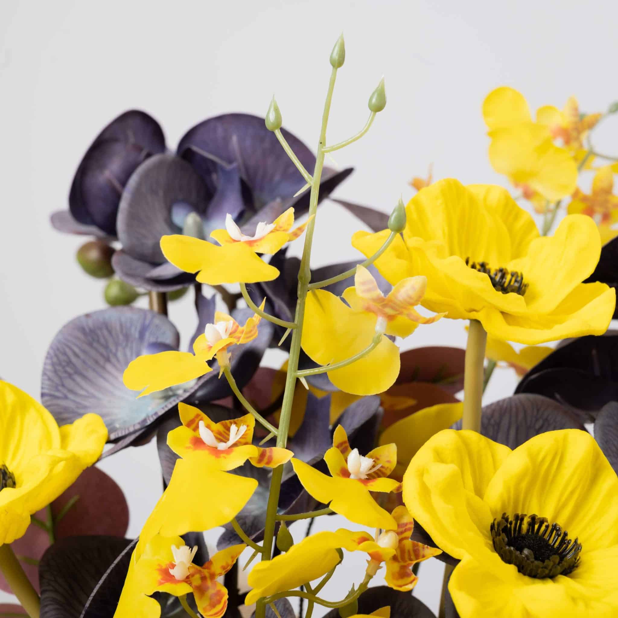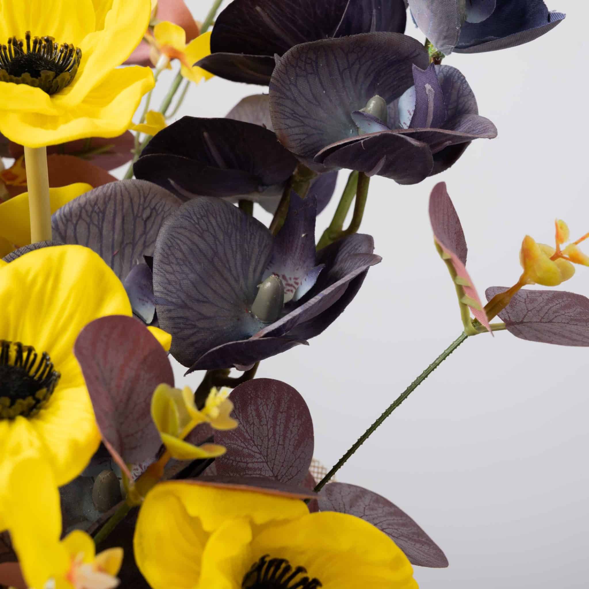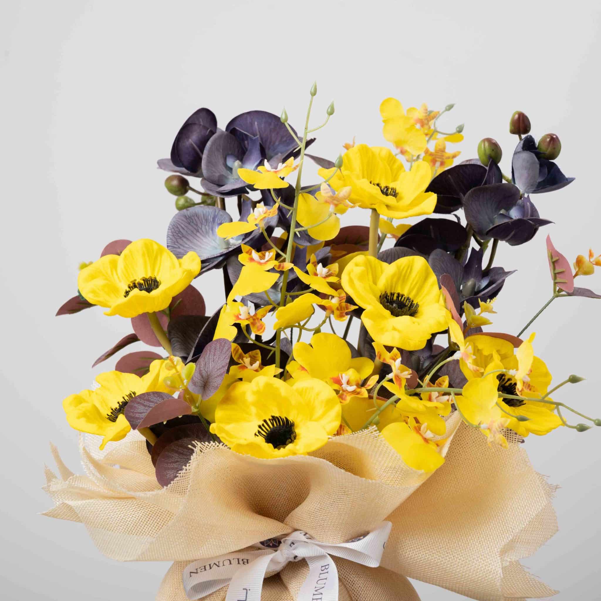 توازن فني يجمع بين زهور الخشخاش والأوركيد الصفراء مع أوراق داكنة مخملية، مغلف بـ قماش بيج أنيق ومزين بـ شريط بلومن المميز.