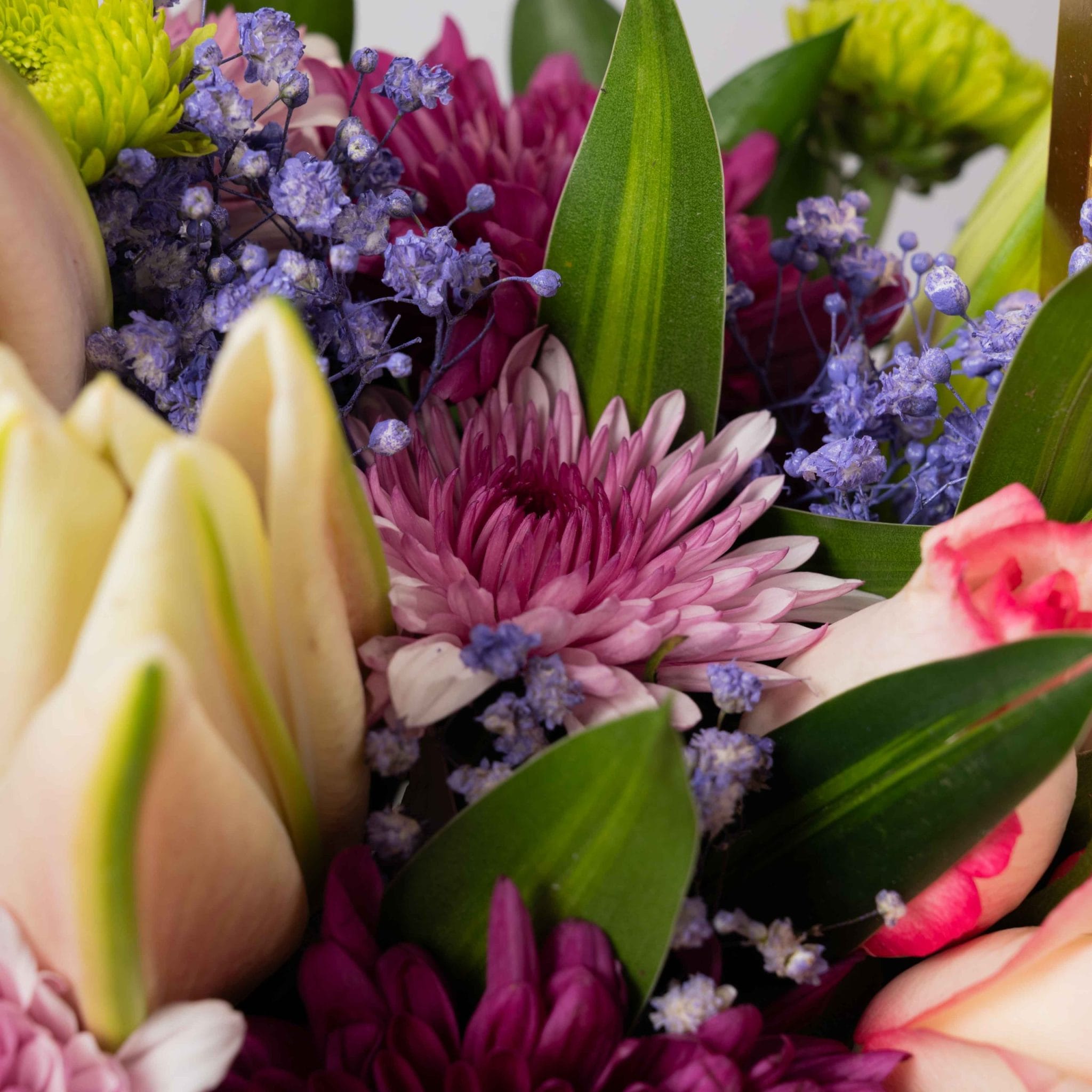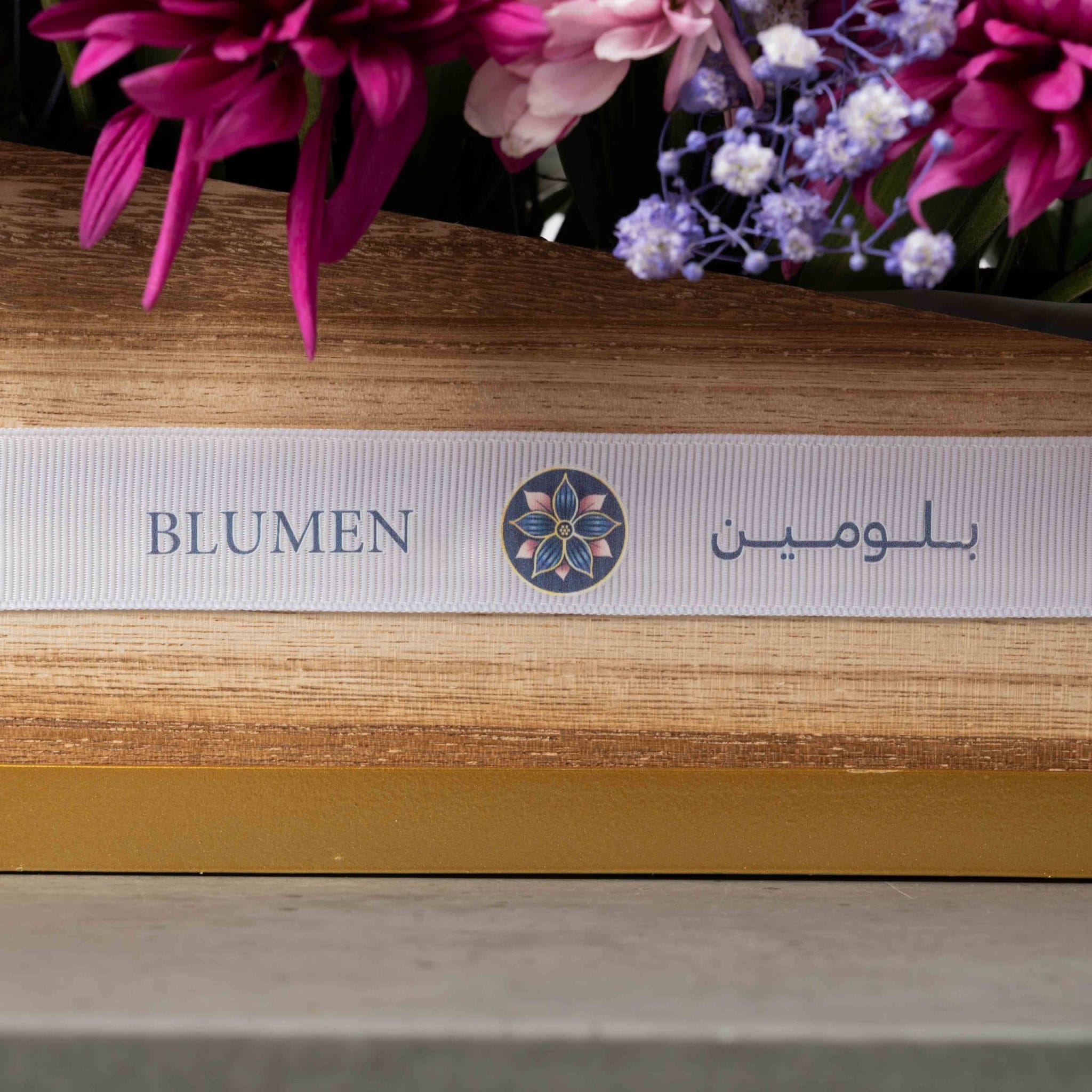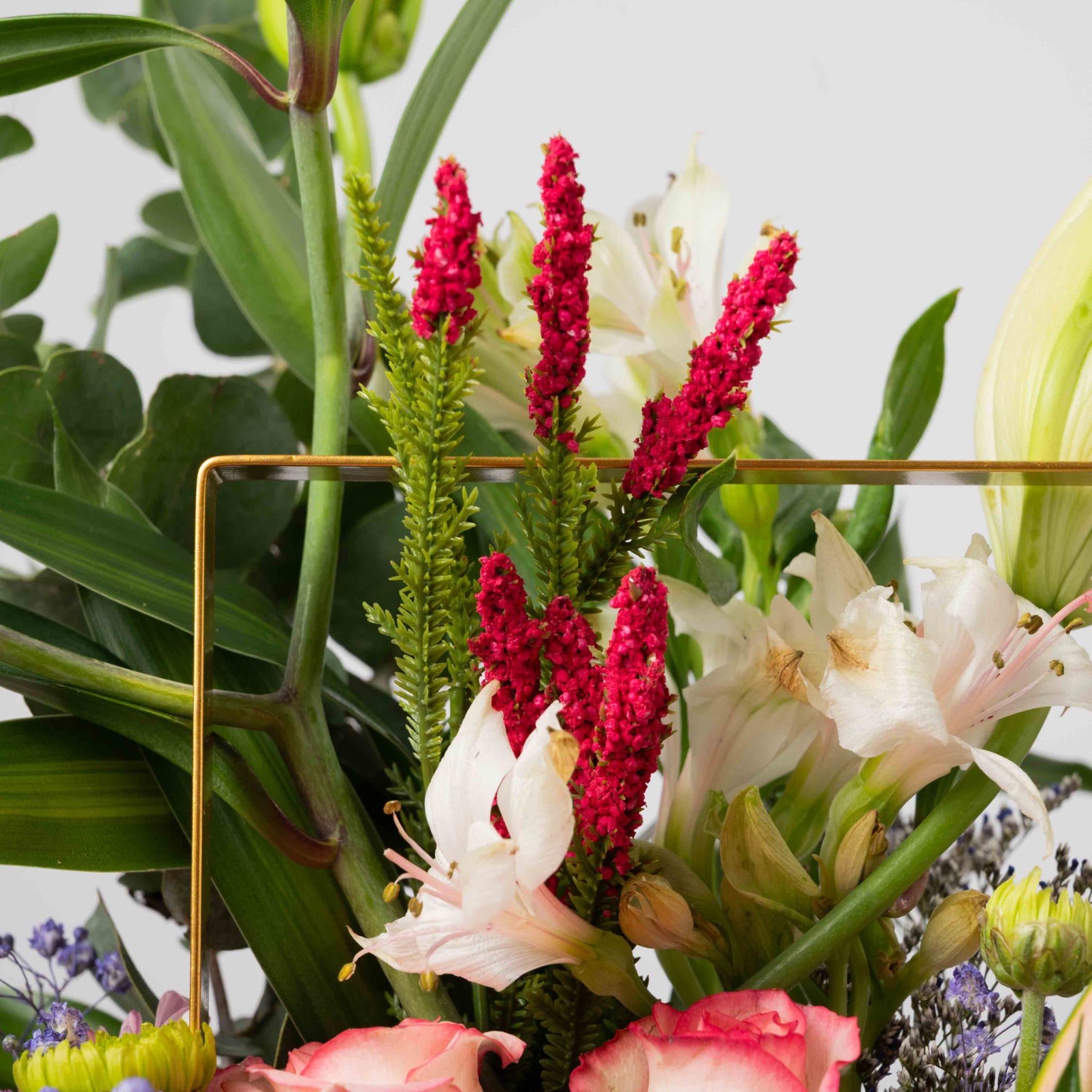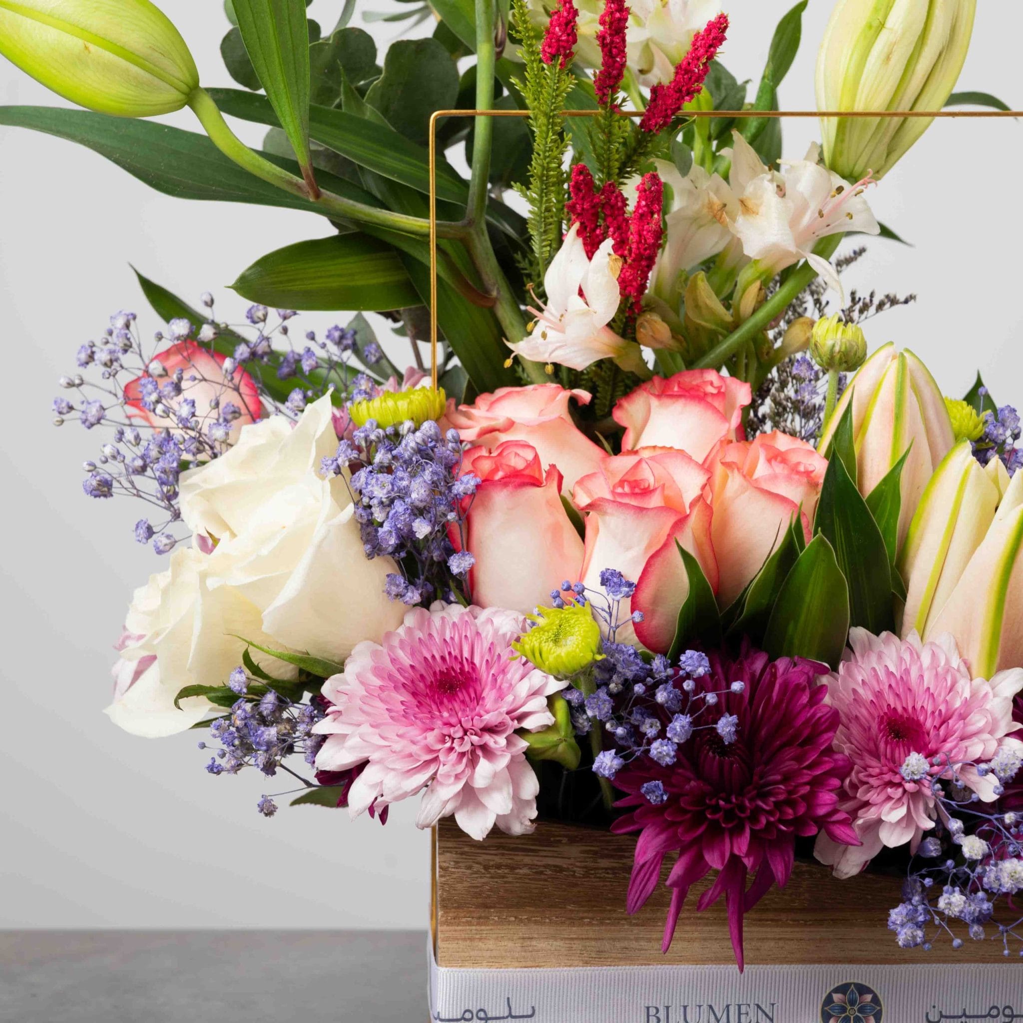 تنسيق أنيق يجمع بين الورود الوردية، والزنابق البيضاء، والأقحوان، وأوراق الزينة الخضراء داخل صندوق مستطيل من بلومن مزين بإطار ذهبي أنيق.