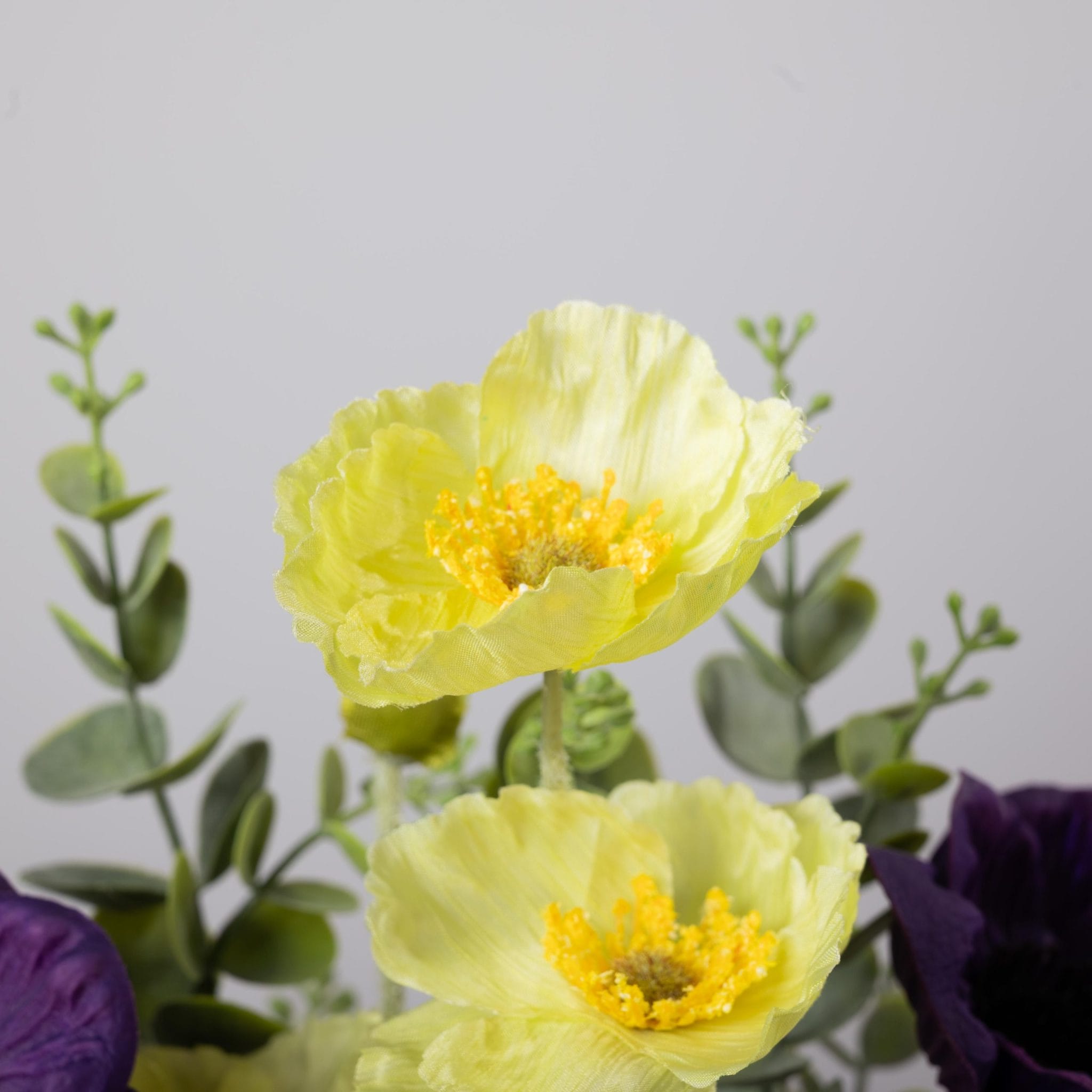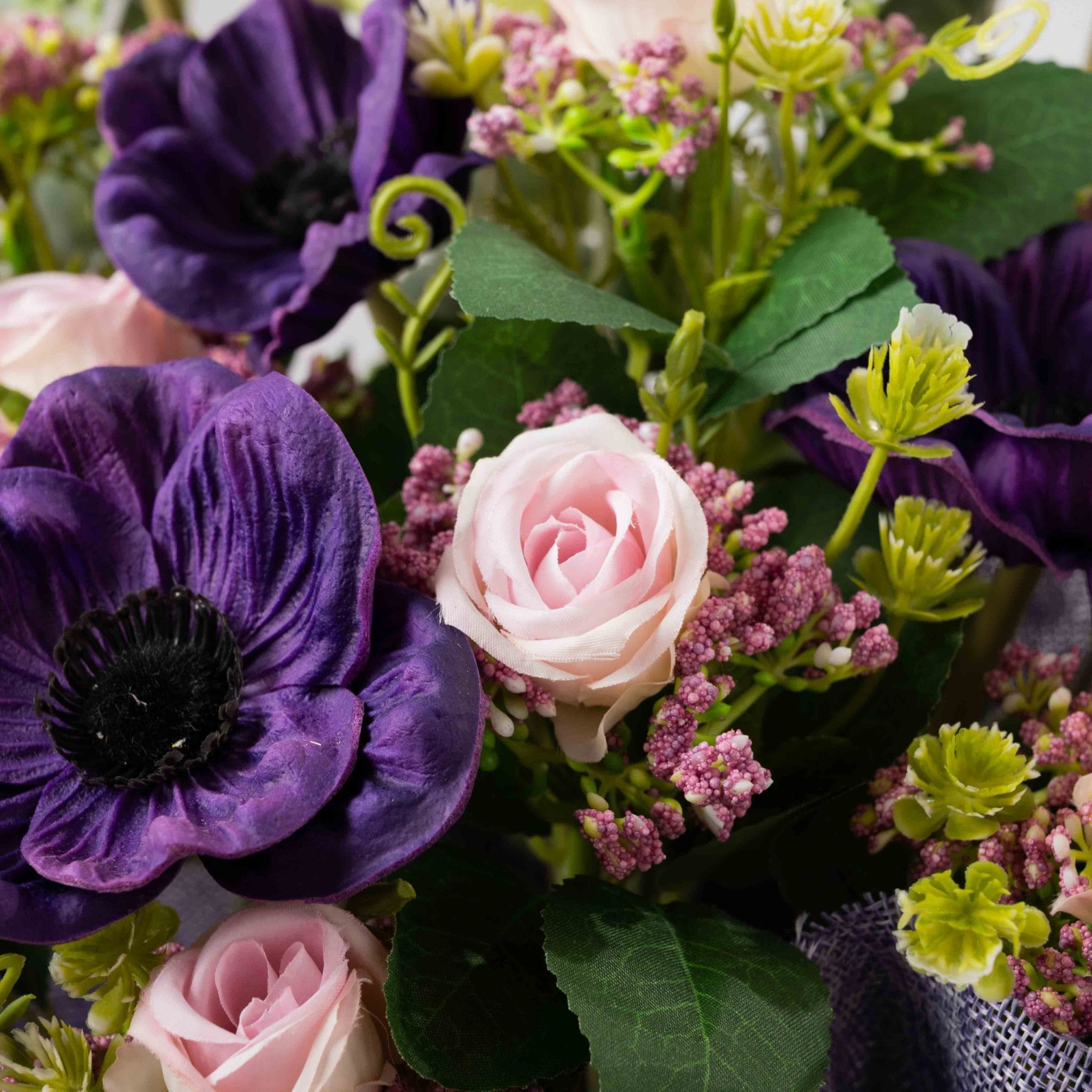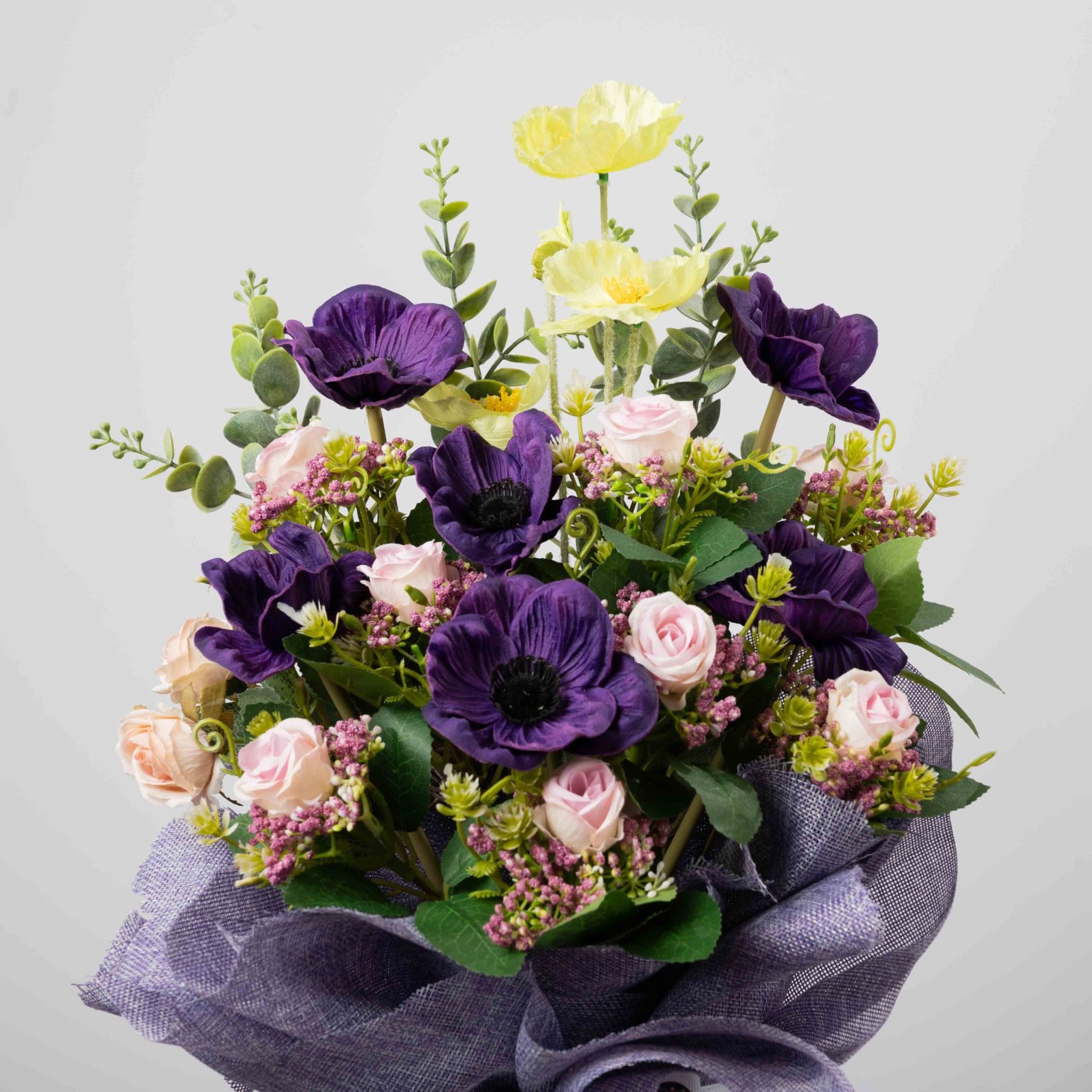 باقة راقية من شقائق النعمان البنفسجية المخملية، والورود الوردية، ولمسات صفراء ناعمة مغلفة بـ قماش بنفسجي أنيق ومربوطة بشريط بلومن الفاخر.