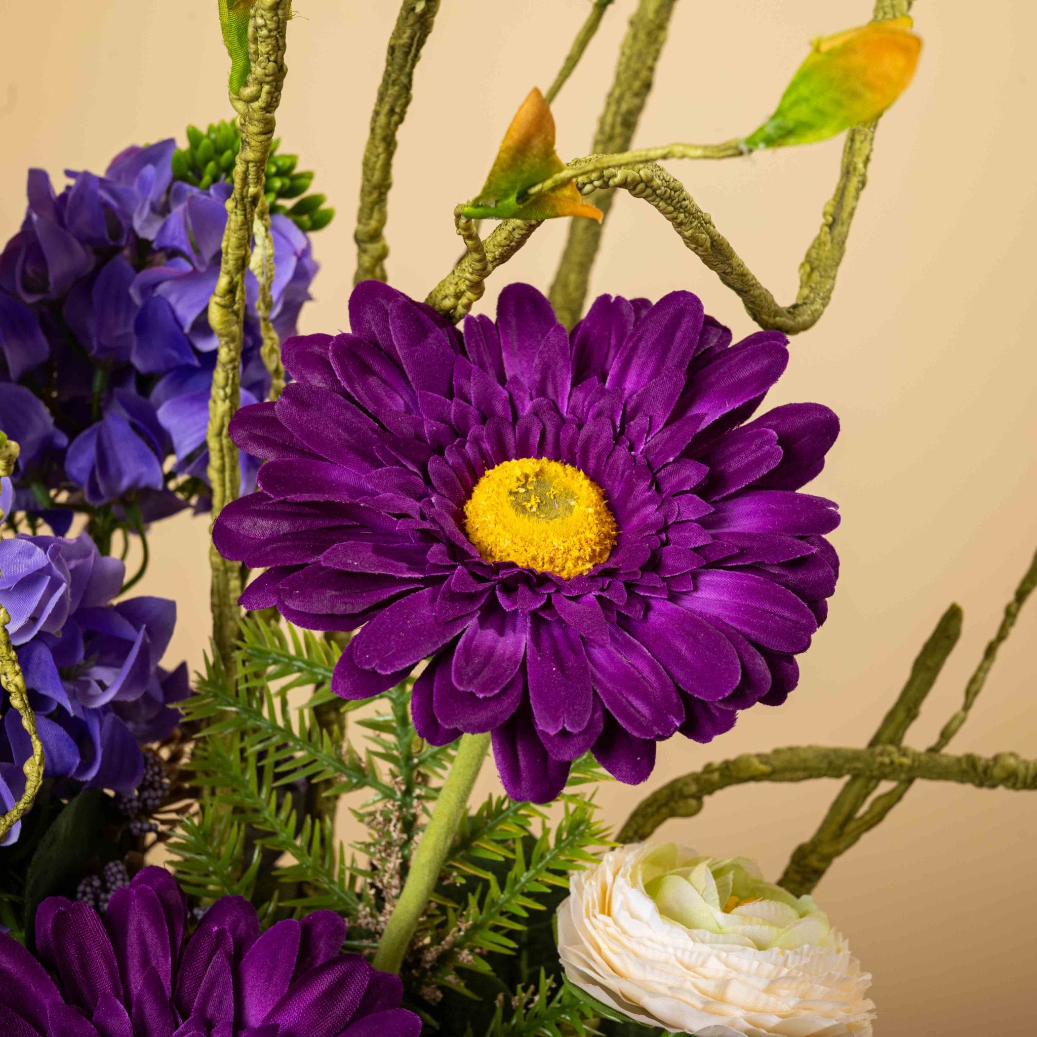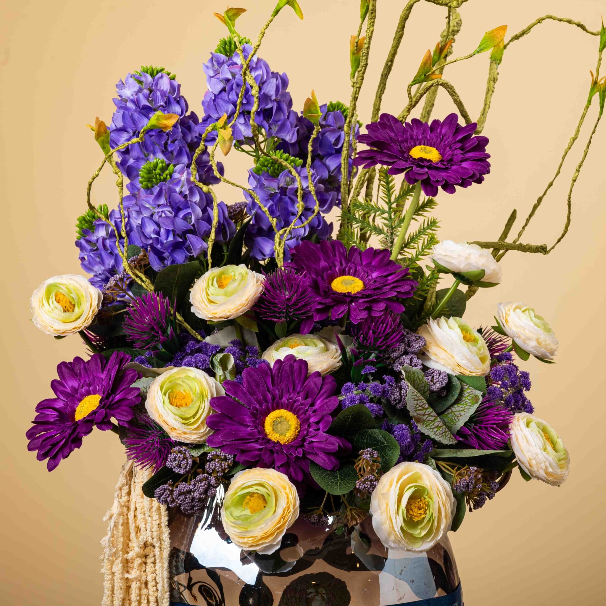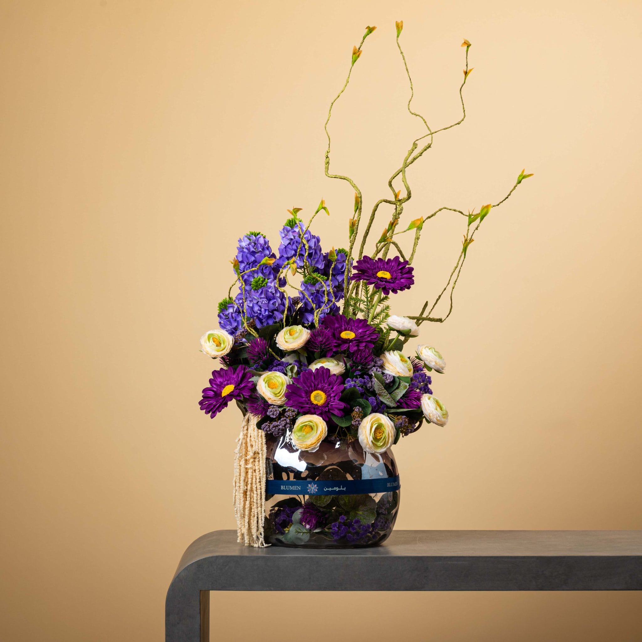 من تشكيلة الصيف 2025، يقدّم هذا التنسيق لمسة راقية تجمع بين التباين والارتفاع لخلق قطعة مركزية هادئة لكن لافتة. تتناغم الأزهار الأرجوانية الداكنة مع الأزهار الكريمية الناعمة داخل مزهرية زجاجية مستديرة، مدعومة بخضار غني وتفاصيل متدلّية تضيف عمقًا بصريًا. ترتفع فوقها فروع ملتوية مجسّمة تمنح التنسيق حركةً وشكلًا فنيًا مميزًا. مثالي لغرف المعيشة، ردهات الفنادق، والاستقبالات الرسمية، إذ يضفي إحساسًا أنيقًا يشبه أمسيات الشتاء الهادئة.