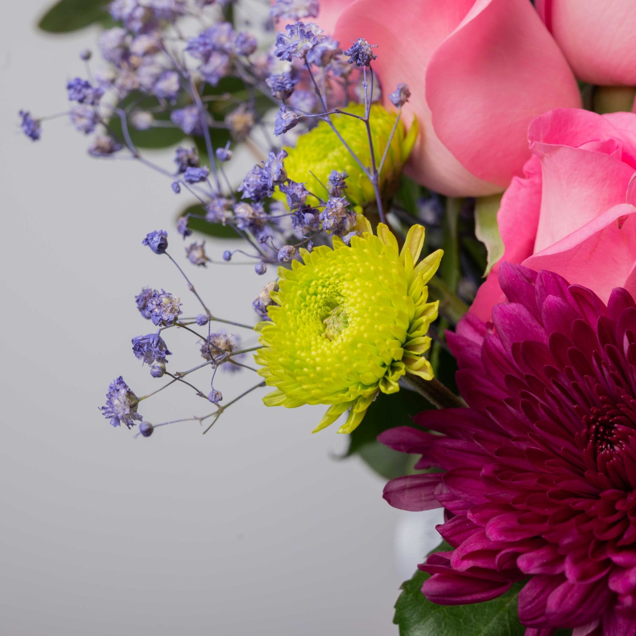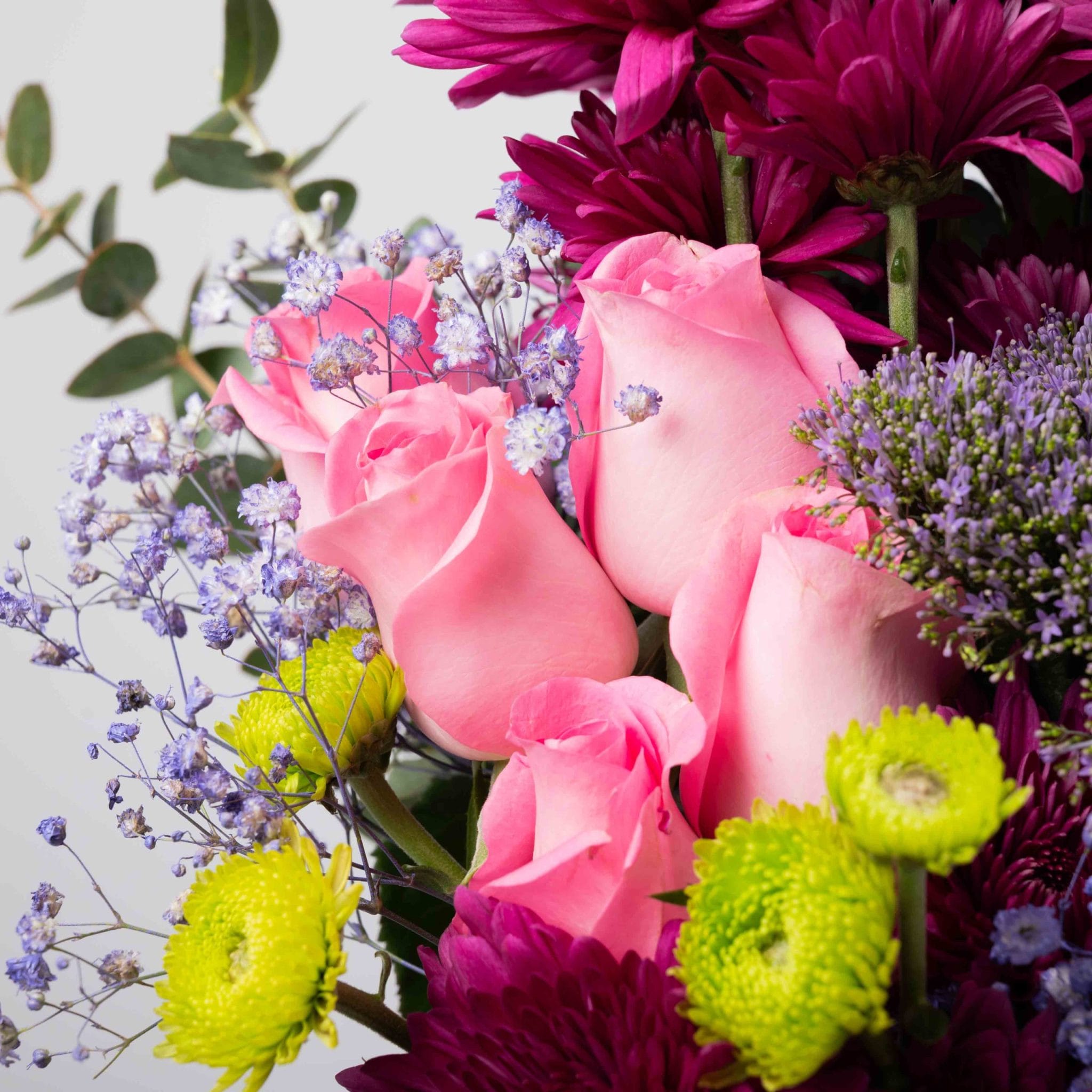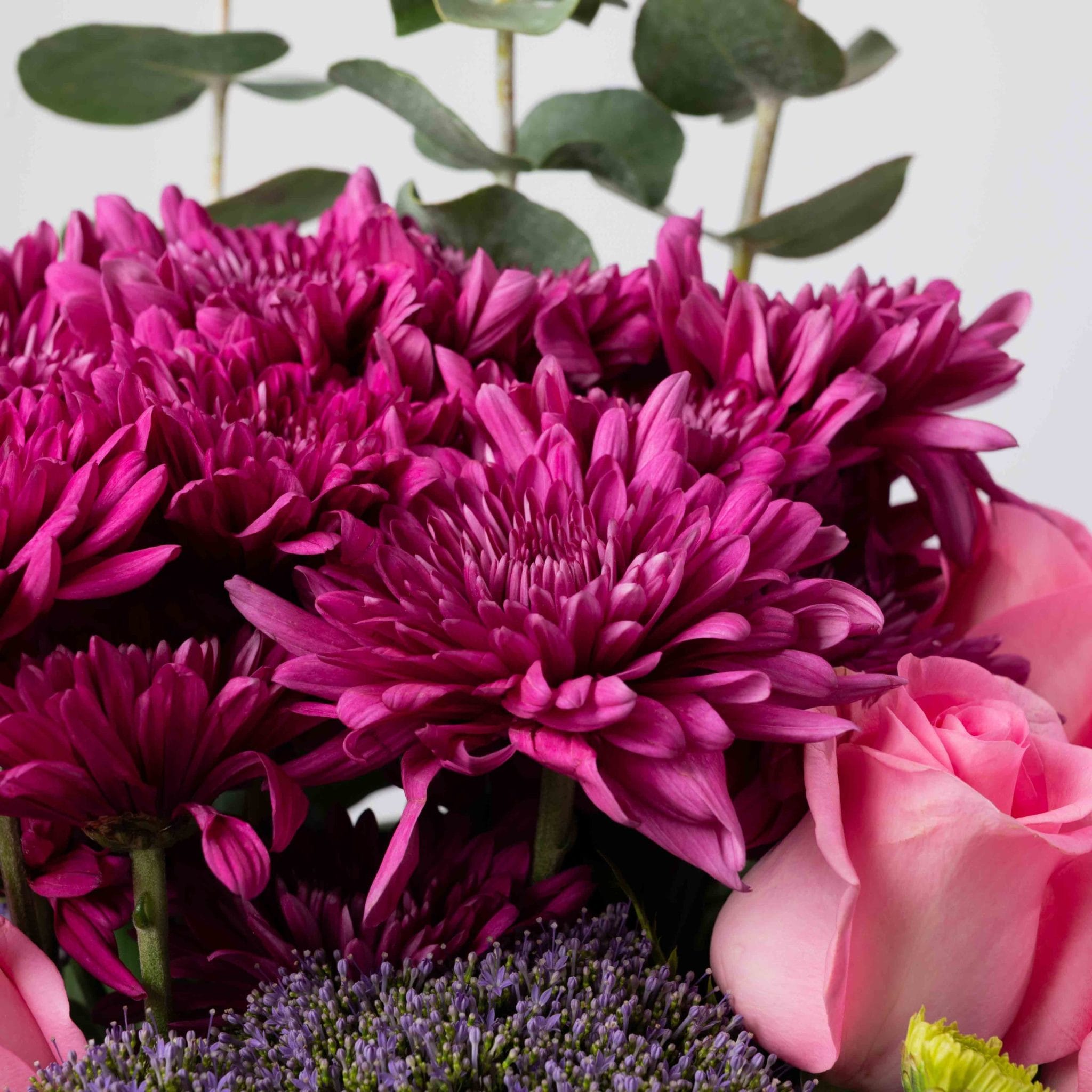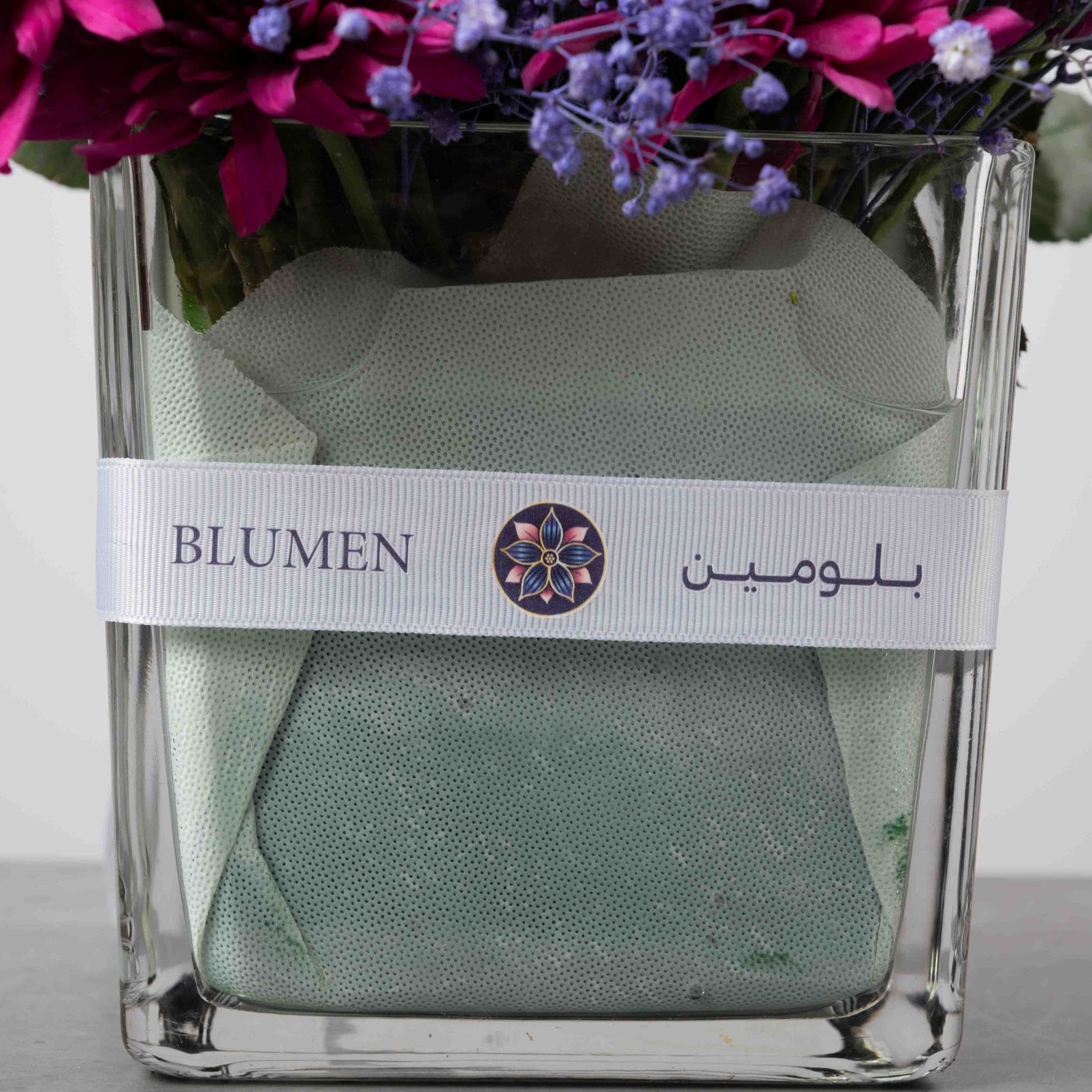 تنسيق مفعم بالتعبير يجمع بين أزهار الفوشيا الكريزانتيم، والورود الوردية الناعمة، ولمسات بنفسجية أنيقة، داخل فازة زجاجية شفافة بشريط بلومن المميز.